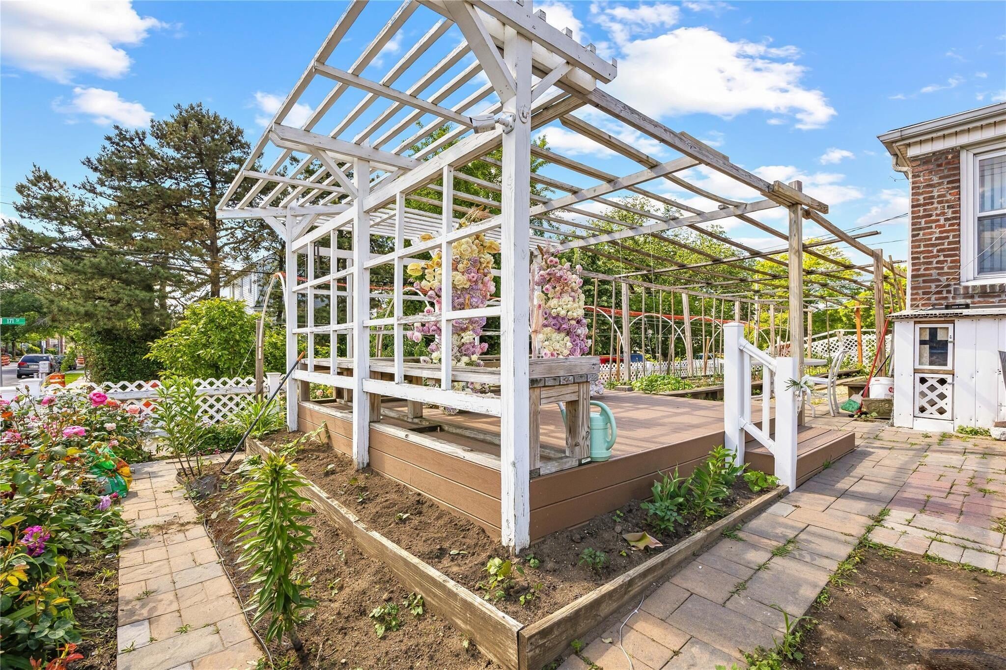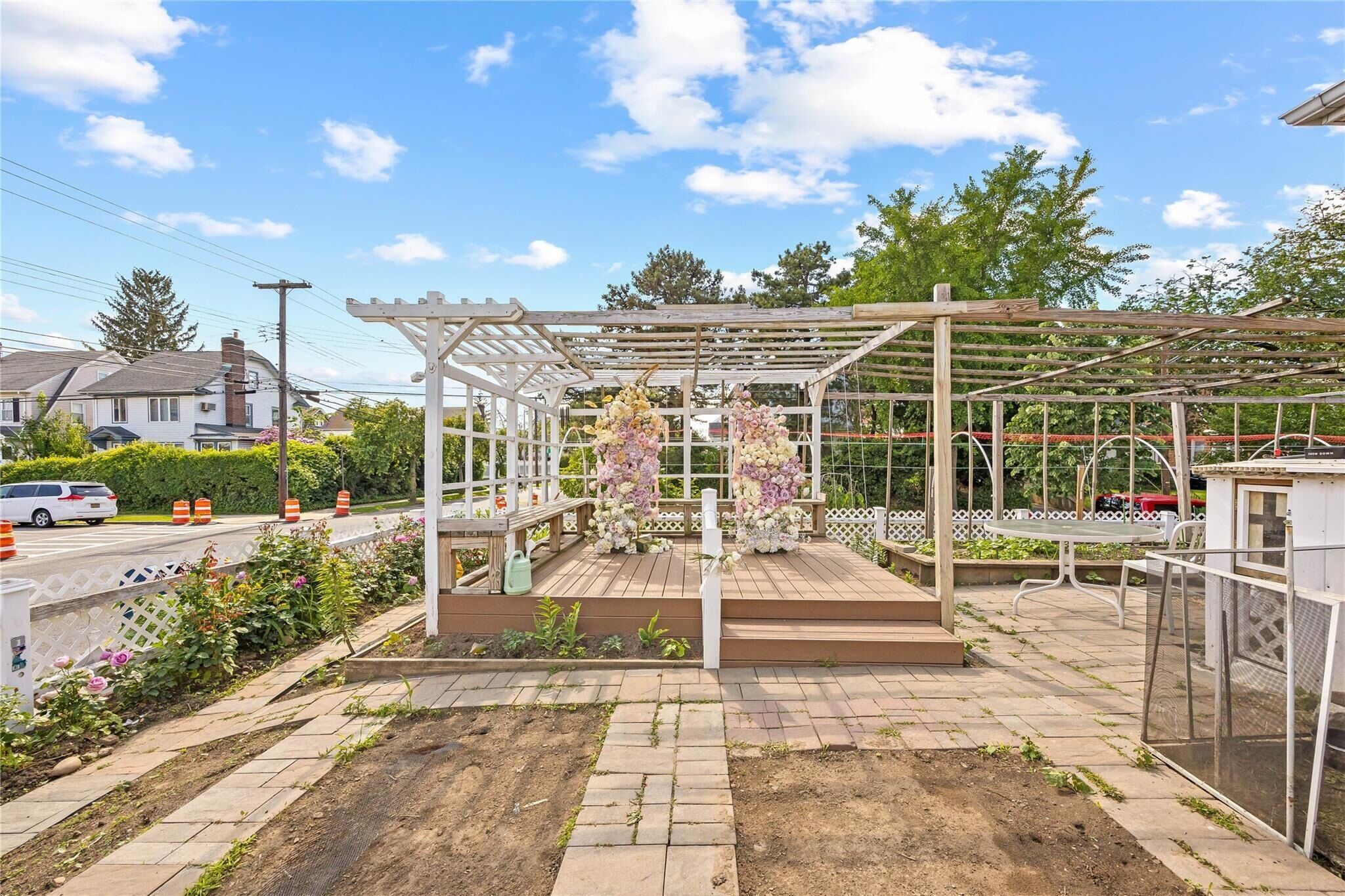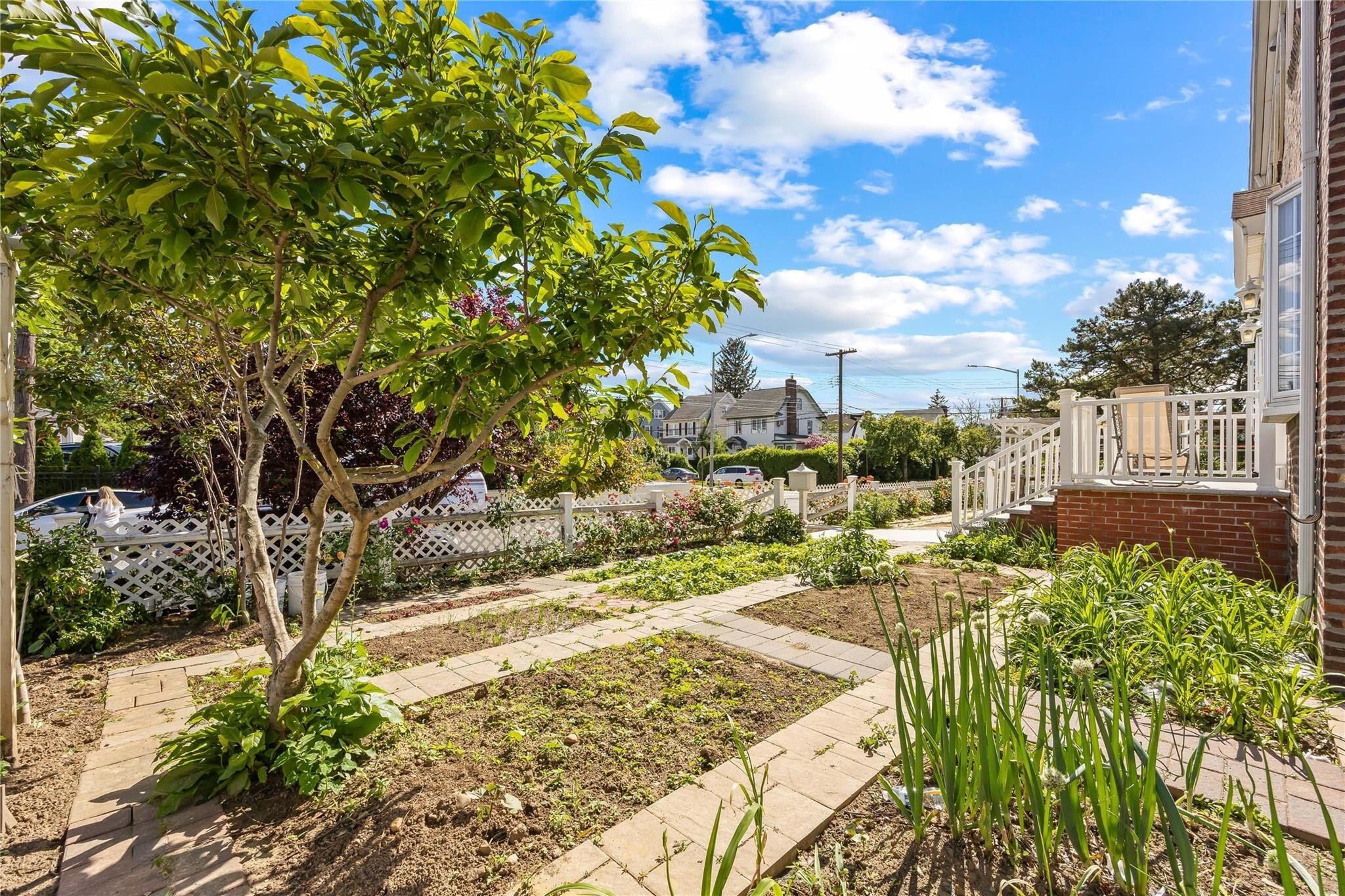 Outside, the beautifully landscaped front yard is fully fenced and includes a secret hideaway patio, ideal for intimate outdoor gatherings. The variety of plants and flowers that bloom throughout the spring and summer create a peaceful, private retreat. The oversized, detached two-car garage also provides additional space for parking.