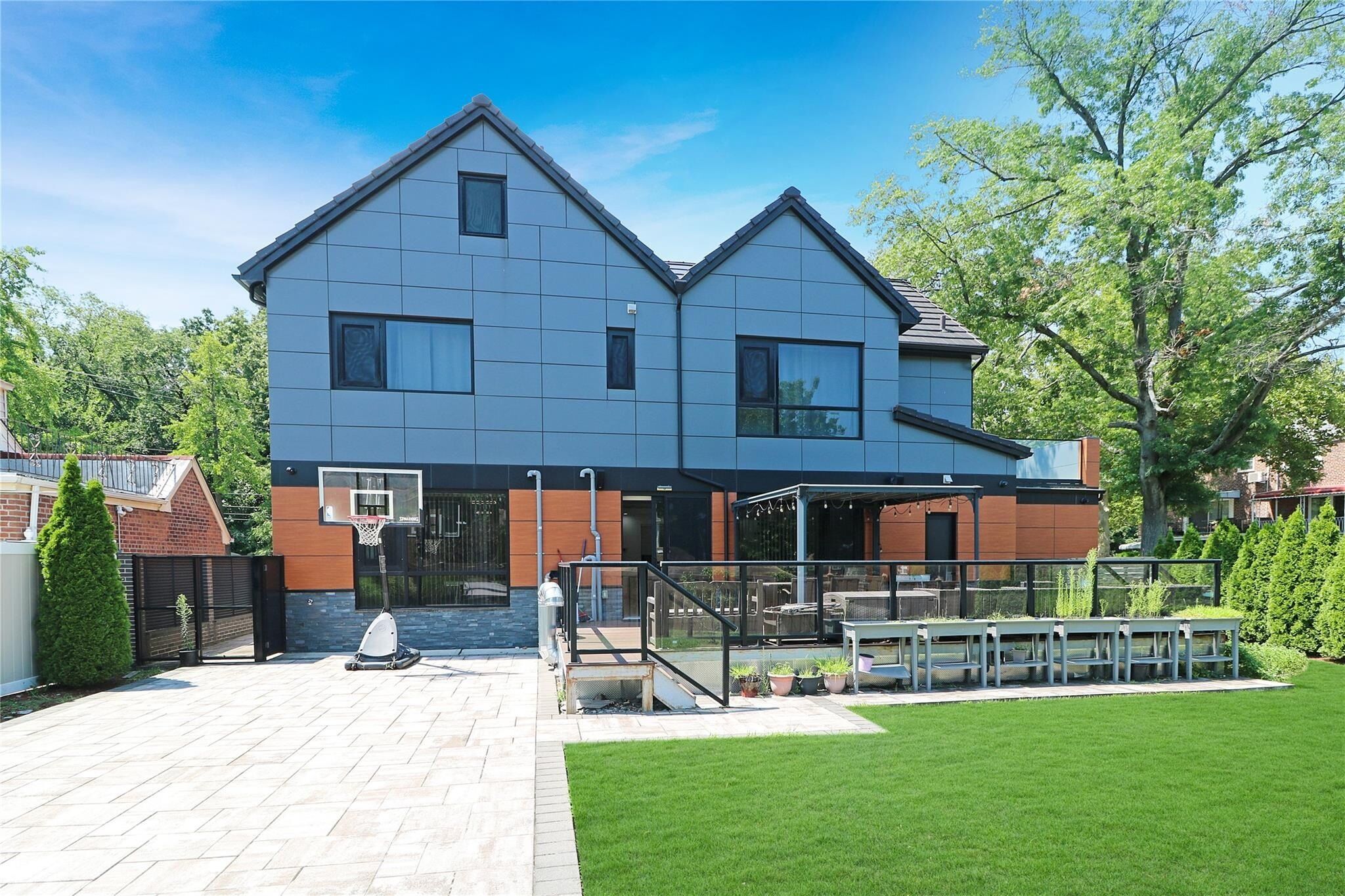 Welcome to this stunning new luxury home in the heart of Fresh Meadows. Built in 2018, this detached aluminum residence boasts a ceramic tile roof and thoughtful design throughout. The home offers five bedrooms and five and a half bathrooms, including a master suite on the second floor with a private balcony and a walk-in closet. The open-concept kitchen is equipped with high-end appliances, including a Miele built-in coffee maker, Miele speed oven, Miele convection oven, and a Bosch dishwasher. Custom cabinetry and a gas cooking range elevate the space for both everyday use and entertaining. The fully finished basement features impressive ceiling height, a gym, karaoke room, and a laundry area with two washers and one dryer. The main level also offers high ceilings, enhancing the home's spacious and airy feel. Perfectly situated across from Kissena Golf Course, this property sits on a large lot just three blocks from Francis Lewis High School.