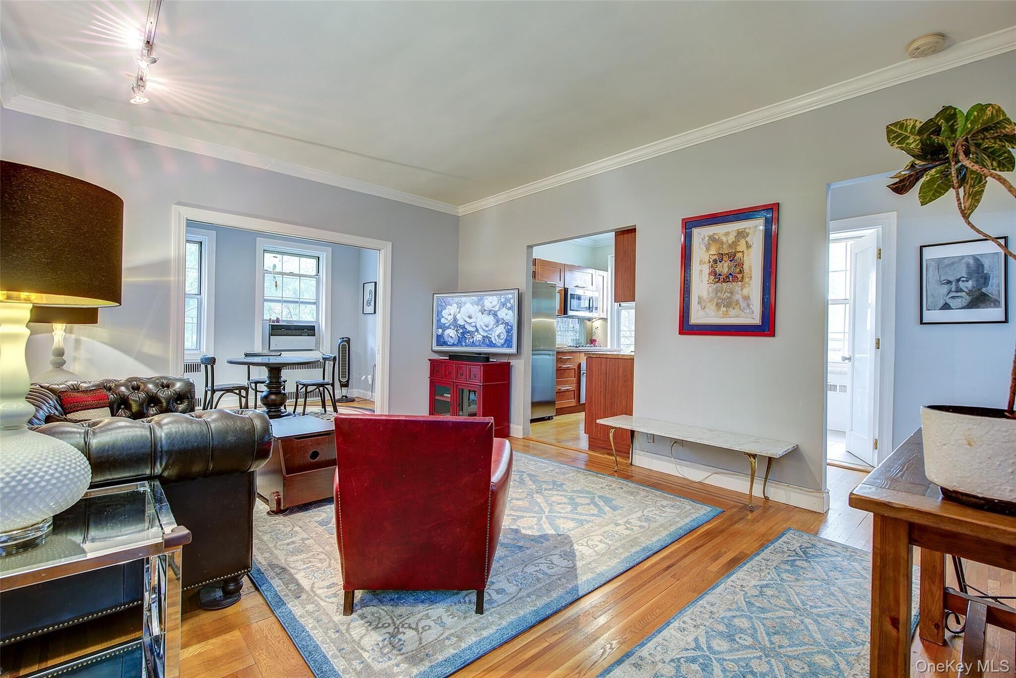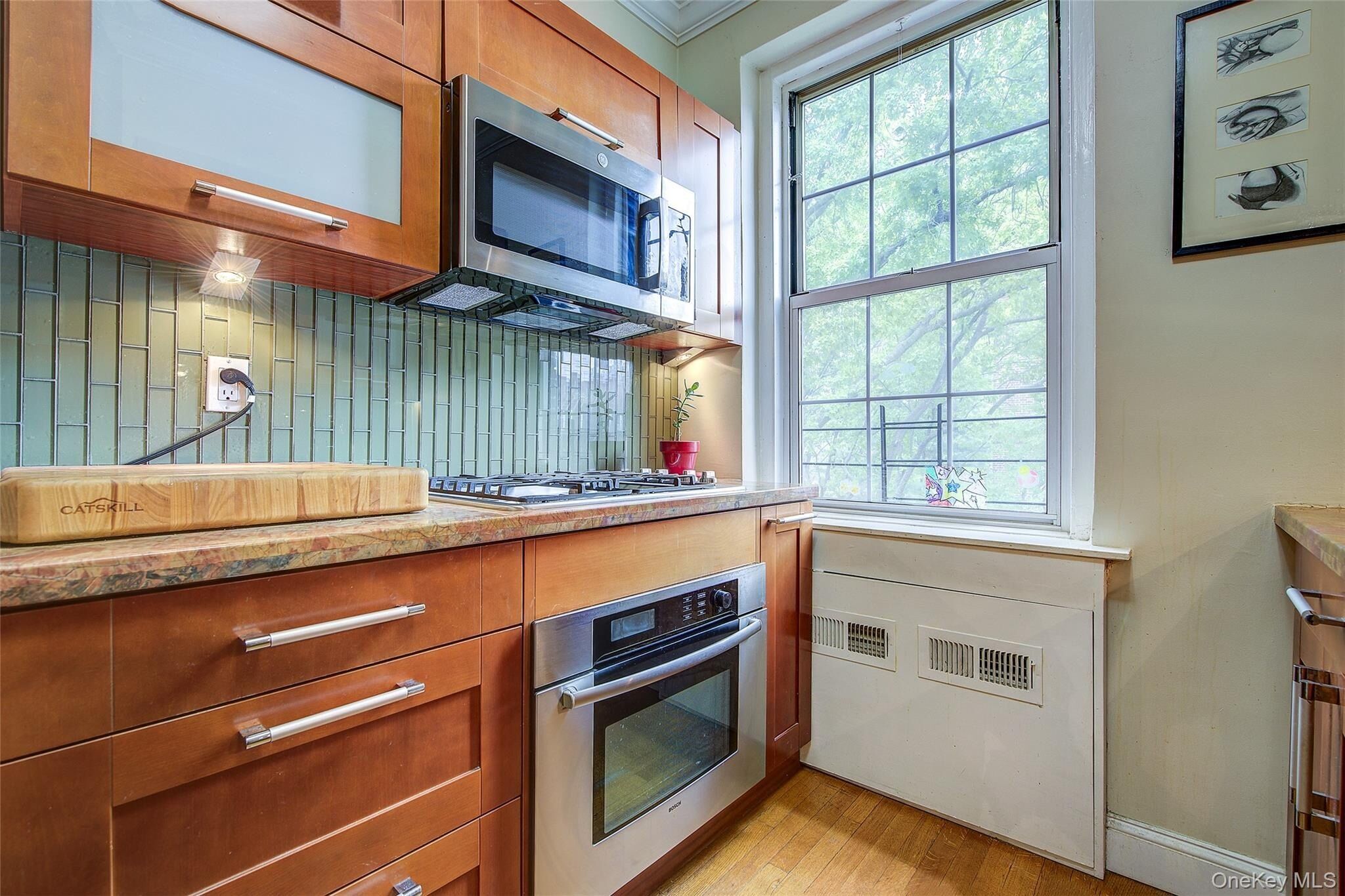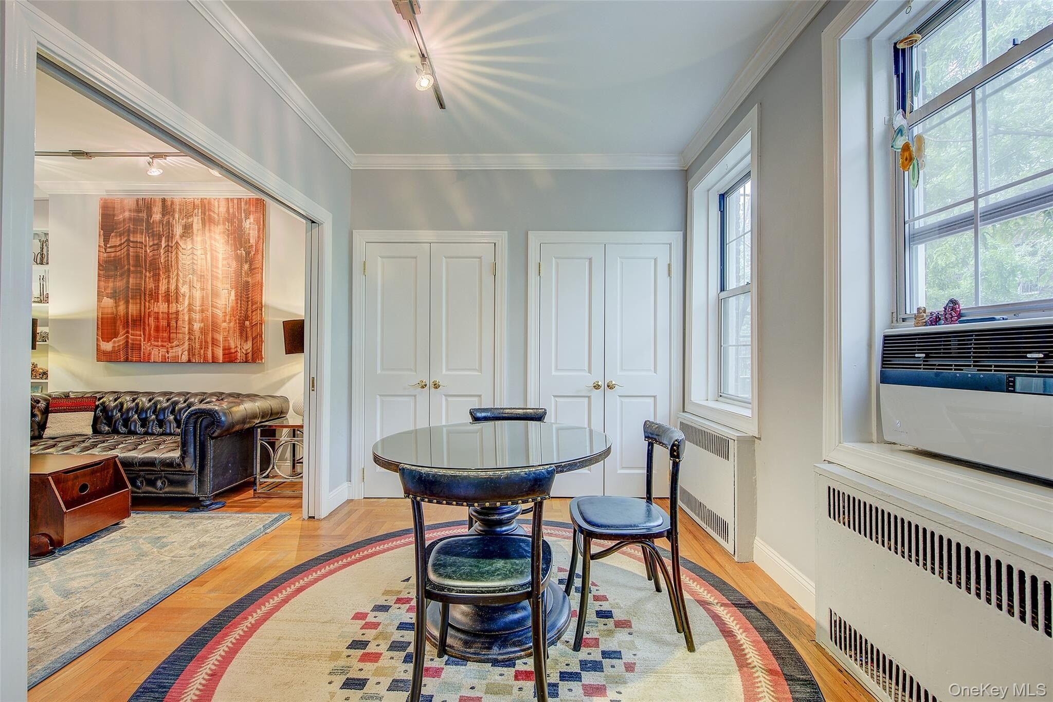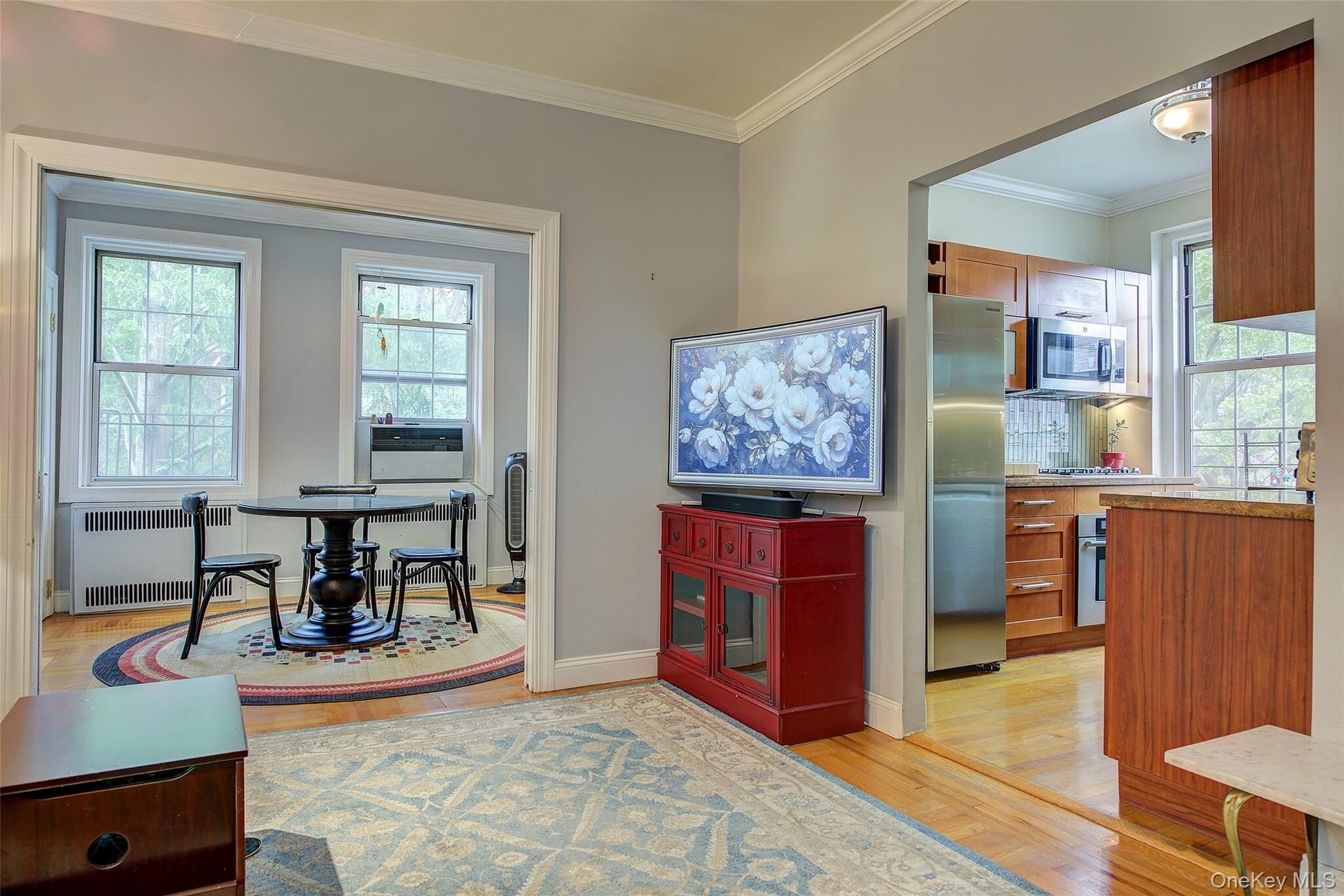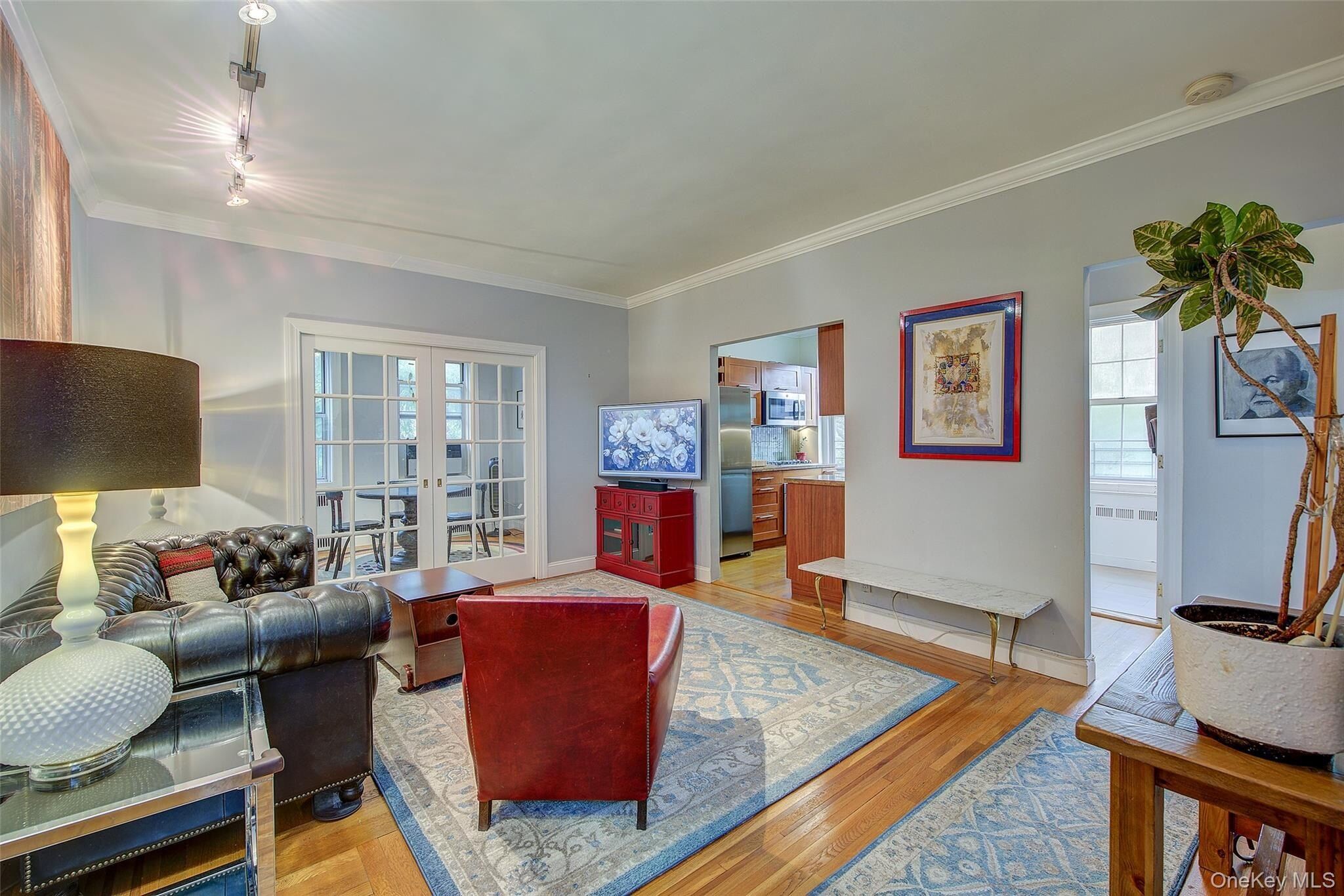 Open house for 8/15/2025 is cancelled. Beautifully reimagined top-floor corner residence in the classic Hampton Court! This thoughtfully updated apartment blends timeless pre-war charm with modern luxury. Highlights include refinished original hardwood floors, elegant French doors throughout, skim-coated walls, and a contemporary kitchen featuring stainless steel appliances, marble countertops, custom cabinetry, and a sleek glass backsplash. The large, windowed bathroom has beautiful marble tiling and modern fixtures. The layout was professionally redesigned to create an open living and dining space ideal for entertaining. The modern kitchen flows into the living room, which is elegantly separated from the formal dining area by custom French pocket doors. The airy primary bedroom is peacefully tucked away from the main living space for optimal privacy. It boasts a generous walk-in closet with a specially designed 11-shelf shoe rack (holding approximately 50 pairs), a pocketbook organizer, and dedicated luggage storage. Expansive Georgian-style windows fill the home with natural light and offer captivating views of Forest Park and the serene courtyard. The second bedroom/Jr. 4 (9' x 9') is bright and versatile, with two windows and its own heater: perfect as a guest room, child’s room, or home office. Additional features include high ceilings, distinctive moldings, and oversized windows that embody the building’s classic character. This home delivers a rare balance of functionality, elegance, and peaceful comfort. Beyond the apartment’s delightful features, the building itself carries its own historic charm, with an impressive pre-war architecture that stands the test of time. The scenic Hampton Court, which was recently added to the New York State and the National Register of historic places, contains four Georgian style buildings with a total of 316 apartments placed in a large and airy courtyard. Like a calm oasis in the middle of all this bustle the property is known for its well-kept buildings, landscaping design, and round the clock security. Additional amenities are laundry facilities, bicycle storage, storage rooms and live-in super. This pet friendly complex is conveniently located walking distance to the Long Island Rail Road and to the E and F trains. Great restaurants, a charming movie theater, coffee shops, organic stores and small grocery stores are only steps away. Less than 1.5 miles to Trader Joe’s and more restaurant options on Metropolitan Avenue. Built on the grounds of Forest Park you can just step out and walk into one of the biggest parks in Queens with hiking, jogging, biking trails, horse rides, playgrounds, and a golf course.