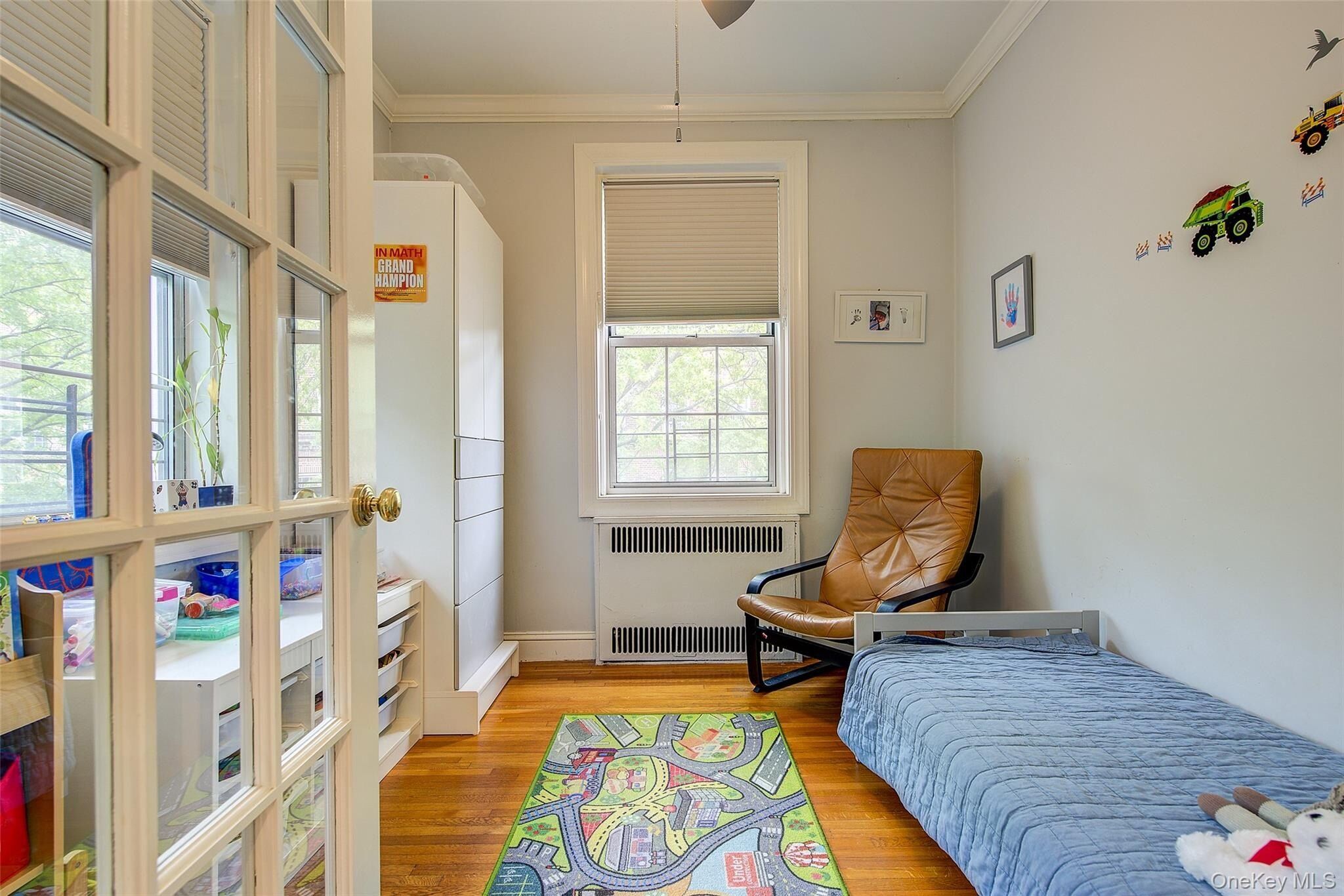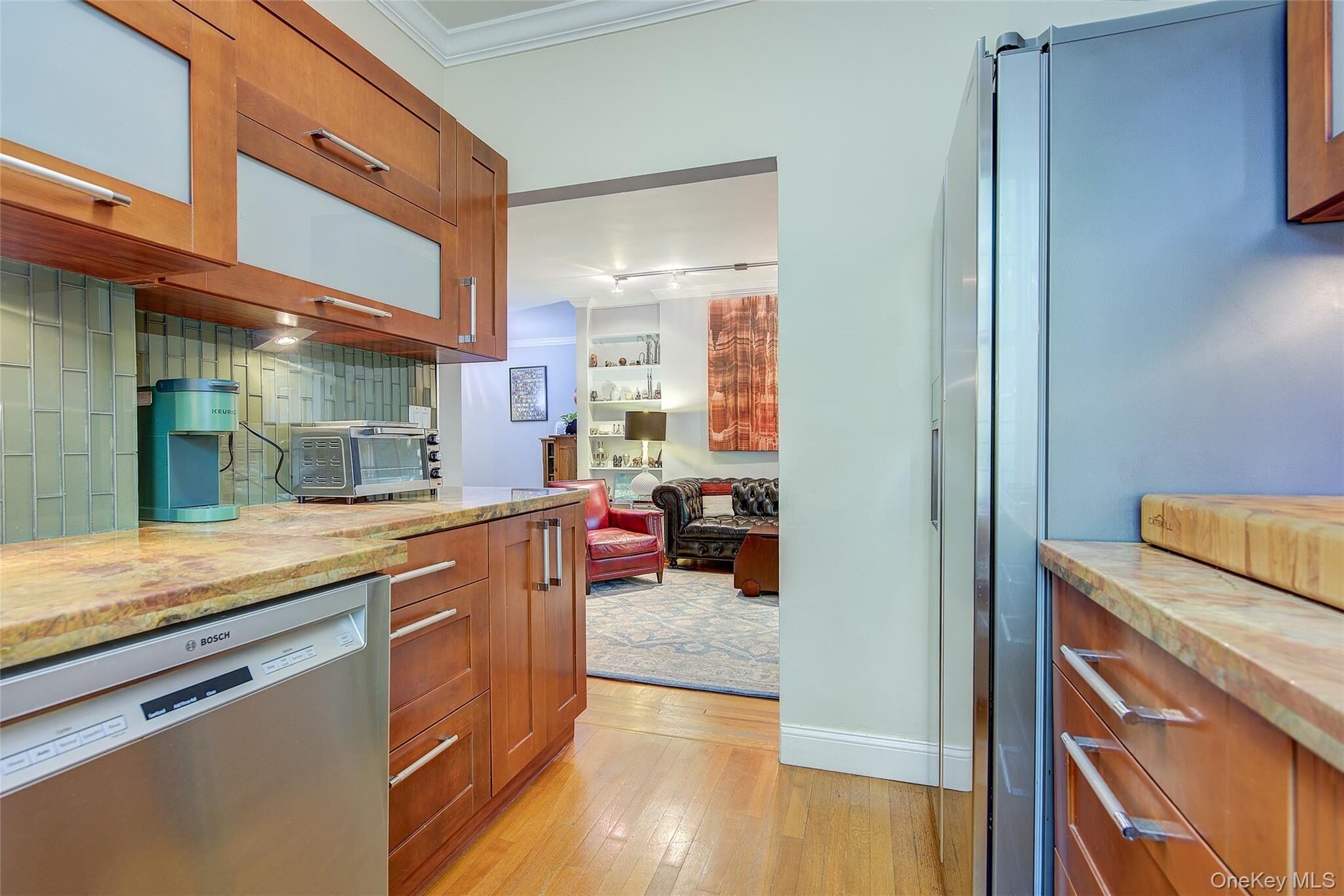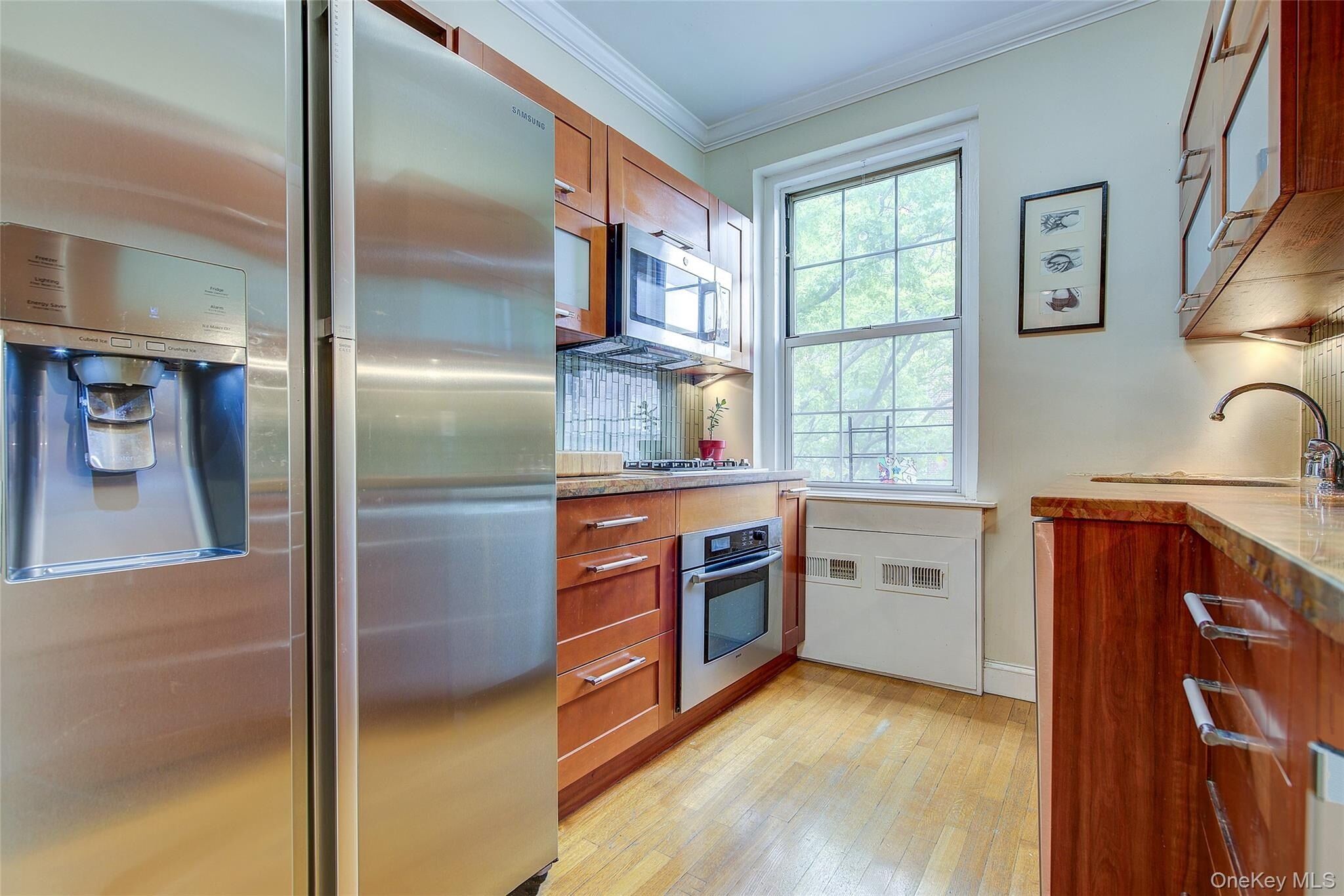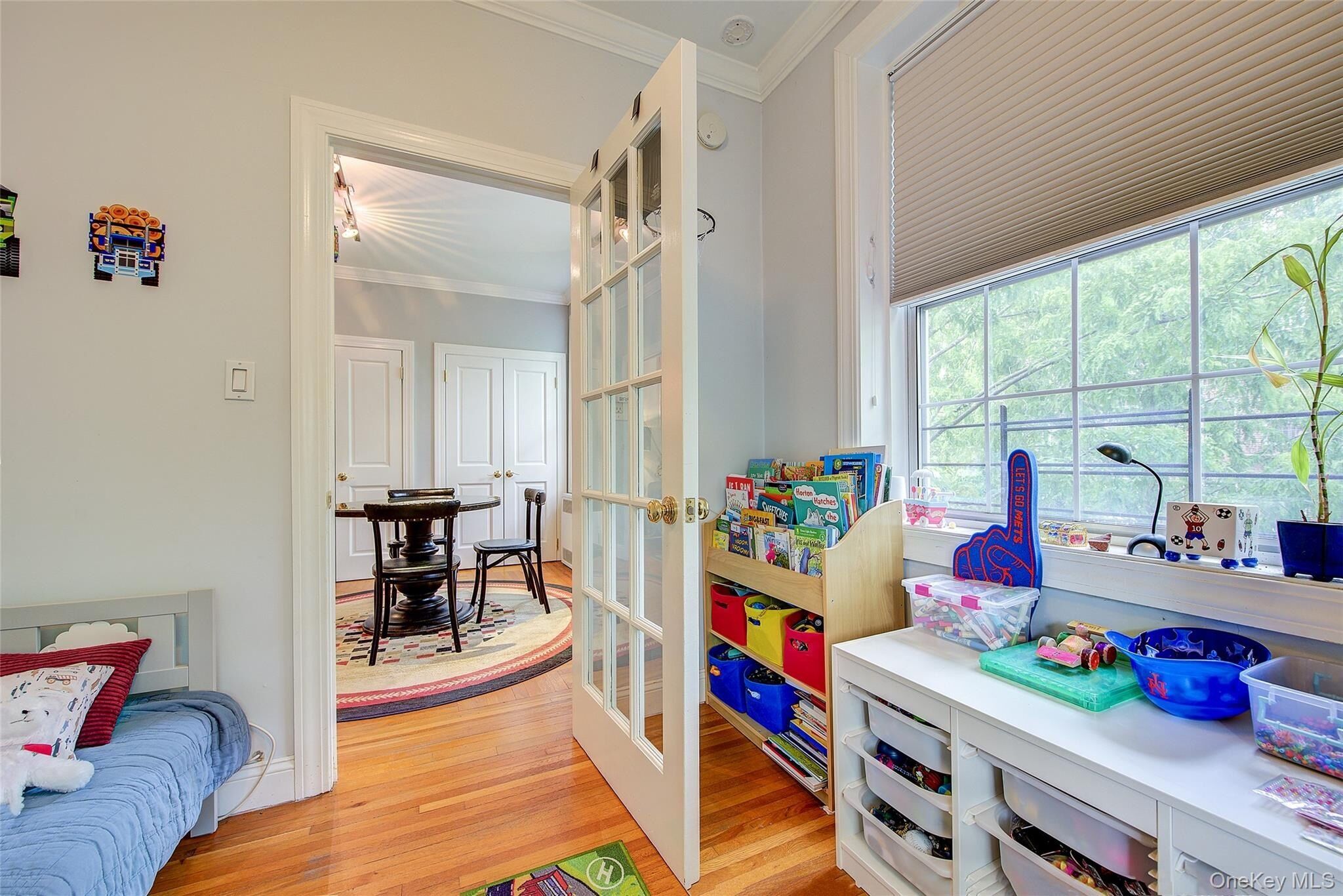 Open house for 8/15/2025 is cancelled. Beautifully reimagined top-floor corner residence in the classic Hampton Court! This thoughtfully updated apartment blends timeless pre-war charm with modern luxury. Highlights include refinished original hardwood floors, elegant French doors throughout, skim-coated walls, and a contemporary kitchen featuring stainless steel appliances, marble countertops, custom cabinetry, and a sleek glass backsplash. The large, windowed bathroom has beautiful marble tiling and modern fixtures. The layout was professionally redesigned to create an open living and dining space ideal for entertaining. The modern kitchen flows into the living room, which is elegantly separated from the formal dining area by custom French pocket doors. The airy primary bedroom is peacefully tucked away from the main living space for optimal privacy. It boasts a generous walk-in closet with a specially designed 11-shelf shoe rack (holding approximately 50 pairs), a pocketbook organizer, and dedicated luggage storage. Expansive Georgian-style windows fill the home with natural light and offer captivating views of Forest Park and the serene courtyard. The second bedroom/Jr. 4 (9' x 9') is bright and versatile, with two windows and its own heater: perfect as a guest room, child’s room, or home office. Additional features include high ceilings, distinctive moldings, and oversized windows that embody the building’s classic character. This home delivers a rare balance of functionality, elegance, and peaceful comfort. Beyond the apartment’s delightful features, the building itself carries its own historic charm, with an impressive pre-war architecture that stands the test of time. The scenic Hampton Court, which was recently added to the New York State and the National Register of historic places, contains four Georgian style buildings with a total of 316 apartments placed in a large and airy courtyard. Like a calm oasis in the middle of all this bustle the property is known for its well-kept buildings, landscaping design, and round the clock security. Additional amenities are laundry facilities, bicycle storage, storage rooms and live-in super. This pet friendly complex is conveniently located walking distance to the Long Island Rail Road and to the E and F trains. Great restaurants, a charming movie theater, coffee shops, organic stores and small grocery stores are only steps away. Less than 1.5 miles to Trader Joe’s and more restaurant options on Metropolitan Avenue. Built on the grounds of Forest Park you can just step out and walk into one of the biggest parks in Queens with hiking, jogging, biking trails, horse rides, playgrounds, and a golf course.