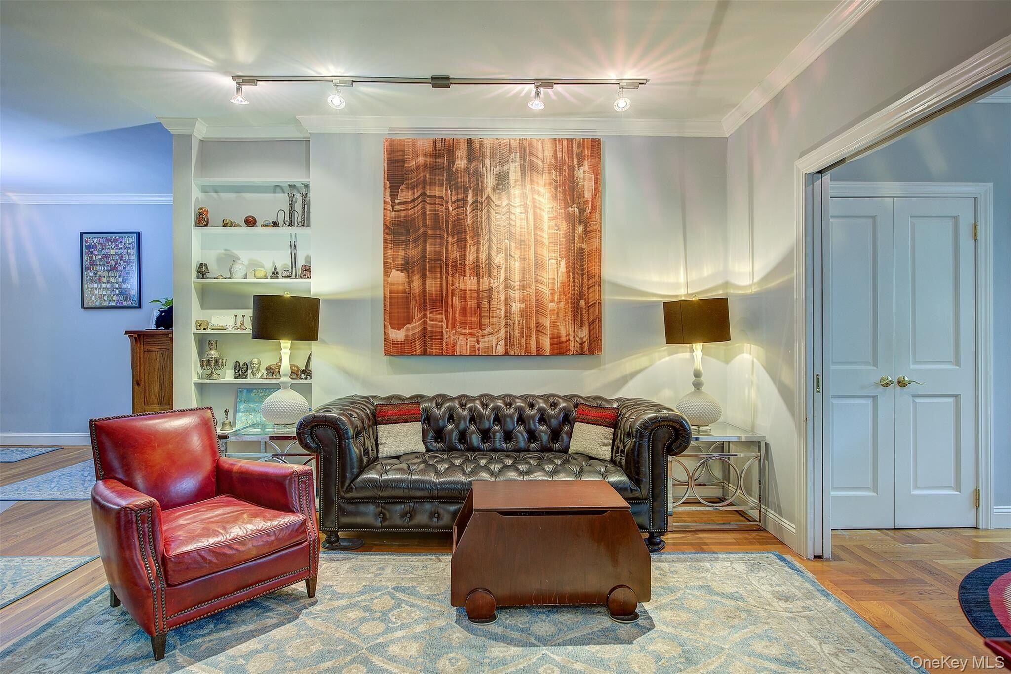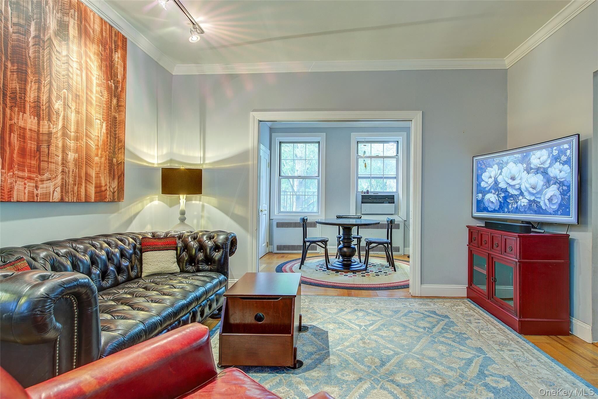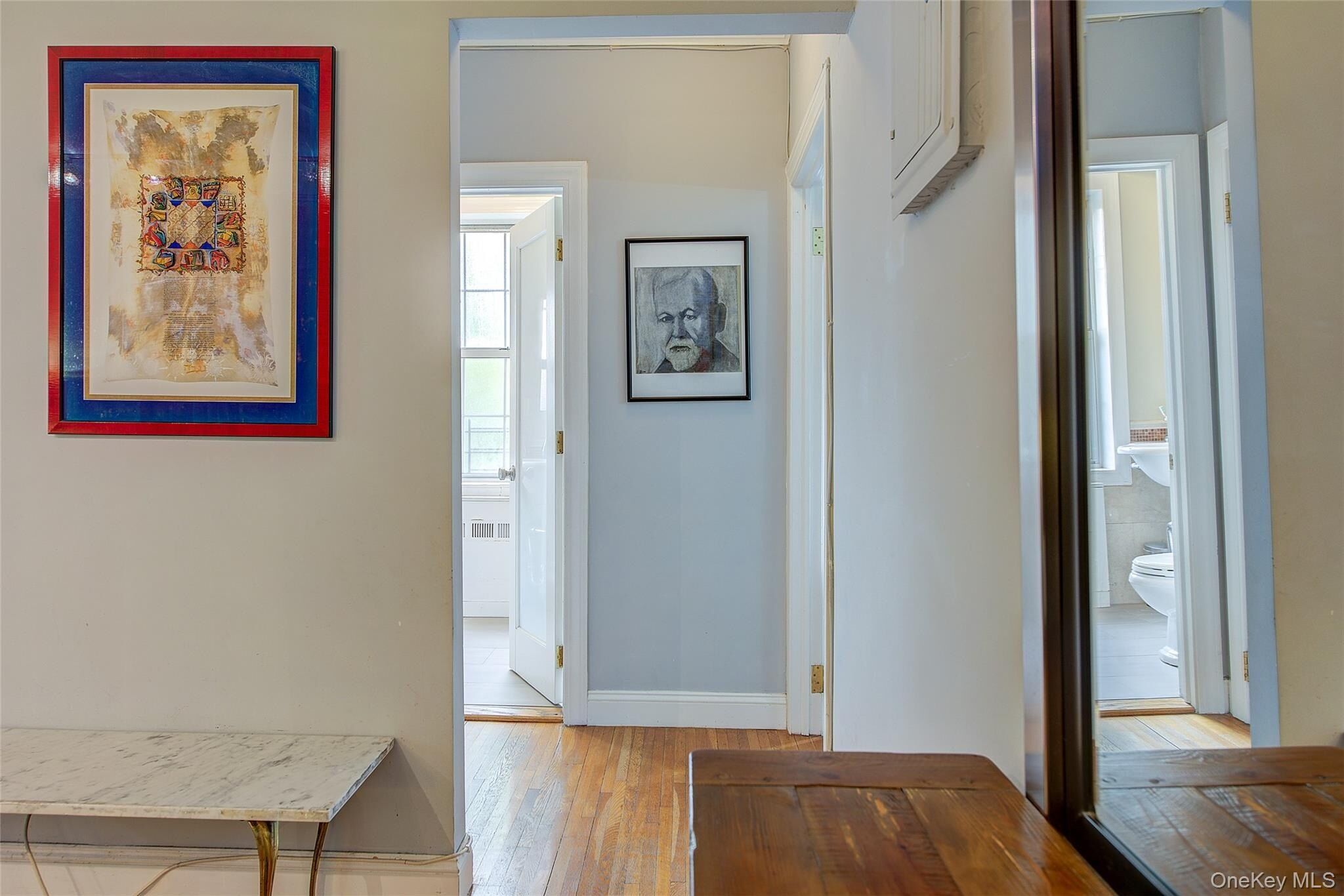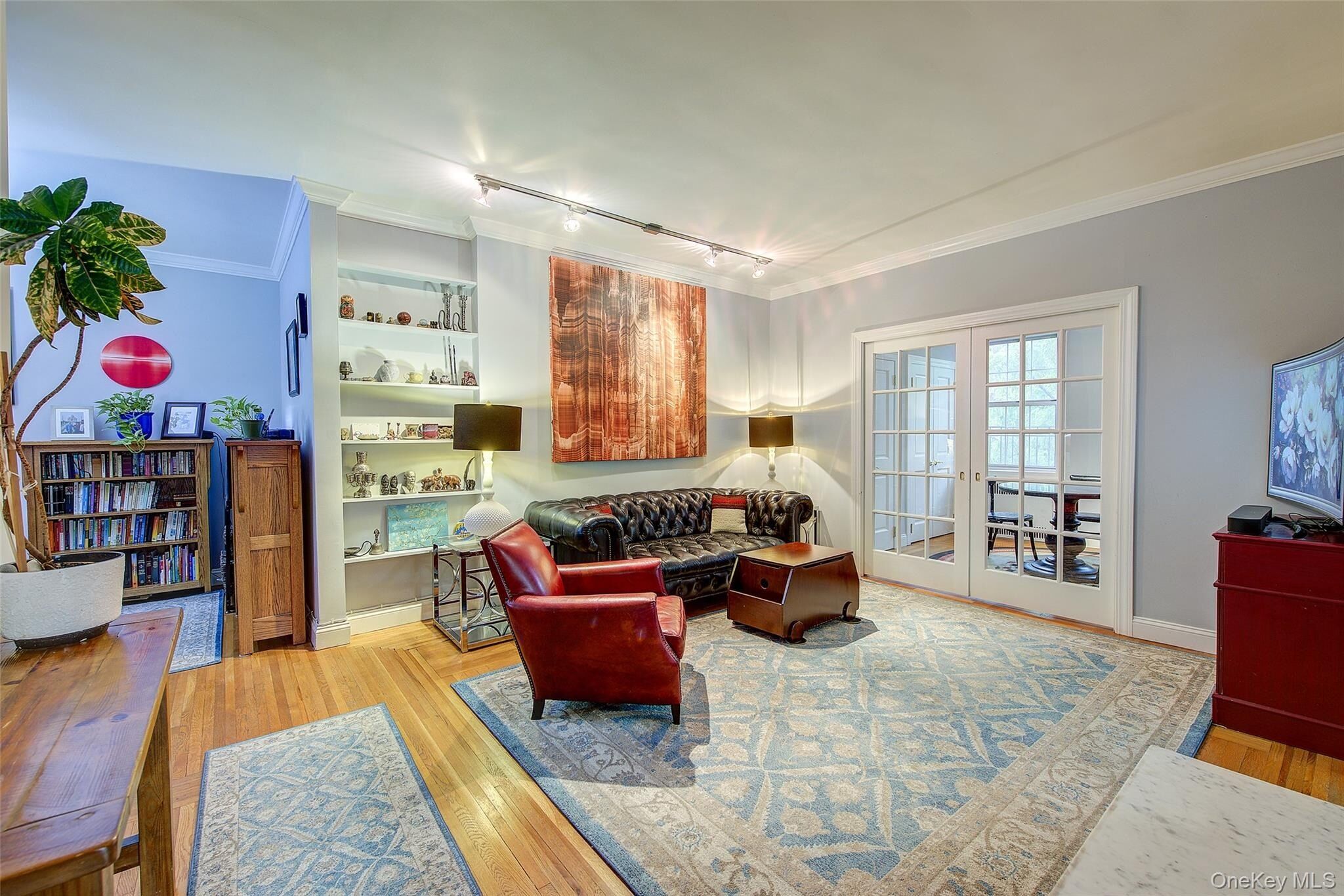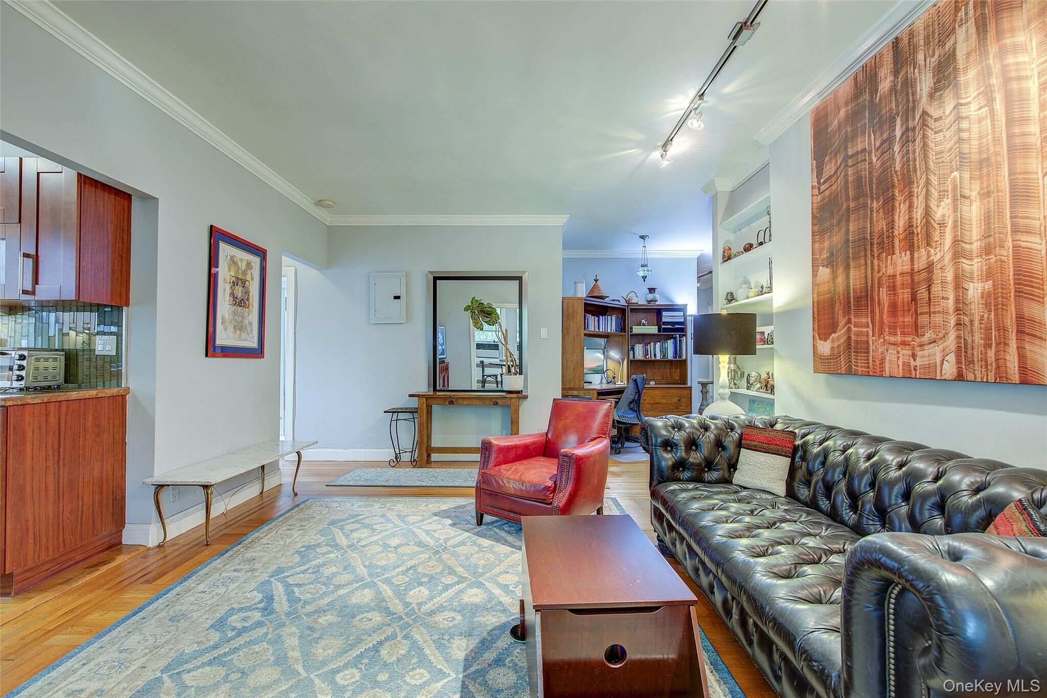 Open house for 8/15/2025 is cancelled. Beautifully reimagined top-floor corner residence in the classic Hampton Court! This thoughtfully updated apartment blends timeless pre-war charm with modern luxury. Highlights include refinished original hardwood floors, elegant French doors throughout, skim-coated walls, and a contemporary kitchen featuring stainless steel appliances, marble countertops, custom cabinetry, and a sleek glass backsplash. The large, windowed bathroom has beautiful marble tiling and modern fixtures. The layout was professionally redesigned to create an open living and dining space ideal for entertaining. The modern kitchen flows into the living room, which is elegantly separated from the formal dining area by custom French pocket doors. The airy primary bedroom is peacefully tucked away from the main living space for optimal privacy. It boasts a generous walk-in closet with a specially designed 11-shelf shoe rack (holding approximately 50 pairs), a pocketbook organizer, and dedicated luggage storage. Expansive Georgian-style windows fill the home with natural light and offer captivating views of Forest Park and the serene courtyard. The second bedroom/Jr. 4 (9' x 9') is bright and versatile, with two windows and its own heater: perfect as a guest room, child’s room, or home office. Additional features include high ceilings, distinctive moldings, and oversized windows that embody the building’s classic character. This home delivers a rare balance of functionality, elegance, and peaceful comfort. Beyond the apartment’s delightful features, the building itself carries its own historic charm, with an impressive pre-war architecture that stands the test of time. The scenic Hampton Court, which was recently added to the New York State and the National Register of historic places, contains four Georgian style buildings with a total of 316 apartments placed in a large and airy courtyard. Like a calm oasis in the middle of all this bustle the property is known for its well-kept buildings, landscaping design, and round the clock security. Additional amenities are laundry facilities, bicycle storage, storage rooms and live-in super. This pet friendly complex is conveniently located walking distance to the Long Island Rail Road and to the E and F trains. Great restaurants, a charming movie theater, coffee shops, organic stores and small grocery stores are only steps away. Less than 1.5 miles to Trader Joe’s and more restaurant options on Metropolitan Avenue. Built on the grounds of Forest Park you can just step out and walk into one of the biggest parks in Queens with hiking, jogging, biking trails, horse rides, playgrounds, and a golf course.