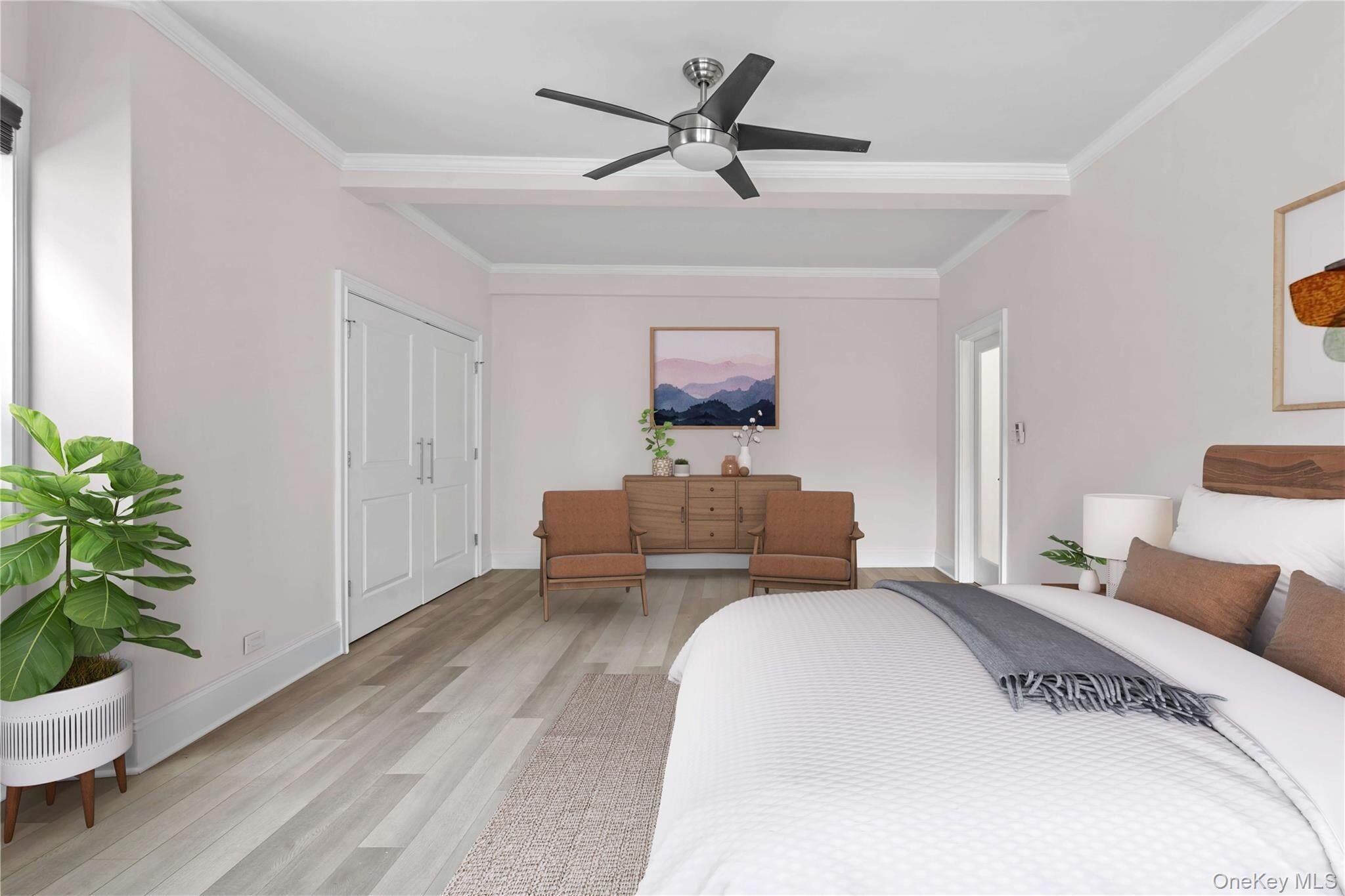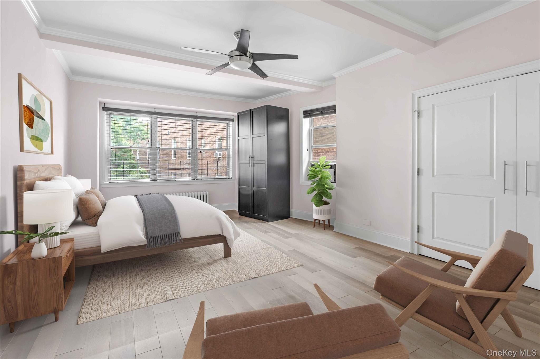 Welcome to this rarely available oversized home at the Holland House! A beautifully renovated 2-bedroom apartment features custom millwork and thoughtful built-ins, including a pantry in the open-concept kitchen, which flows into a spacious living and dining area. The kitchen island features suede Silestone and has plenty of room for seating. A long hallway from the entrance provides privacy. Enjoy new flooring, doors, and a massive walk-in hallway closet. The two generous bedrooms offer double exposure, with one facing the serene building courtyard and the other overlooking Austin Street. The designer bathroom boasts modern fixtures, exquisite tilework, and a separate shower and tub for a spa-like experience. Both bedrooms feature ample closet space, and the unit is freshly painted with elegant crown molding and coffered ceilings. Situated on the 6th floor of a well-maintained fireproof building, this corner unit is filled with natural light from three exposures (north, east, and south) and ensures privacy with minimal shared walls. The building provides wonderful prewar details throughout the lobby, a part-time doorman, on-site superintendent, and access to a back patio, storage, and laundry facilities. Pet friendly with board approval. Location! Conveniently located near the vibrant offerings of Austin Street, subway access, LIRR, and express buses, as well as minutes from major airports. Enjoy proximity to the picturesque Forest Hills Gardens, the West Side Tennis Club, and Forest Hills Stadium. Low maintenance ties this fabulous package up with a beautiful bow. Your perfect new home awaits!