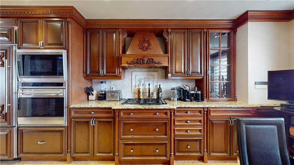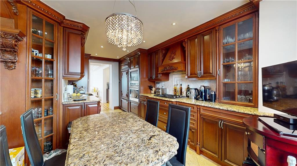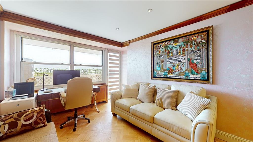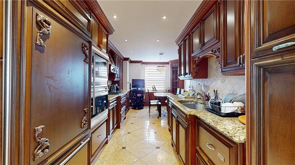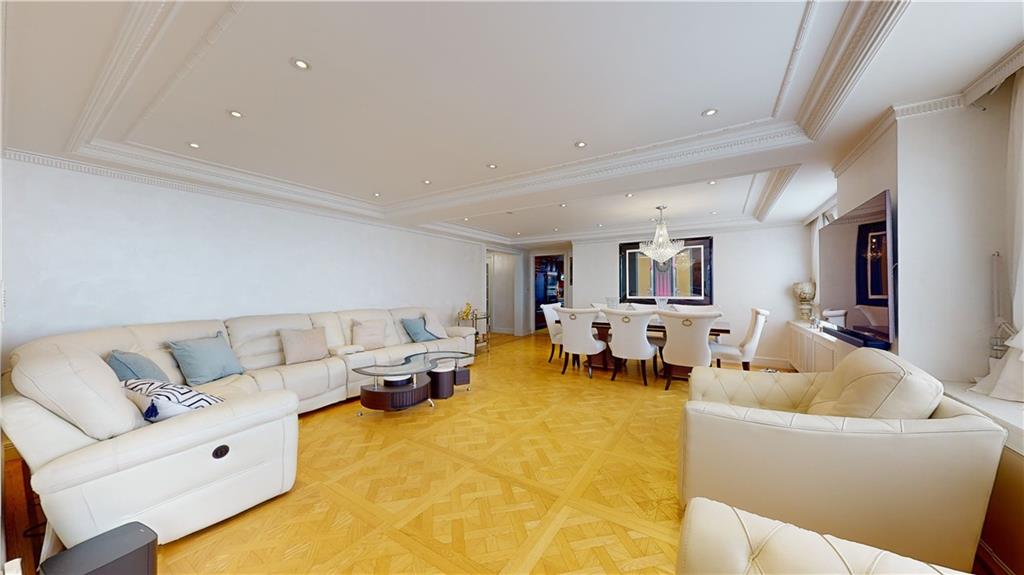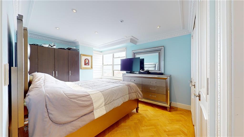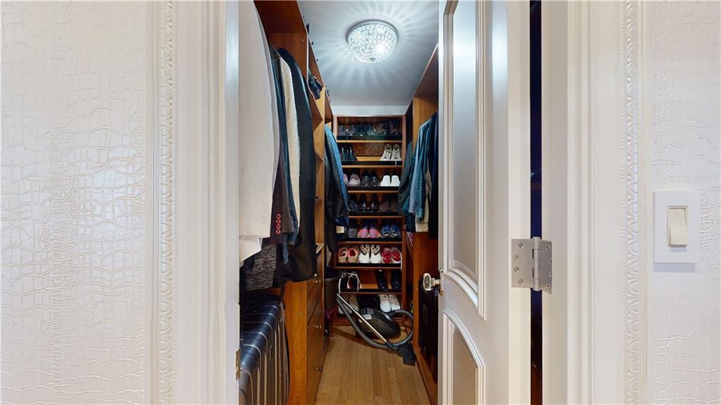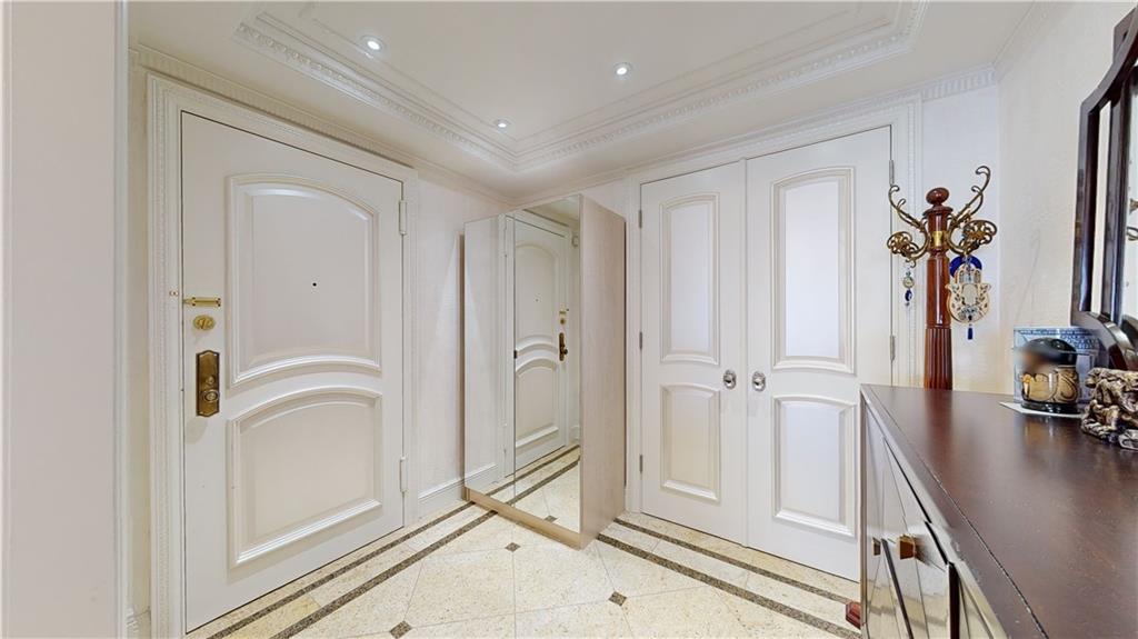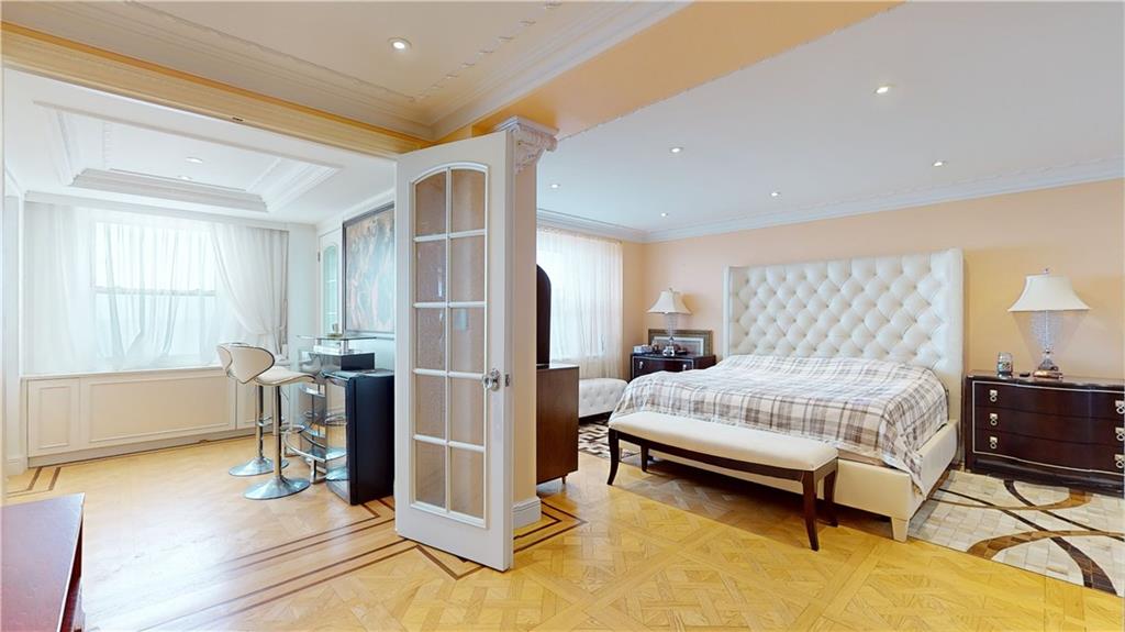 The unit showcases custom European-style renovations, blending modern and classic accents such as white oak parquet floors, crown moldings, shimmer stone walls, granite custom radiator covers, spotlights, and ample custom-built closets, including 2 huge closets. The spacious living and formal room areas lead to the extended chef's dream, windowed kitchen with granite countertops, backsplash, and high-end appliances, including a Sub-Zero Refrigerator.