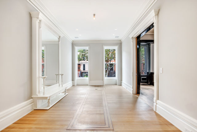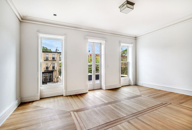 Located in historic Stuyvesant Heights, 588 Madison was originally built in 1889 by infamous architect William Godfrey and recently gut renovated and redesigned by principle at KGBL, a renowned NYC furniture design and architecture firm. This 4 bedroom, 2.5 bathroom triplex home boasts three stories of living space with two private terraces and private backyard complete with a garden. Enter up the steps into the parlor floor of this immaculately restored turn-of-the-century French Neo-Grec brownstone with soaring ceilings, 20th century details, and custom designed white oak with walnut inlay flooring throughout. The formal sitting room will take you back in time with its’ gloriously restored moldings, handmade white oak pocket doors, dramatic windows and stunning original pier mirror. The Kitchen is equipped with Thermador appliances, custom walnut cabinets with satin lacquer fronts, and a solid walnut butcher block work surface that sits atop the kitchen island. Off the kitchen is a cozy sunroom with French doors that direct you onto the terrace with access to a private backyard. The second floor is designed as a traditional master suite-floor complete with en-suite master bath offering custom created linen cabinets, separate vanities, tub and enclosed shower. Off the master bath is a custom walnut walk-in closet which connects to a sitting room or additional bedroom. On the top floor of the brownstone are two additional large bedrooms each with enormous walk-in closets. This floor has a laundry closet and bright full bath with skylight and double sinks with plenty of storage. There is the potential to rent the entire property which boasts over 3800 square feet of living space, consisting of a flowing 3 floor triplex and the rear multi-level garden unit equally well crafted and appointed au-pair/guest quarters or one bedroom garden level unit that can be rented in conjunction with the upper triplex unit. The property has central heating and air conditioning complete with a humidification system and is wired with an ADT home security system. Located on one of the most desirable blocks in Stuyvesant Heights within a short walking distance to coffee shops, bakeries, parks and restaurants as well as multiple bus lines and the A/C Express at Utica Avenue and J at Kosciusko Street. NO PETS ALLOWED.