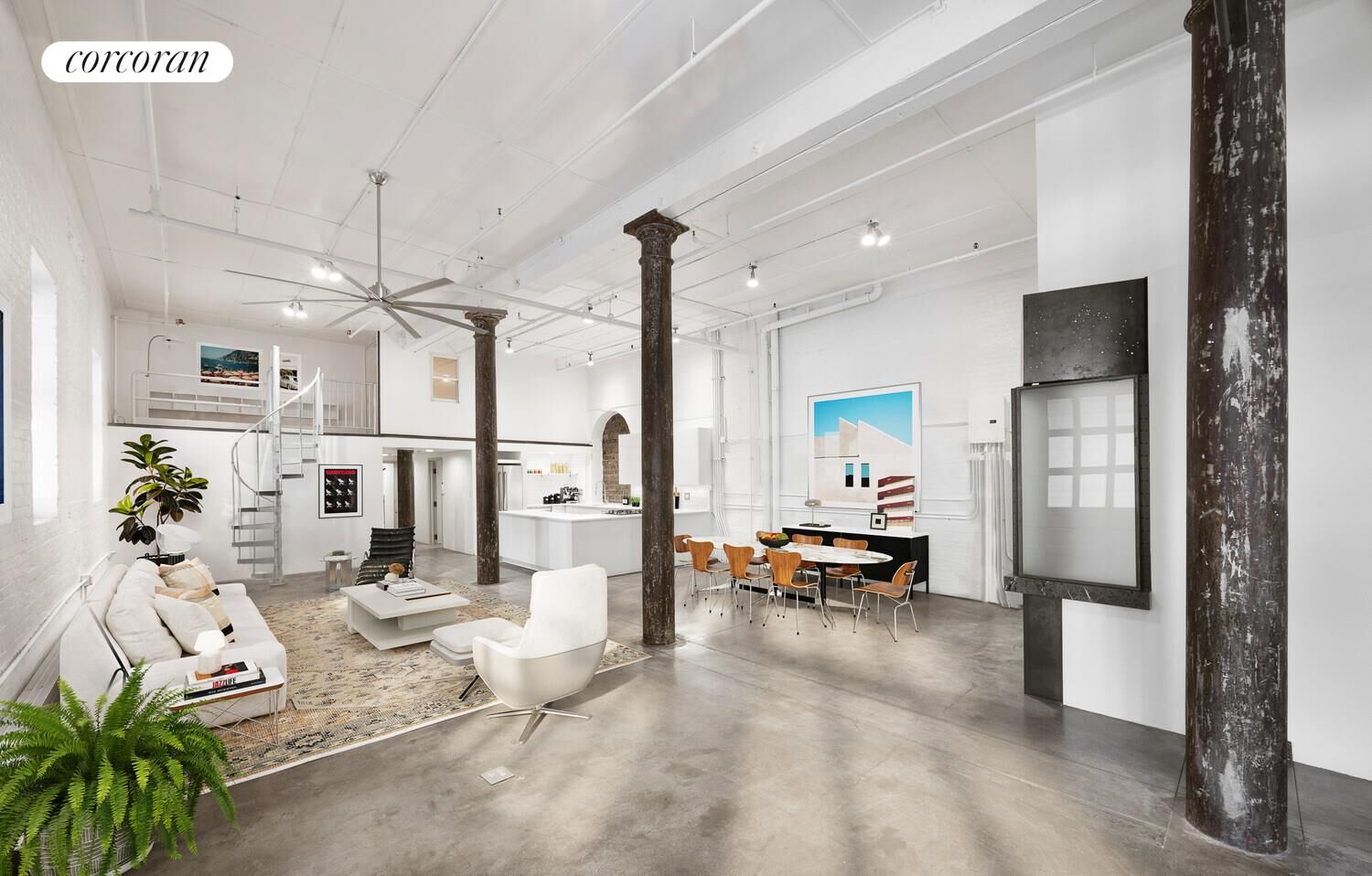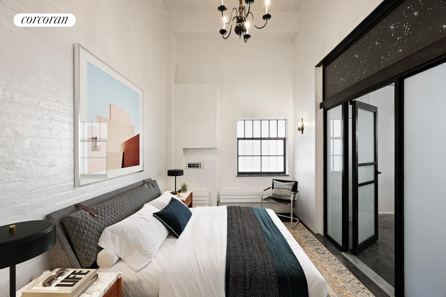 Signature design details-polished concrete floors, exposed whitewashed brick, a roll-up garage-style door, and a bold metal spiral staircase-create a sense of authenticity and creativity throughout. The layout is both functional and flexible. A sleek, open kitchen with top-of-the-line stainless appliances is perfect for hosting. The bedroom, set apart in a quiet corner, enjoys charming western views over Greenwich Street and includes a sculptural detail above the door-a custom metal star chart representing the night sky, bridging art and architecture.