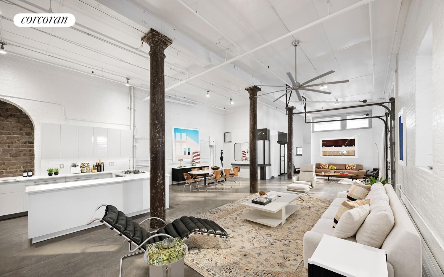 Step into a one-of-a-kind residence on one of Tribeca's most iconic cobblestone blocks. Located in a former 19th-century caviar warehouse, this true industrial loft captures the soul of historic New York while offering refined modern living. Set in an intimate six-story building in prime Northwest Tribeca, the home features dramatic 13'8" ceilings, original structural columns, and oversized north- and west-facing windows that bathe the space in natural light.