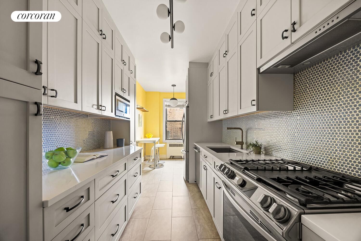 The windowed eat-in kitchen features striking dove grey Shaker-style cabinetry all the way up to the ceiling, a stainless-steel appliance package, snow white quartz countertops, and a cheerful breakfast nook or home office area. In addition to an entry hall/gallery there is a separate foyer (almost another room in itself), which could accommodate a dining table or work-from-home space.