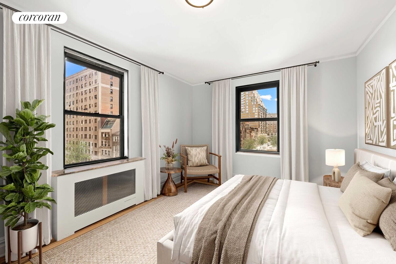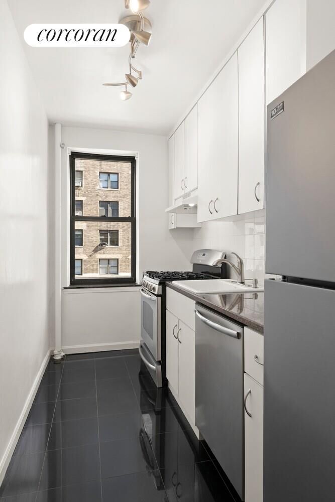 Soaring 9-foot ceilings - the highest in the building at this floor - and oversized windows frame sweeping corner views of West 72nd Street and West End Avenue, with even a hint of Riverside Park in the distance. Natural light floods the rooms throughout the day. The windowed kitchen is outfitted with stainless steel appliances and a full-sized dishwasher. A windowed bath sits just beyond, and together they elegantly buffer the king-sized bedroom from the entertaining spaces. Five deep closets complete the picture, offering exceptional storage rarely found in a one-bedroom.