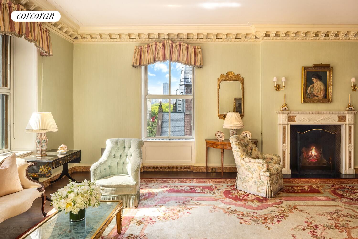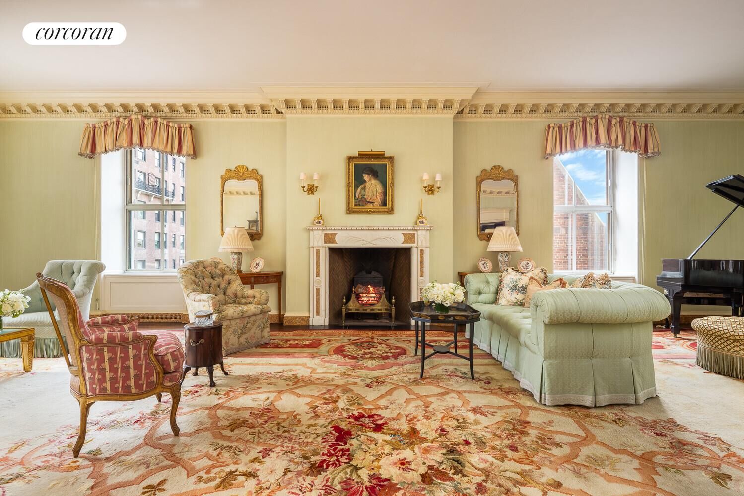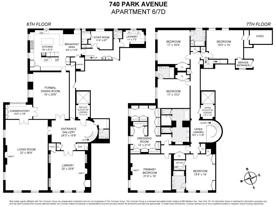 Perfectly situated in Rosario Candela's most coveted building, 740 Park Avenue, this palatial sixteen-into-fourteen-room southwest corner duplex is a true architectural masterpiece. Drenched in sunlight, the residence is distinguished by ceilings soaring to nearly 11 feet, three wood-burning fireplaces, and an extraordinary abundance of beautifully preserved historic detail. The home offers five bedrooms, five full bathrooms, and two powder rooms, along with grand entertaining rooms including a living room, formal dining room, conservatory, library, windowed eat-in kitchen and breakfast room, as well as an oversized staff room and windowed laundry room.