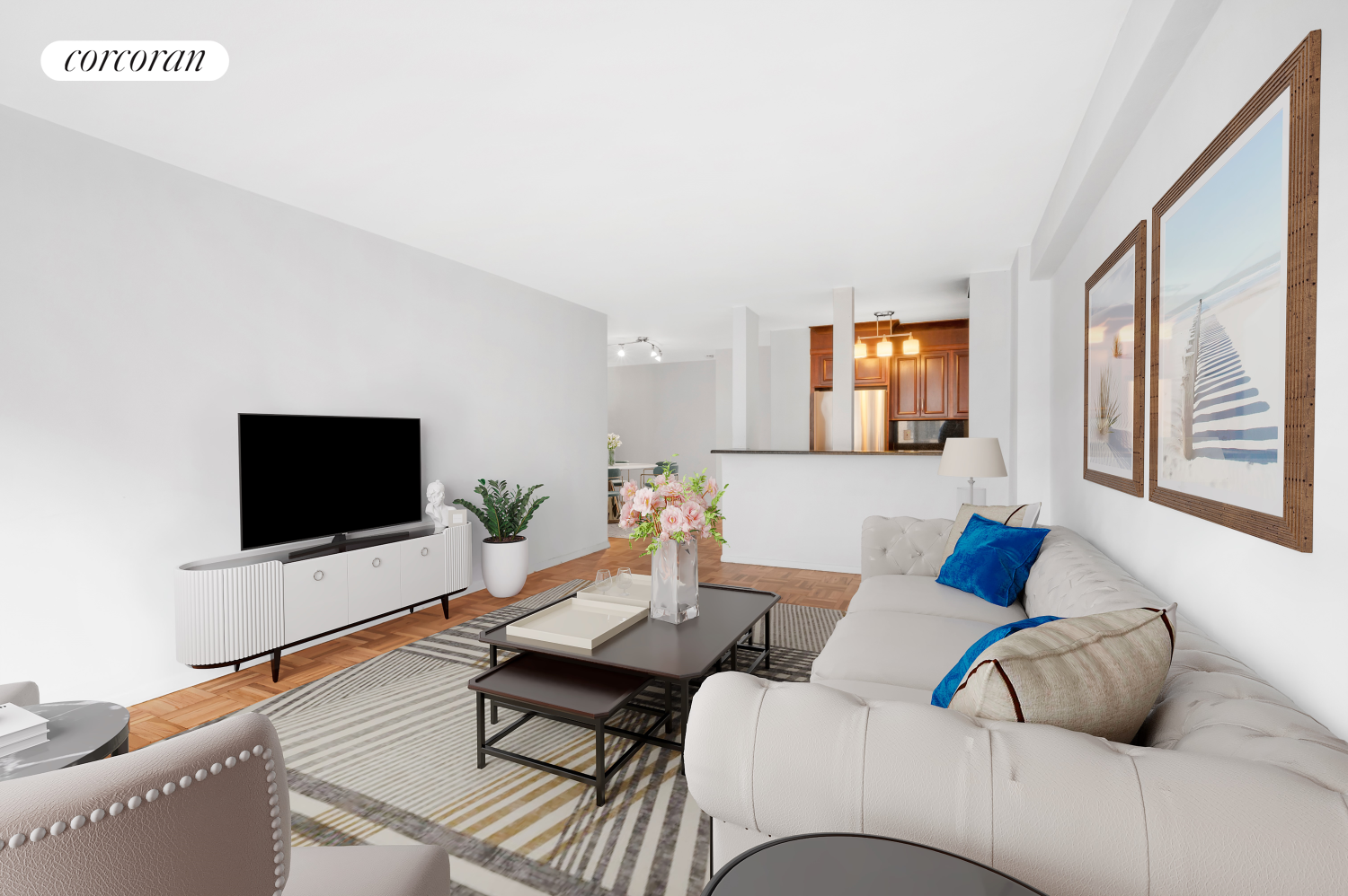 Welcome to apartment 9B at The Byron, a full-service coop in prime Murray Hill. This sun-filled sprawling 1,200sf two-bedroom, two-bathroom home will exceed expectations with its grand scale and generous room sizes. As you walk into the apartment you enter a spacious foyer that works perfectly as a dining gallery, flowing seamlessly into the open kitchen. The thoughtful floorplan consists of a split bedroom layout, which is entirely sunbathed in East and West exposures. The primary suite offers excellent closet space and an en-suite bathroom. Positioned towards the rear of the apartment is the 2nd bedroom, which is nearly equal in size to the primary; both bedrooms can fit king-sized beds.
