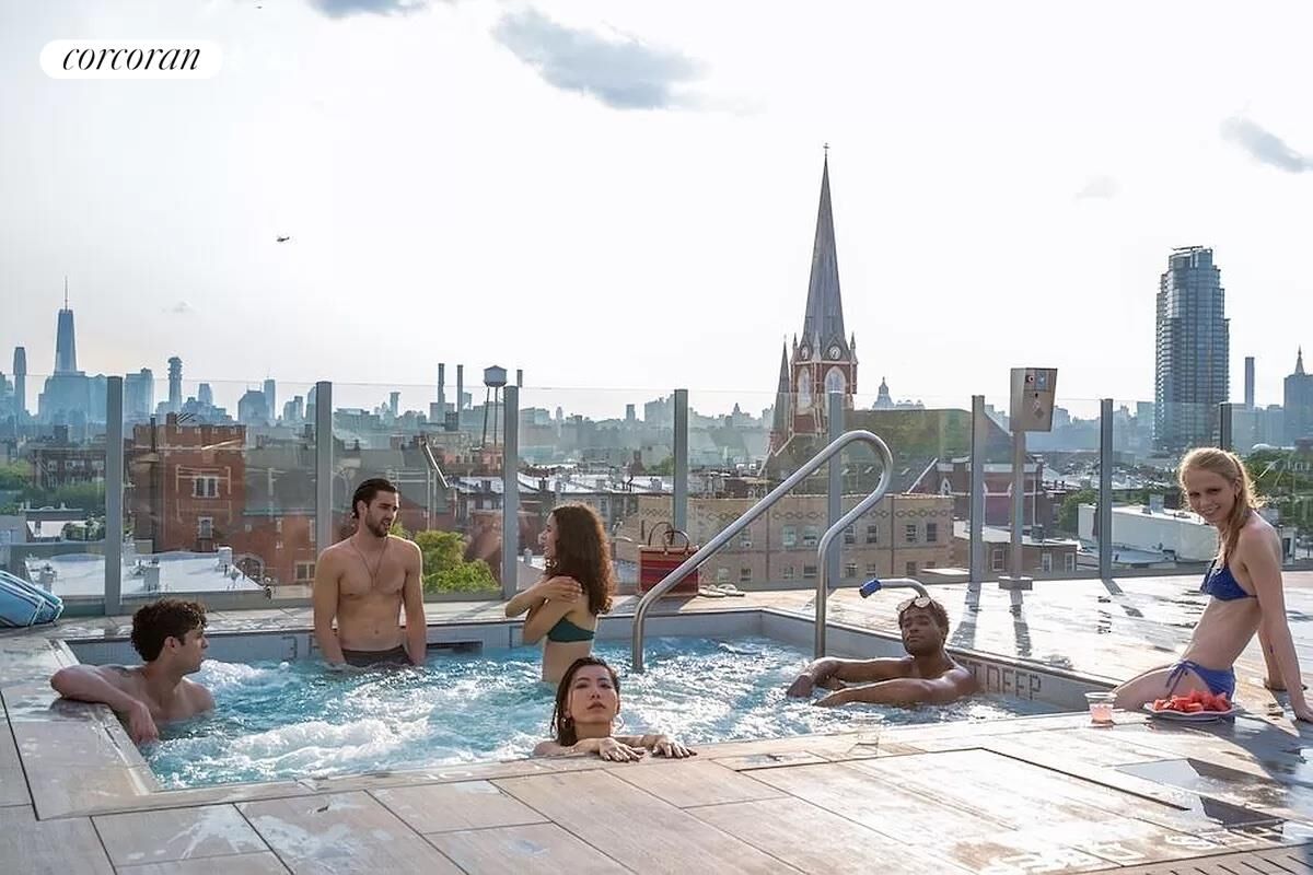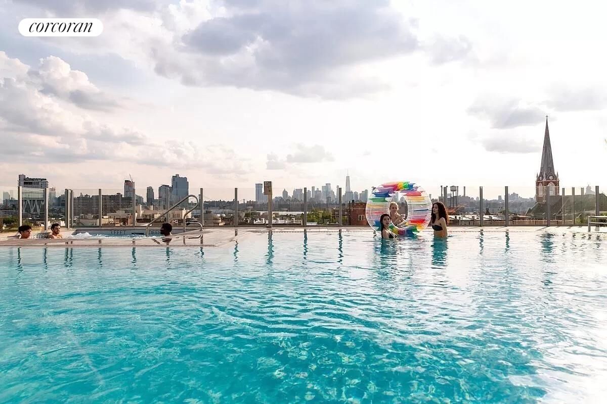 - One-of-a-kind roof deck featuring a pool, hot tub, tanning sundeck, multiple barbecues and dining areas, lounge areas, and a large lawn with outdoor TV; All with stunning Manhattan, Williamsburg and Long Island City views