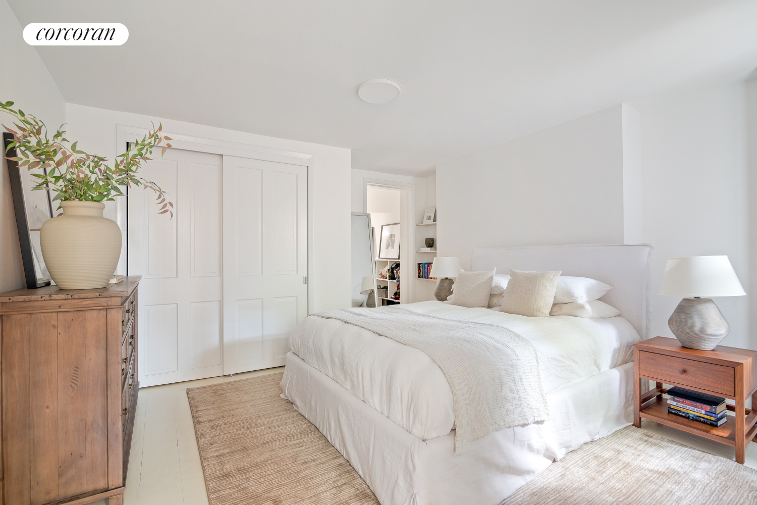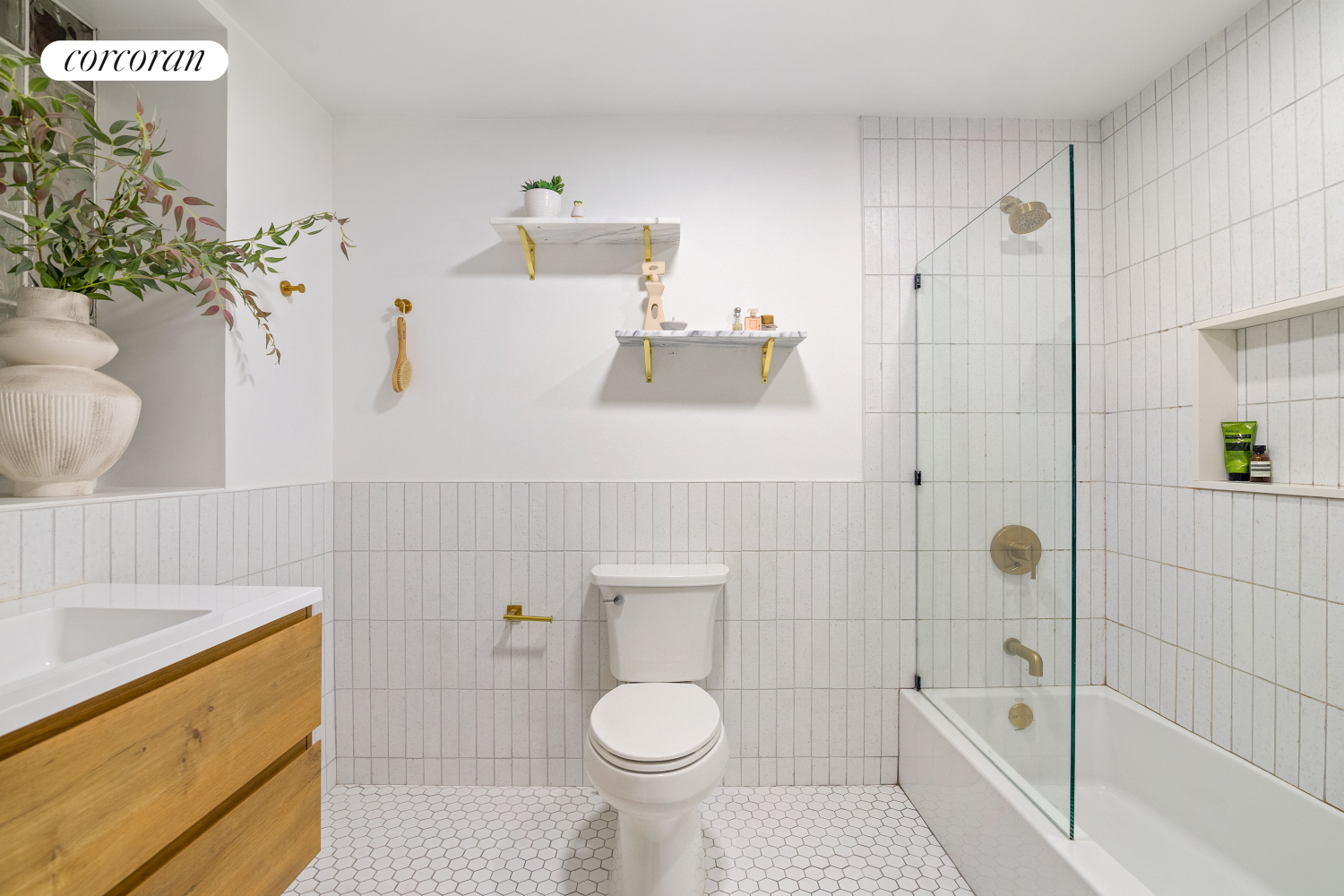 The hallway to the main bedroom has a built out walk in closet, not to mention, another large closet in the primary bedroom. The room can easily fit a king, and lots of display nooks have been thoughtfully added through out. The brand new bathroom features Hand pained Cle tile, radiant heat floors, niche for toiletries, and extra large 36 in vanity with brushed gold and matte black fixtures.