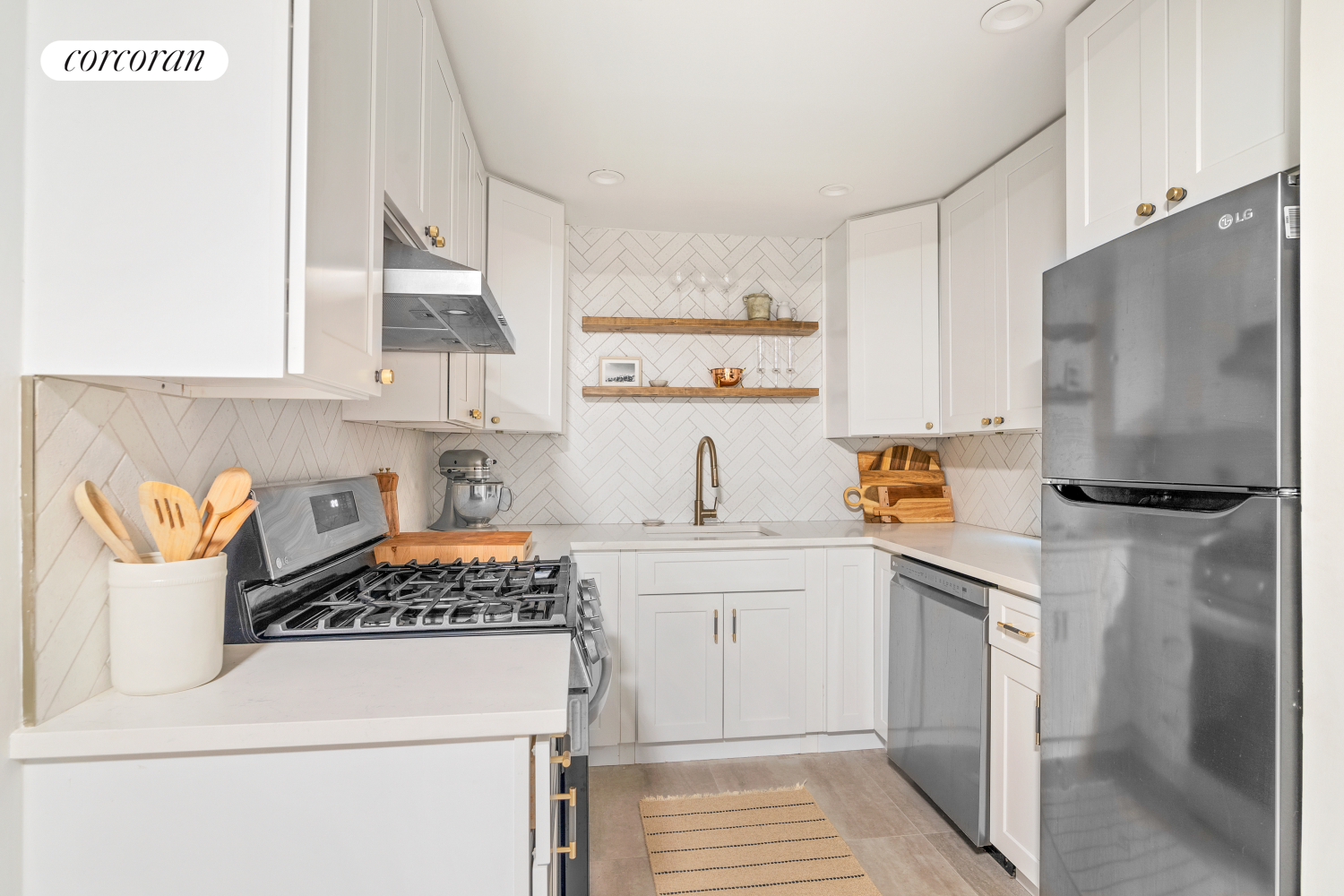 The living room features beautiful original tin ceilings, original decorative fireplace, LED lights through out, and white painted hardwood floors. The Brand new kitchen is a modern day cook's dream, complete with a Brand new professional grade LG appliance package, grey and white quartzite counters with handpainted Cle tile in a herringbone backsplash, brushed gold faucet and solid knurling handles. Tons of cabinets with under counter lighting, and a deep lazy Susan cabinet. Finished with open selves to display dinner wear, plants, and more closed storage surround.