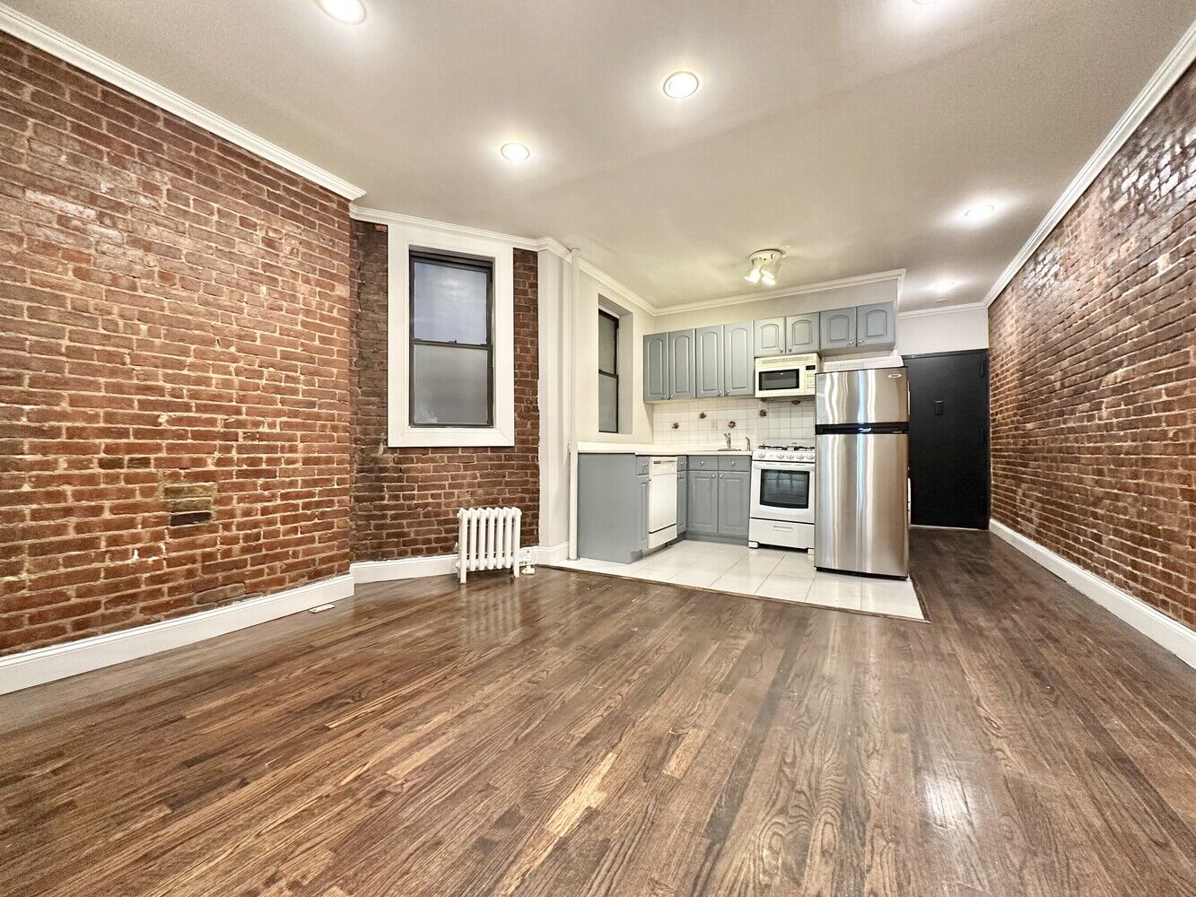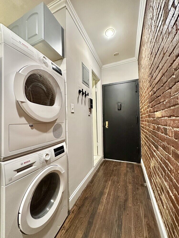 This is a beautifully renovated true 2 bedroom / 1 bath apartment that combines modern finishes with classic pre-war character.Apartment Details:-Bosch washer and dryer in unit-Spacious living room-Exposed brick-Updated kitchen-Refrigerator, microwave, dishwasher, stovetop and cooking range-Recessed Lighting -Equally sized bedrooms-Large closets and overhead storage in each bedroom-Hardwood floorsNeighborhood Information:Located just minutes from the vibrant shops, restaurants, and theaters of the Theatre District, this address offers you the best of Midtown West. The M11 and M50 bus lines are around the corner. Subway access is convenient via the C, E, and 1 trains. In the Theater District, youll find a rich mix of dining options (everything from iconic delis to international cuisine), performance venues, and local sanctuaries like Hells Kitchen Park.