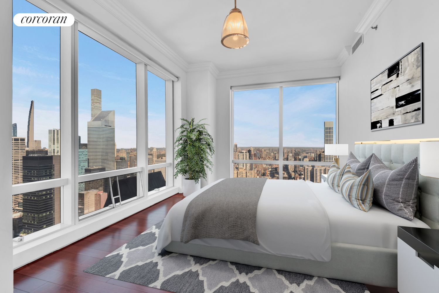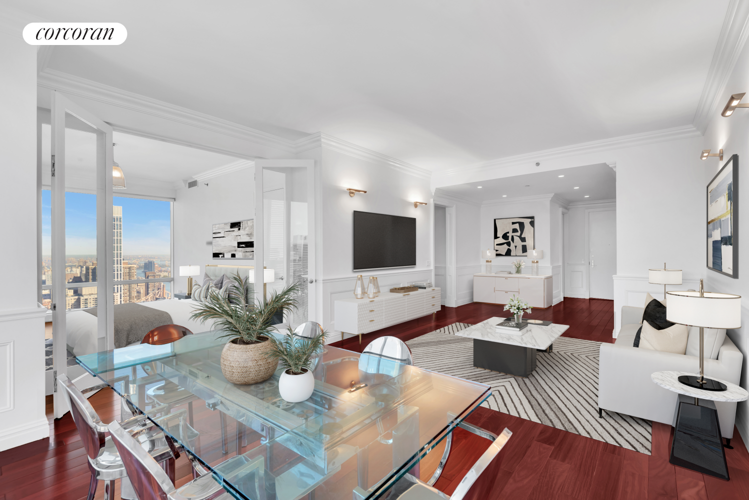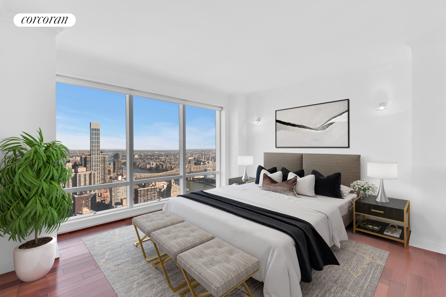 Welcome to Apartment 60E at 845 United Nations Plaza, an exquisite two-bedroom, two-bathroom residence offering 1,493 square feet of luxurious living with sweeping skyline and river views. This corner unit, perched high above the city, boasts floor-to-ceiling windows that flood the space with natural light while framing dramatic north and west views of the East River and Manhattan's iconic skyline.
