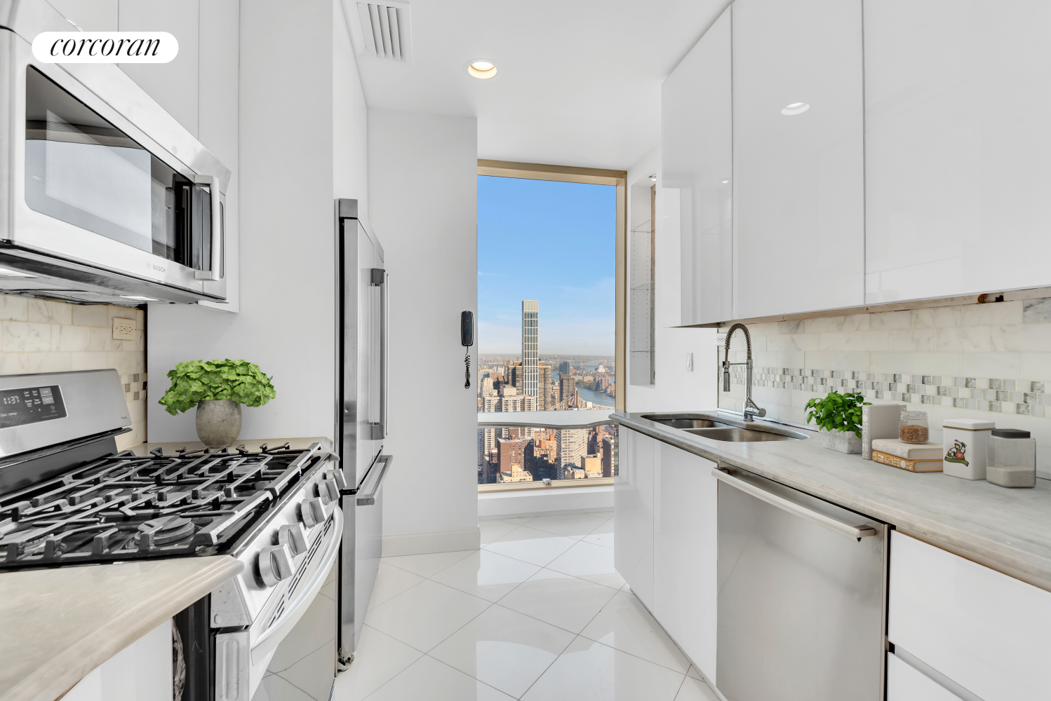 The windowed kitchen is outfitted with honed grey marble countertops and an array of top-tier appliances. It includes a Viking refrigerator, LG five-burner stove and oven, Bosch microwave, and a Bosch dishwasher. A laundry closet equipped with a Bosch washer/dryer is tucked discreetly into the unit for added convenience. The apartment features beautiful Brazilian cherry plank hardwood floors, creating an atmosphere of warmth and sophistication.