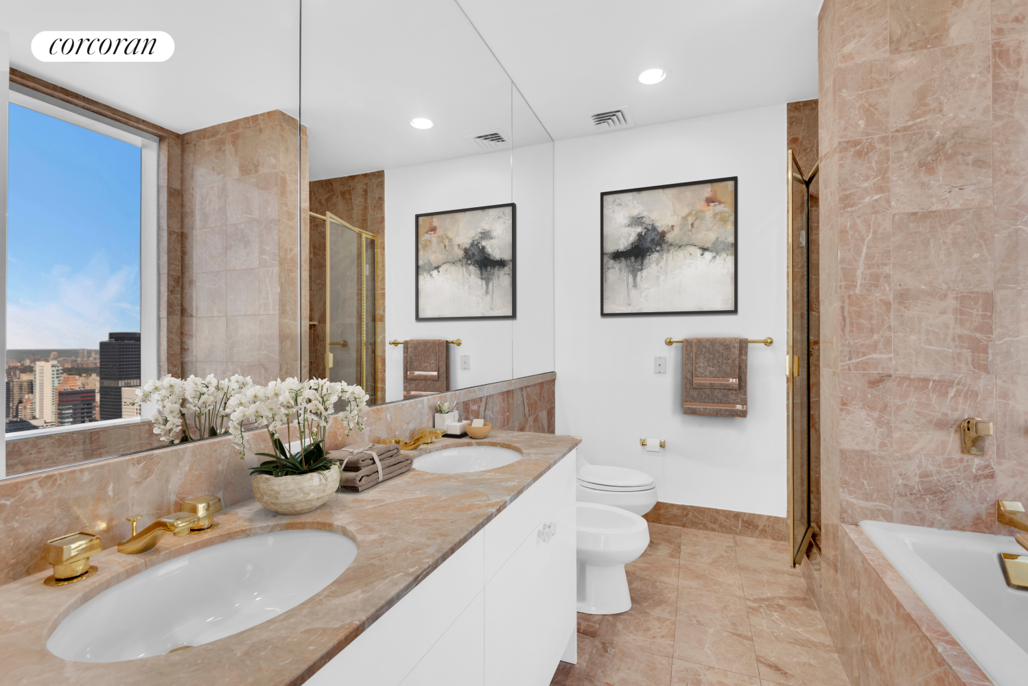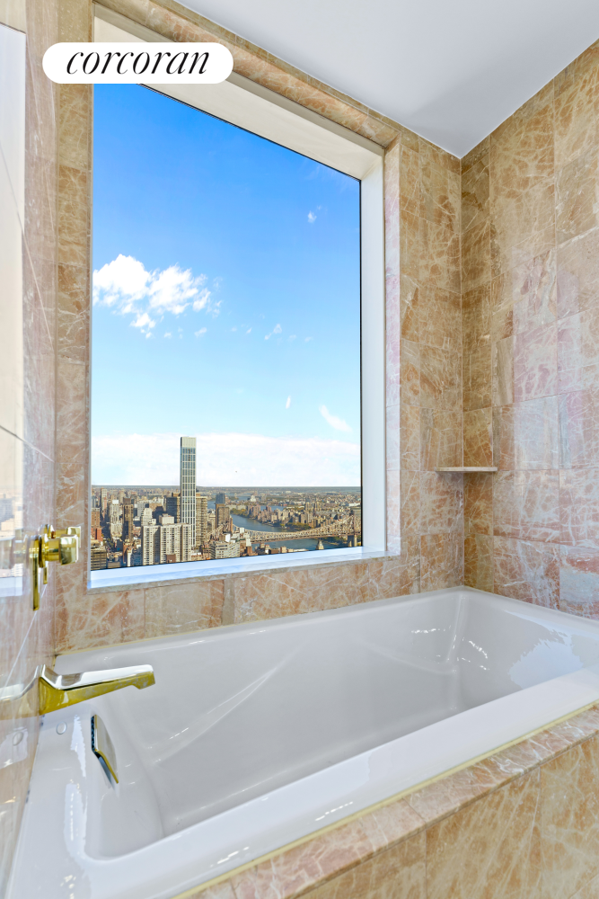 The primary suite, designed as a private sanctuary, offers breathtaking river views, ample closet space, and a lavish en-suite bathroom. The bathroom is finished in onyx stone tile and features a double vanity, a stall shower, and an inviting soaking tub with a large window overlooking the East River, offering a spa-like retreat at home.