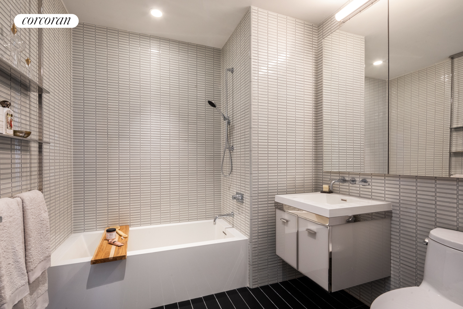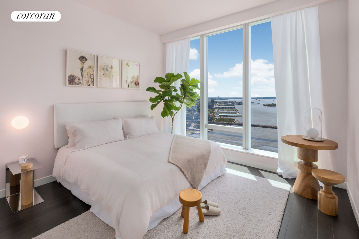Residence 10H is a 1156 square foot two-bedroom, two bathrooms, with an open gourmet kitchen and breakfast bar. This spacious corner residence faces Northeast and Southeast with expansive Midtown, East River and Manhattan Bridge views. Warm, modern interiors are brought to life by the renowned design team at Meyer Davis Studio. This residence features imported stone and custom finishes, premium Miele appliance package, 5 wide stained oak flooring, master bath with custom wood cabinetry, marble tile walls and mosaic floors with radiant heat, under-mount Wetstyle sink with glass vanity top and Dornbracht polished chrome faucets and a washer and dryer.