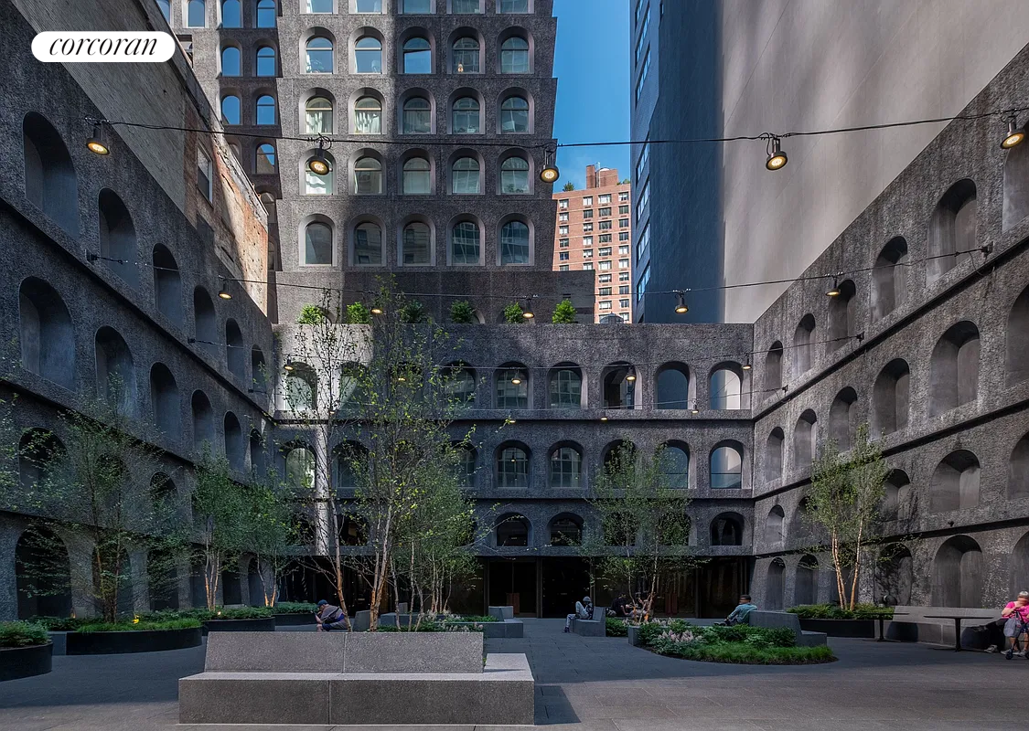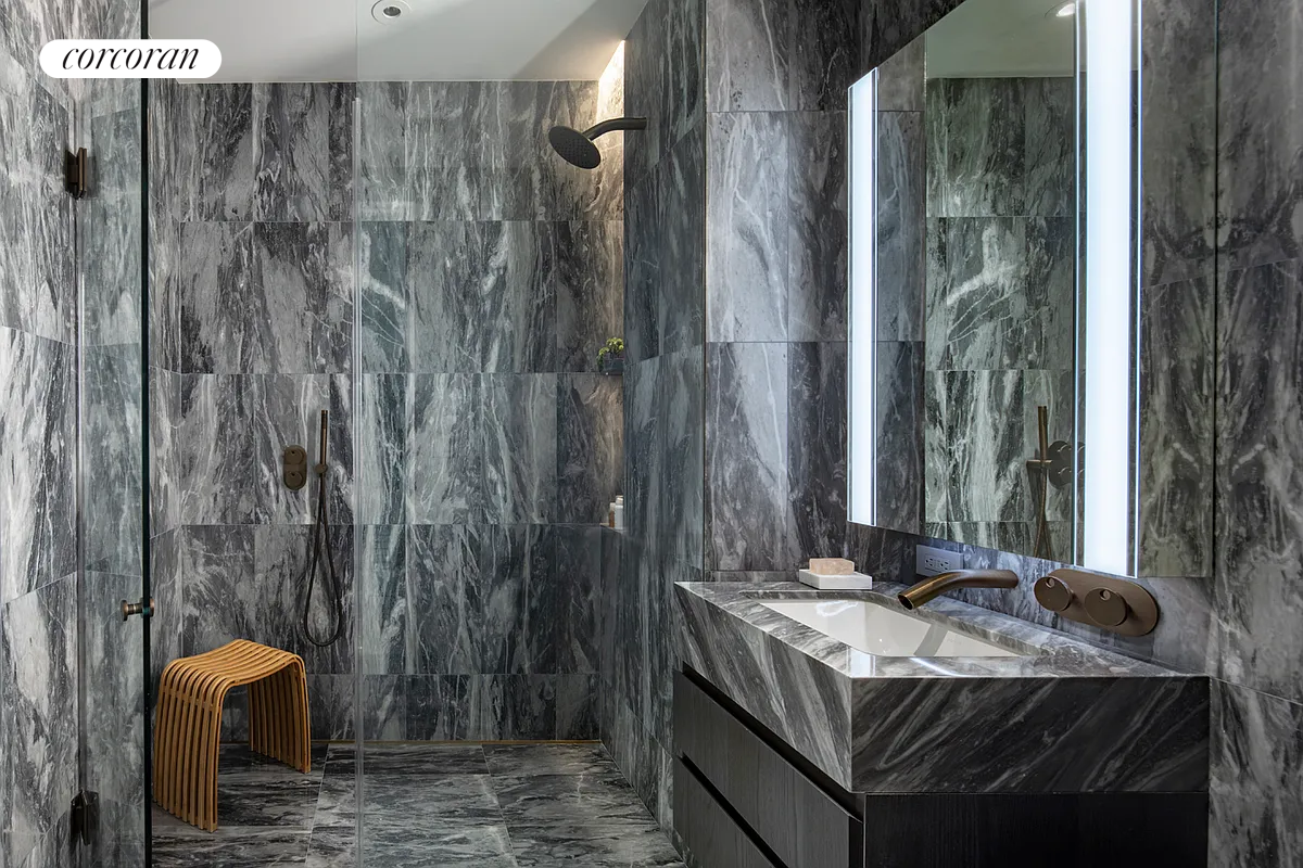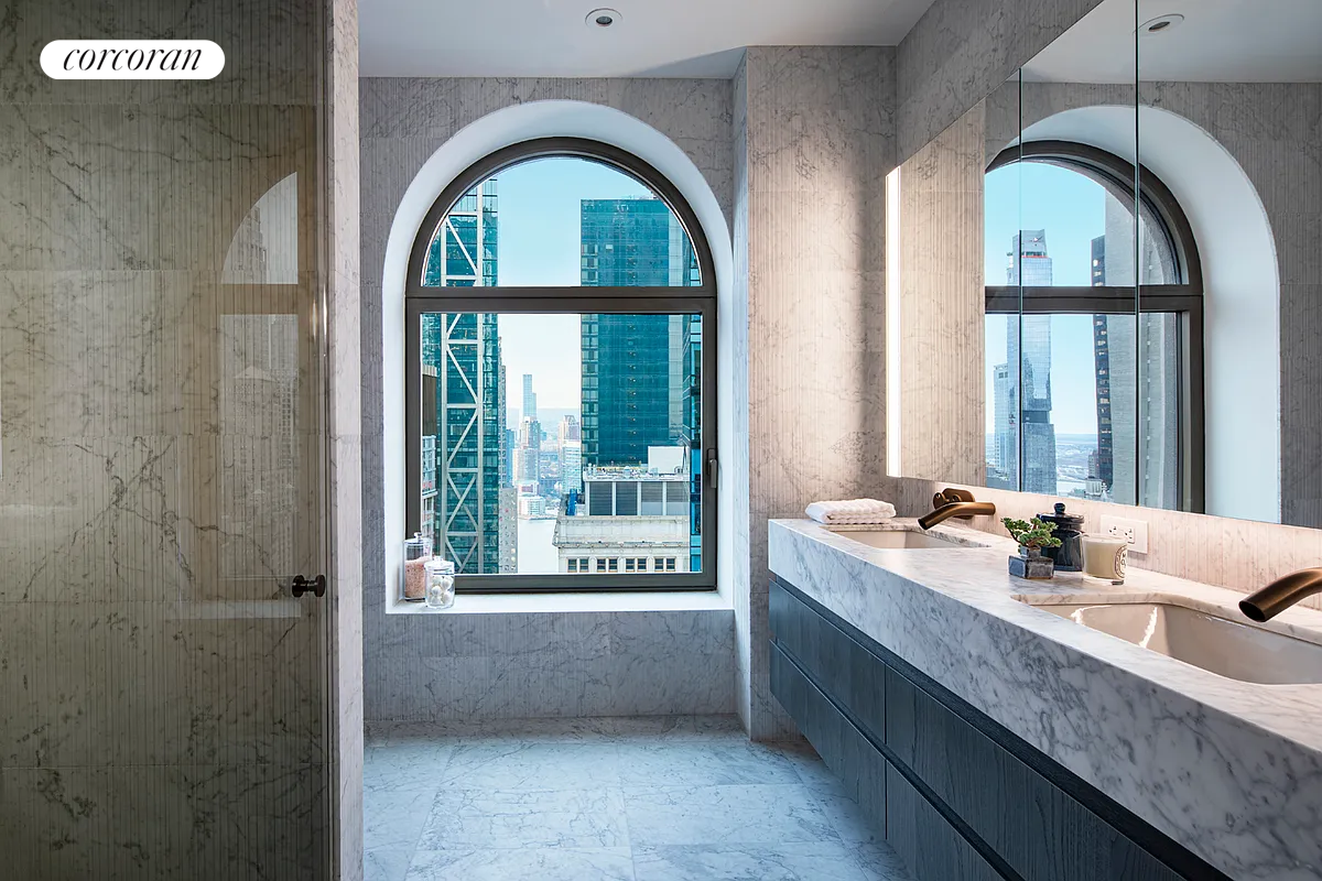 Residence 43C is a corner three bedroom, three bathroom home with approximately 10 foot ceilings and oversized arched windows with elegant bronze detailing framing expansive New York City skyline views. Interior finishes include wide-plank white oak flooring and oil rubbed bronze fixtures custom designed by Sir David Adjaye. The residence boasts an open kitchen with custom Pedini Italian textured blackened oak cabinetry, Salvatori Pietra Cardosa marble countertops and backsplash hand-selected from the Apuan Alps in Tuscany with a Salvatori Nero Marquina cantilever providing additional seating, and state-of-the-art appliances by Gaggenau, Bosch, and Thermador, including wine storage. The corner primary bedroom suite has a generous windowed walk-in closet and a luxuriously appointed windowed bathroom with textured Italian Bianco Carrara marble, a custom Pedini Italian millwork double vanity, an expansive shower and 6-foot soaking tub, and radiant heated floors. There are two generous secondary bathrooms in the residence with custom Pedini Italian millwork vanities, one complete with Salvatori Grigio Versilia marble throughout and a soaking tub, the other with Salvatori Bianco Carrara marble throughout and an expansive shower.