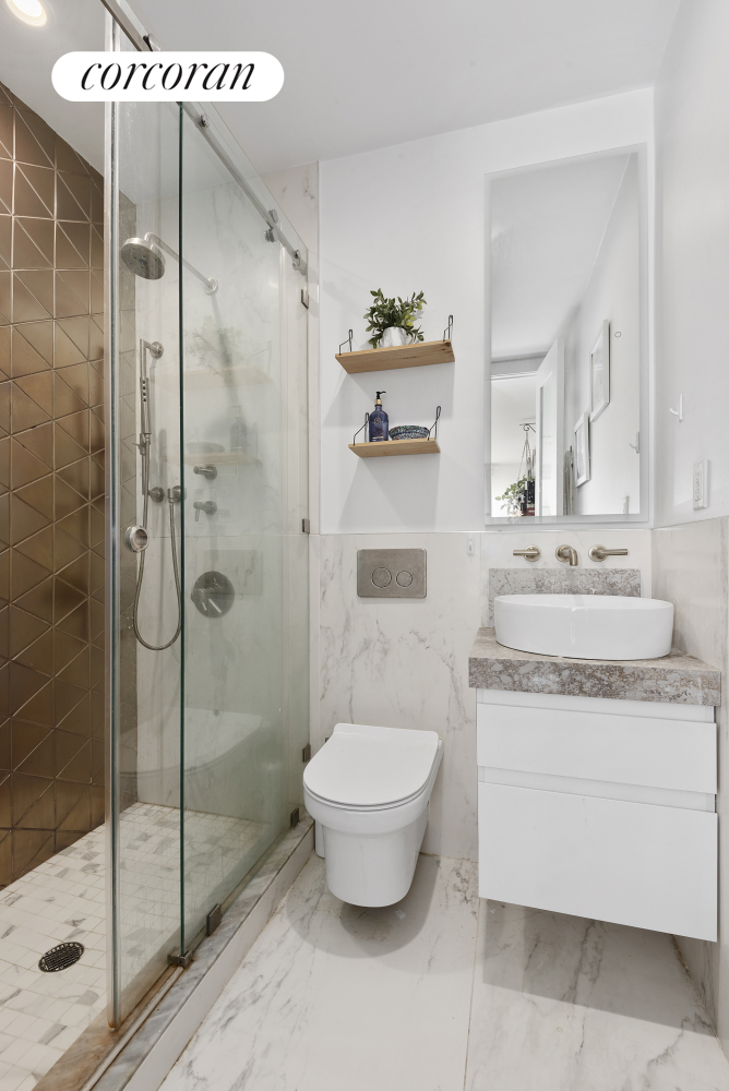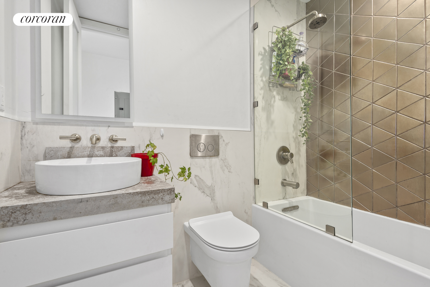 Both bedrooms offer ample space and abundant light, each with its own private closet. Just steps away, a stunning full bathroom awaits, featuring elegant Calacatta marble flooring, a custom vanity with a vessel sink, and a striking copper tile accent wall. The master bedroom also provides direct access to the serene backyard.