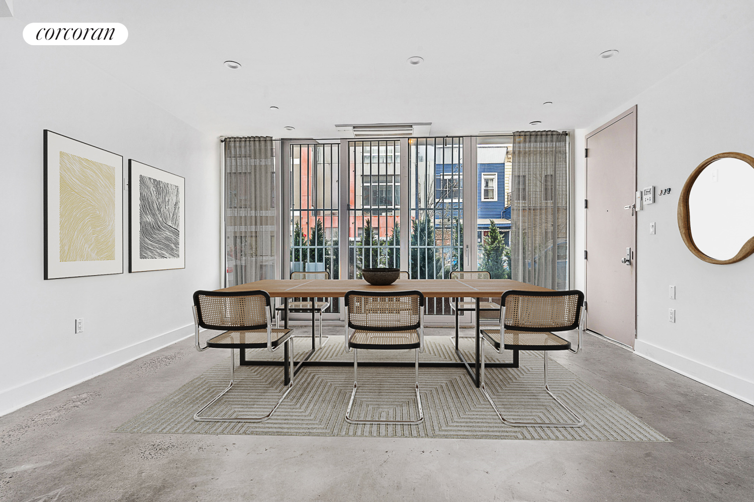 The upper level boasts a vast great room that spans the spacious living room, dining room, and kitchen areas. The design of the space effortlessly combines industrial chic with relaxed luxury, reflecting the vibrant, eclectic spirit of Bushwick. Statement finishes include polished concrete floors, sweeping floor-to-ceiling windows, and a wall-to-wall Juliet balcony. The chef's kitchen is an entertainer's dream, featuring an eat-in peninsula and a high-end stainless steel appliance package from Fisher & Paykel and Blomberg, complete with a custom built-in exhaust hood. Polished Caesarstone countertops, a matching backsplash, and Brienza antique copper finishes make this kitchen as beautiful as it is functional.