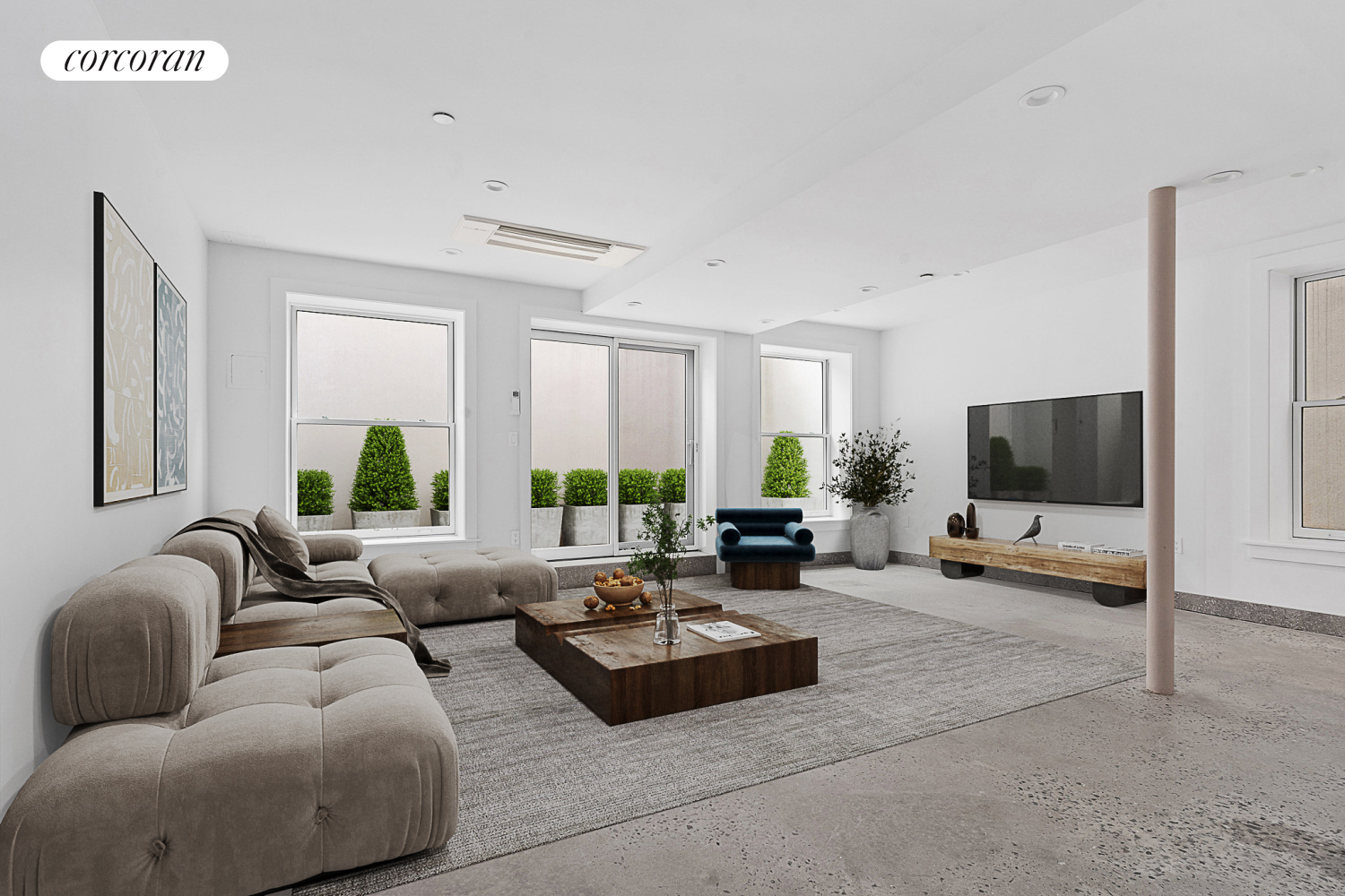 The pi ce de r sistance of this home may very well be the duplex's lower level. The possibilities for this space are limited only by one's creativity, as it could easily function as an office, recreation room, media room, or home gym. Not only does it boast its own private entrance, but it also offers a powder room and direct access to the lower terrace.