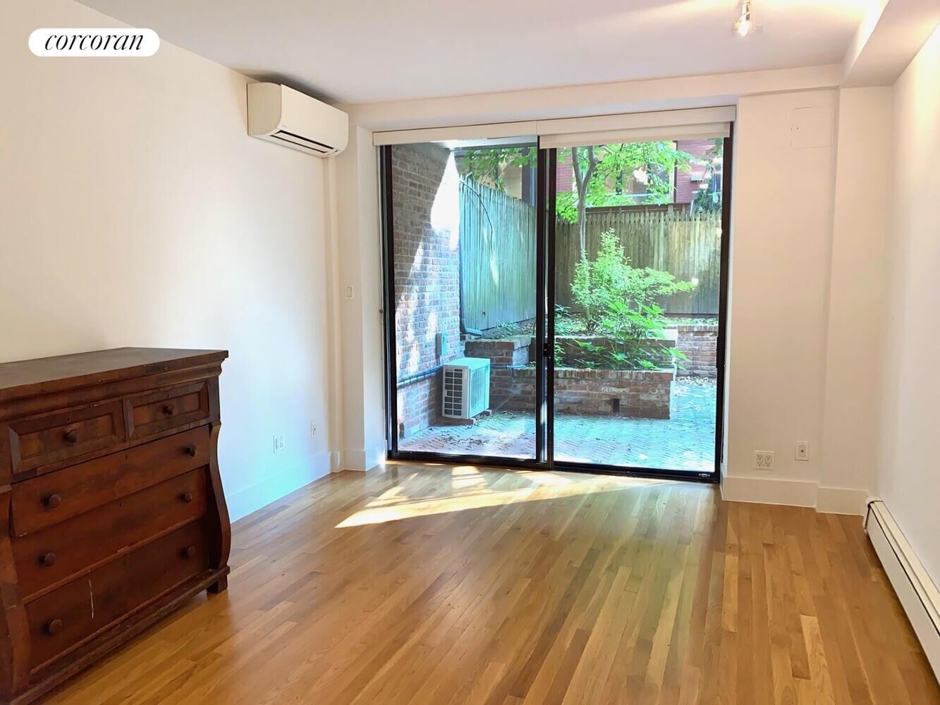 This Unique apartment has a beautiful hardwood floors, an enormous living/dining area with an electric fireplace and floor to ceiling glass doors leading to a gorgeous Private Patio and Garden.