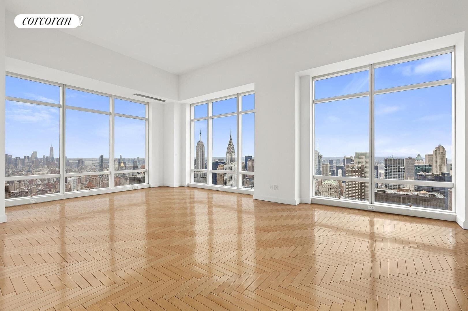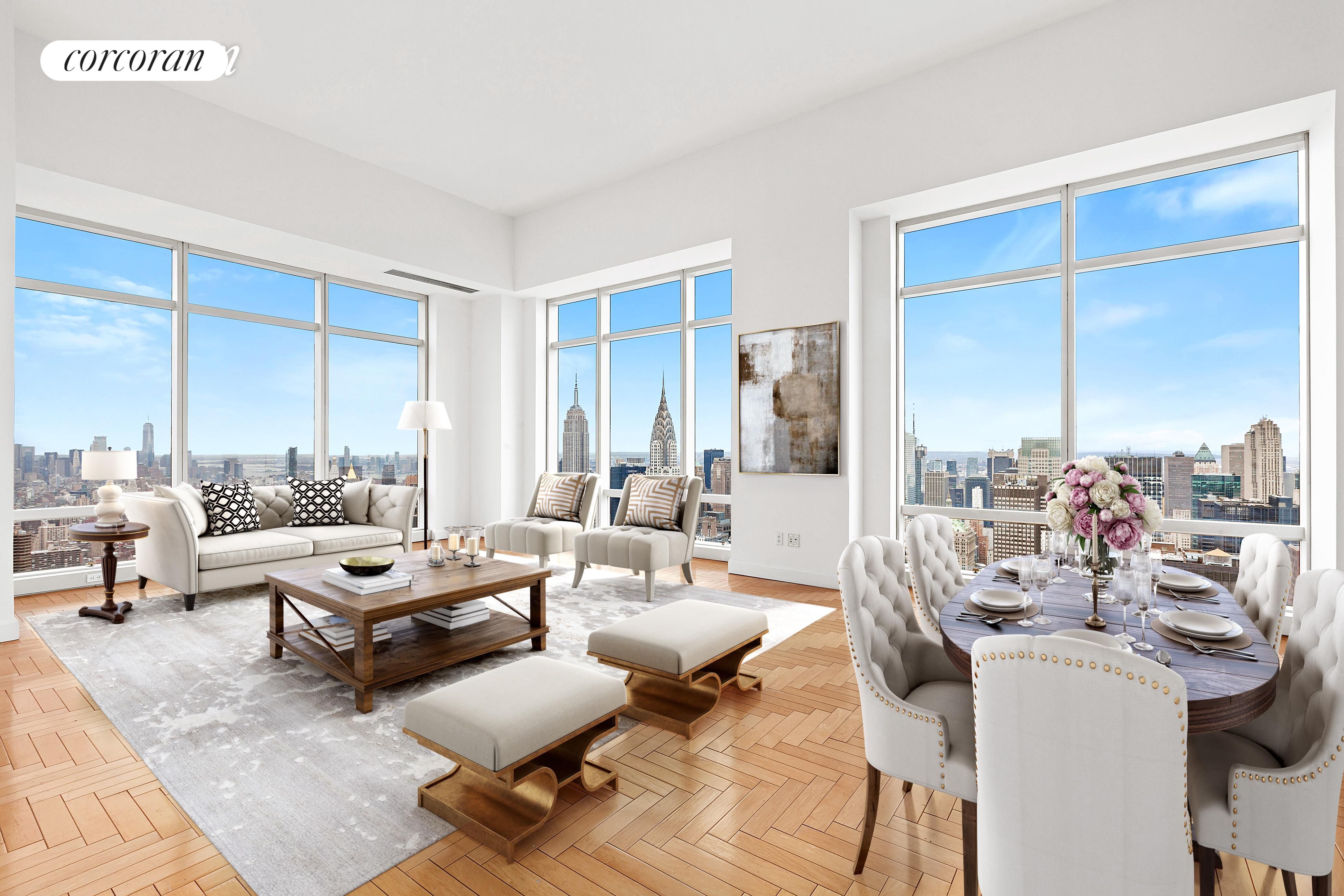 This expansive 3-bedroom, 3.5-bathroom residence boasts soaring 14-foot ceilings and dramatic floor-to-ceiling windows that flood the space with natural light. From sunrise to sunset, you'll enjoy panoramic, unobstructed views that capture the essence of New York City - from Central Park to the Empire State Building, the Chrysler Building, Freedom Tower, and beyond, all the way to the southern tip of Manhattan.