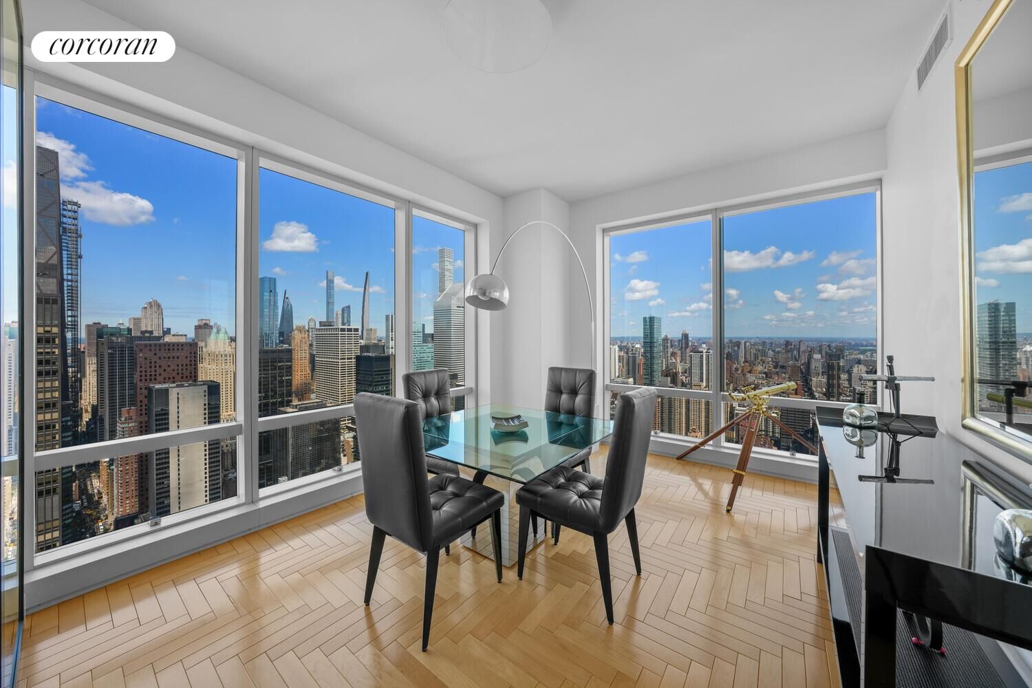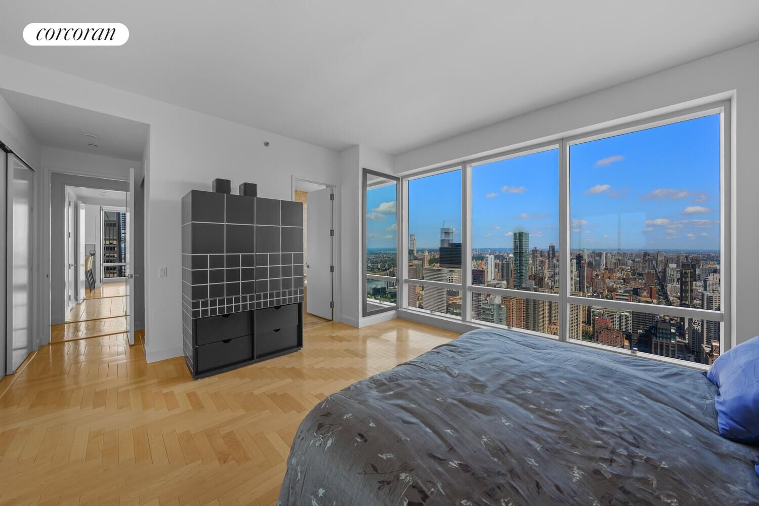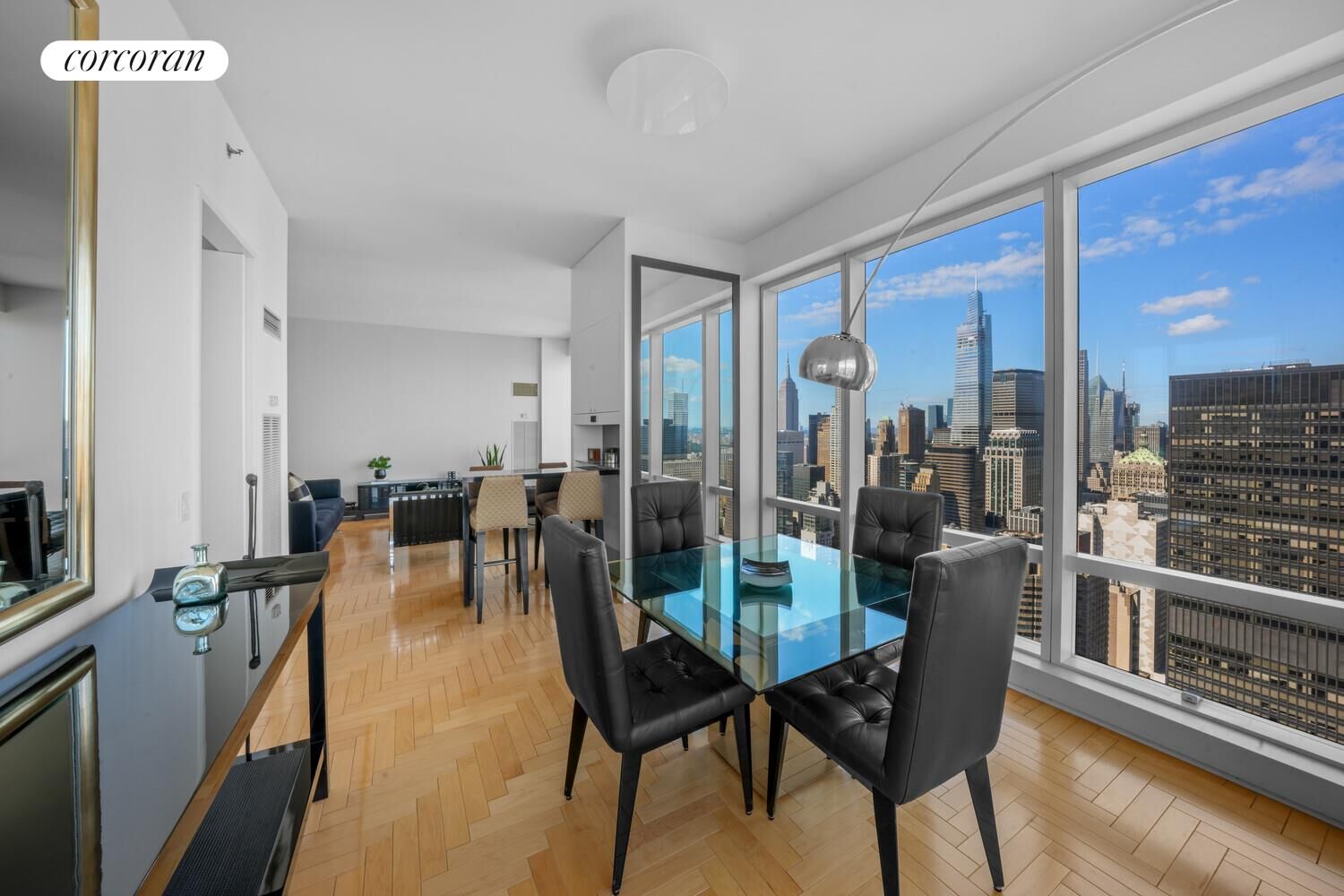 The home has been used as a pied-à-terre, so it is in perfect condition, and was recently updated. The home is laid out as a lofty one bedroom with two full bathrooms, but home converts easily to accomodate a second bedroom. The condo has 1,493 SF of interior space, abundant closets, herringbone flooring throughout, a windowed kitchen,WD, two full marble bathrooms  with the main bathroom featuring an enclosed glass shower, large soaking tub, dual sink, bidet,  plus a window overlooking the NYC's skyline. The home features floor to ceiling windows displaying Manhattan's changing skyline from every angle.  This is a corner unit with North, East and West exposures.