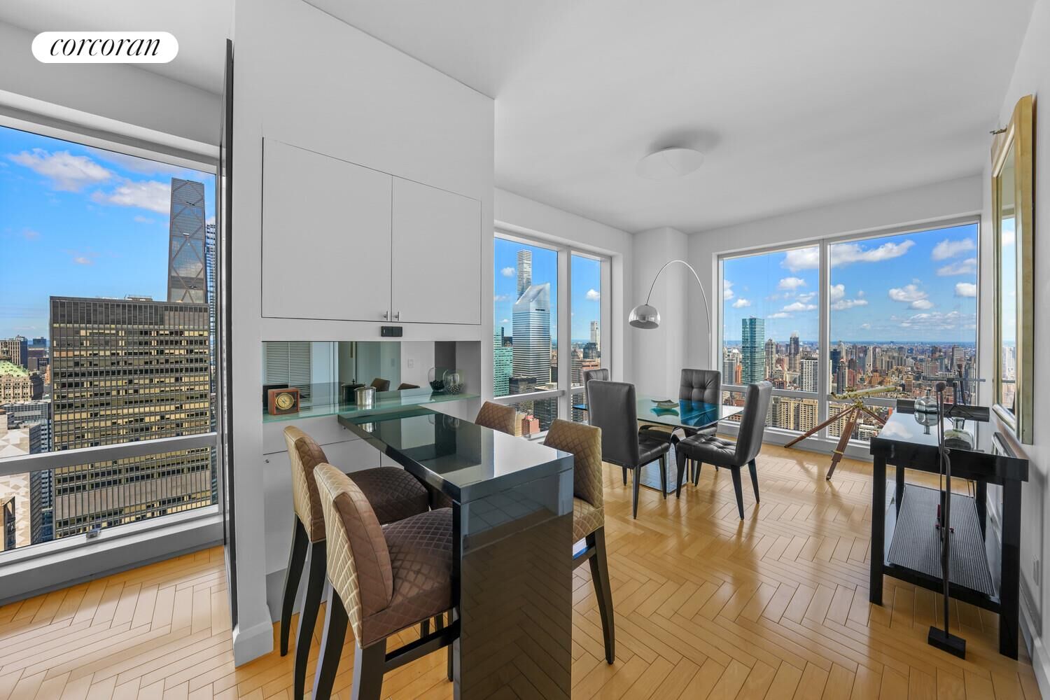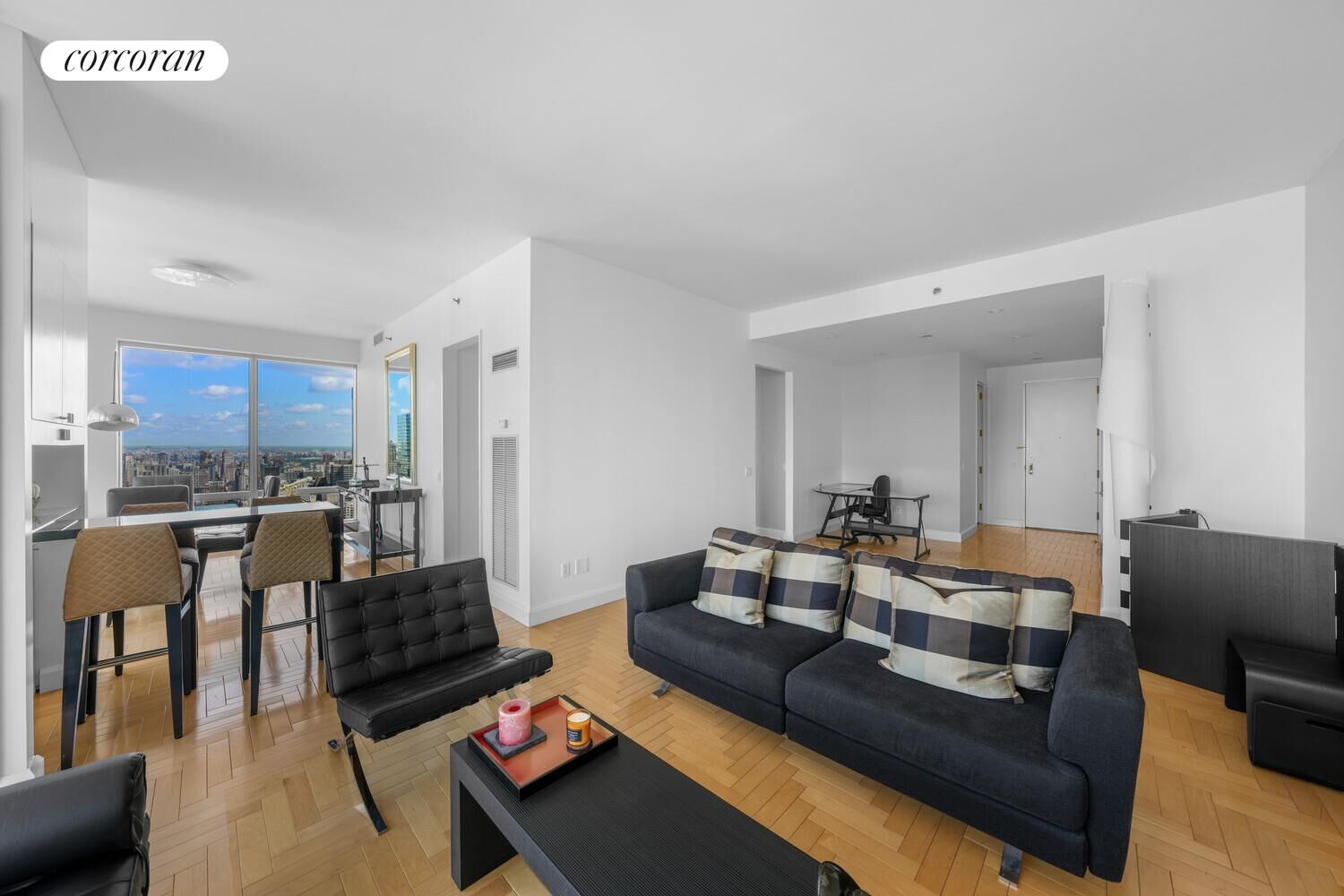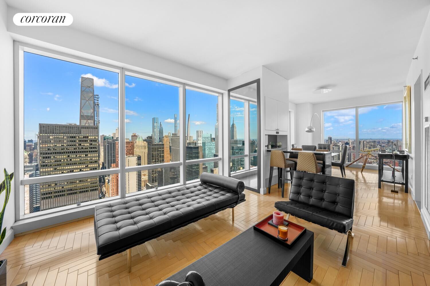 The home has been used as a pied-à-terre, so it is in perfect condition, and was recently updated. The home is laid out as a lofty one bedroom with two full bathrooms, but home converts easily to accomodate a second bedroom. The condo has 1,493 SF of interior space, abundant closets, herringbone flooring throughout, a windowed kitchen,WD, two full marble bathrooms  with the main bathroom featuring an enclosed glass shower, large soaking tub, dual sink, bidet,  plus a window overlooking the NYC's skyline. The home features floor to ceiling windows displaying Manhattan's changing skyline from every angle.  This is a corner unit with North, East and West exposures.