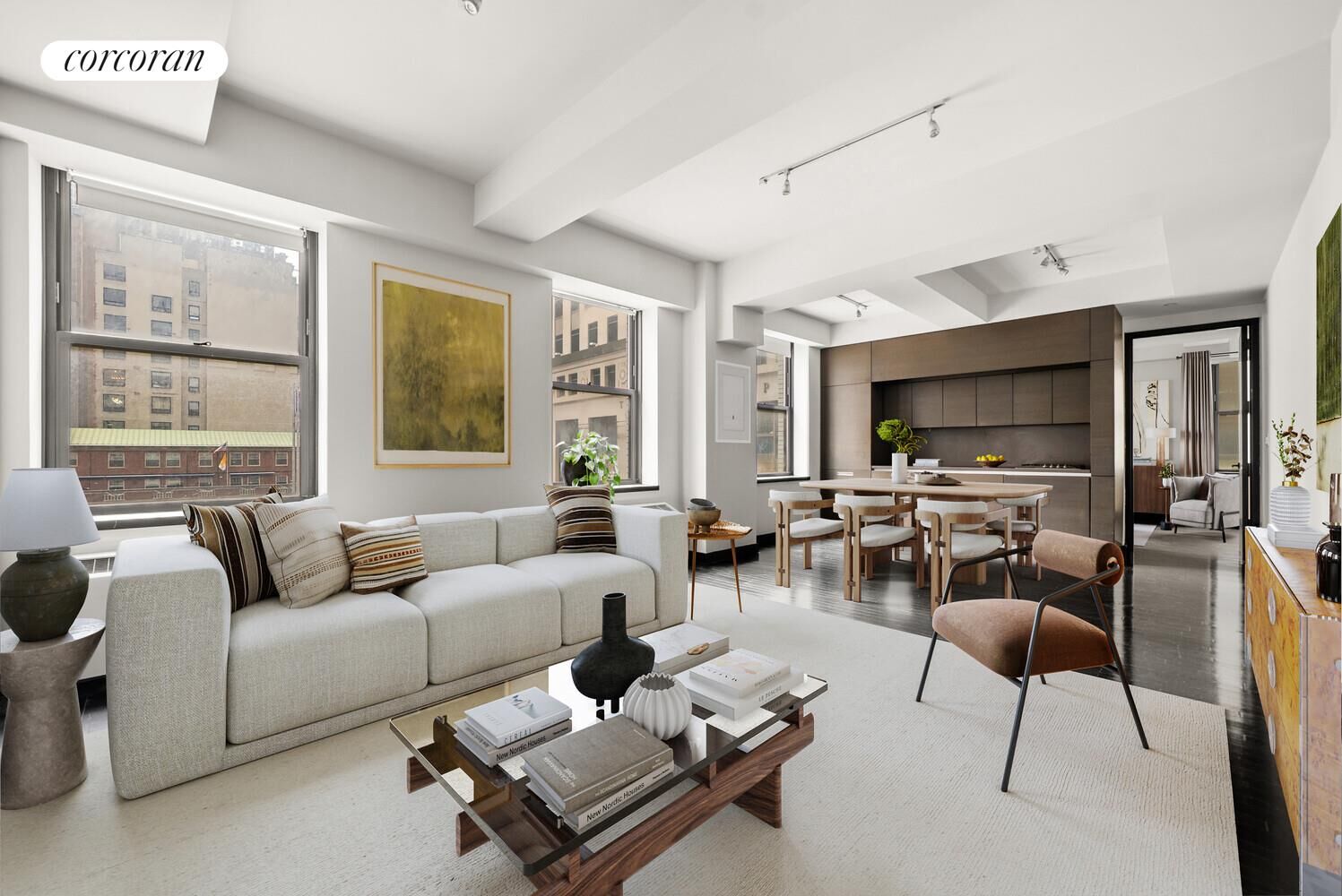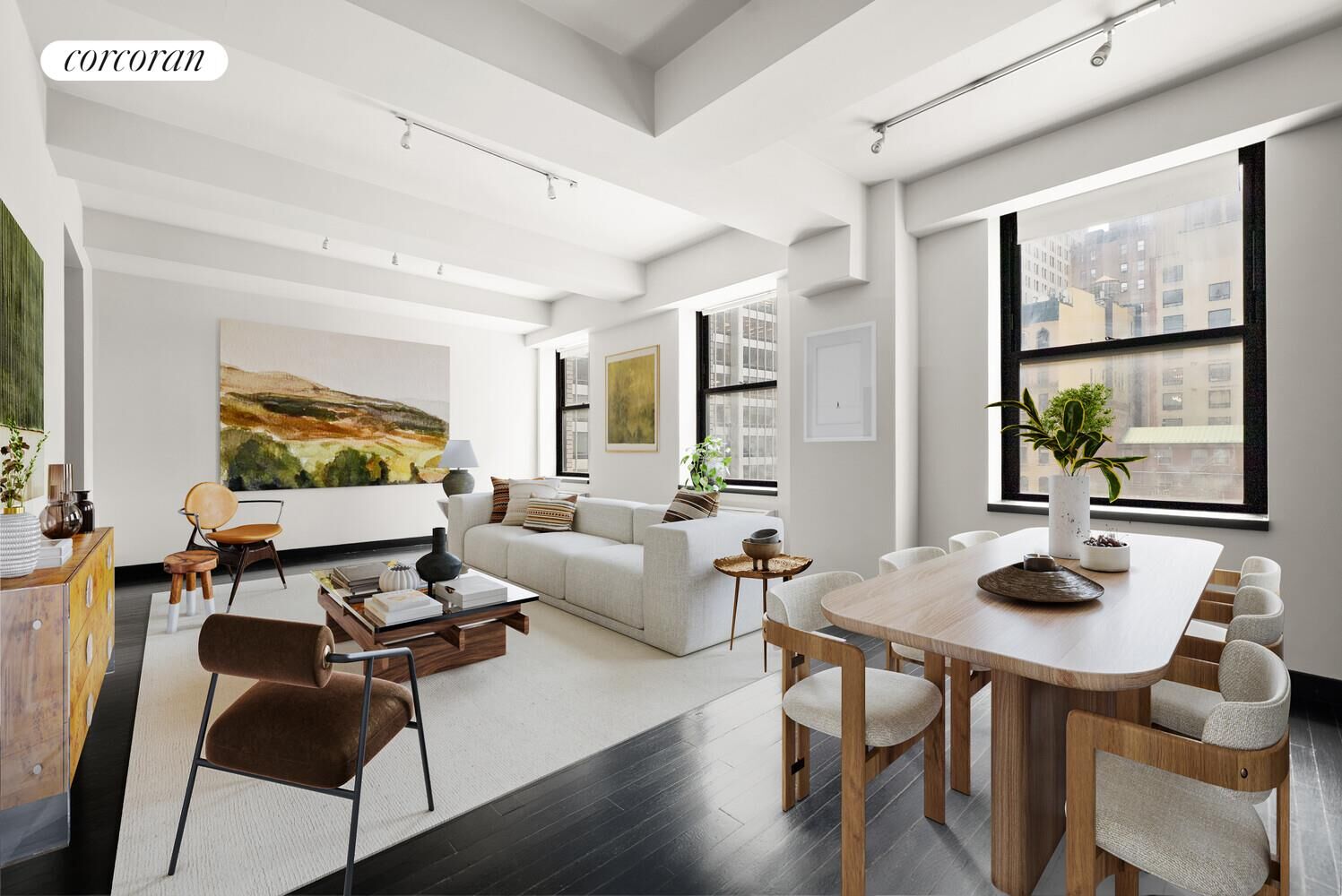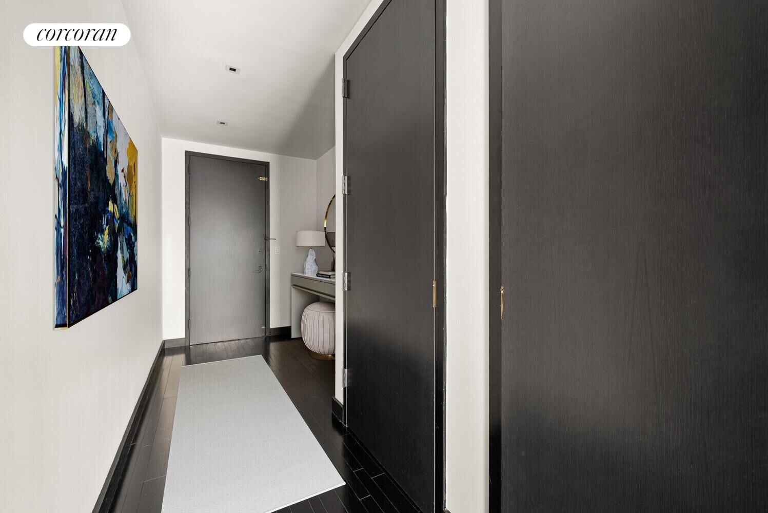 A gracious foyer opens into a grand living and dining area with corner South/East exposure, filling the home with abundant natural light and open plaza views. The oversized bedroom features a walk-in closet, while the interiors are defined by dark ebony-stained maple floors and soaring ceilings that enhance the sense of space and elegance.