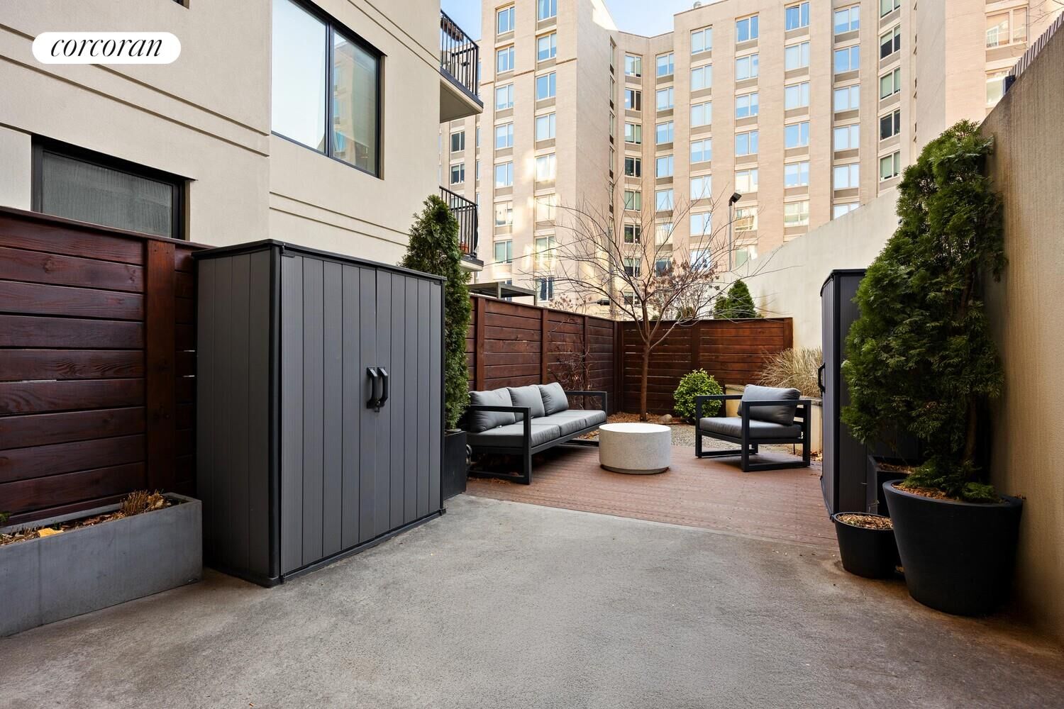 A rare offering with dual outdoor spaces, Unit 1A at 906 Bergen Street is a north- and south-facing, two-bedroom, two-bathroom residence featuring both an extra-large, landscaped private backyard with two storage sheds and a paved private front patio with high fencing, privacy screens, and multiple planters with mature trees providing greenery and coverage. Together, these outdoor spaces create exceptional indoor-outdoor living. Floor-to-ceiling windows invite brilliant natural light throughout the day, enhanced by dual exposures, while opulent details such as oversized wide-plank hardwood floors and classic hardware lend timeless character to each room.