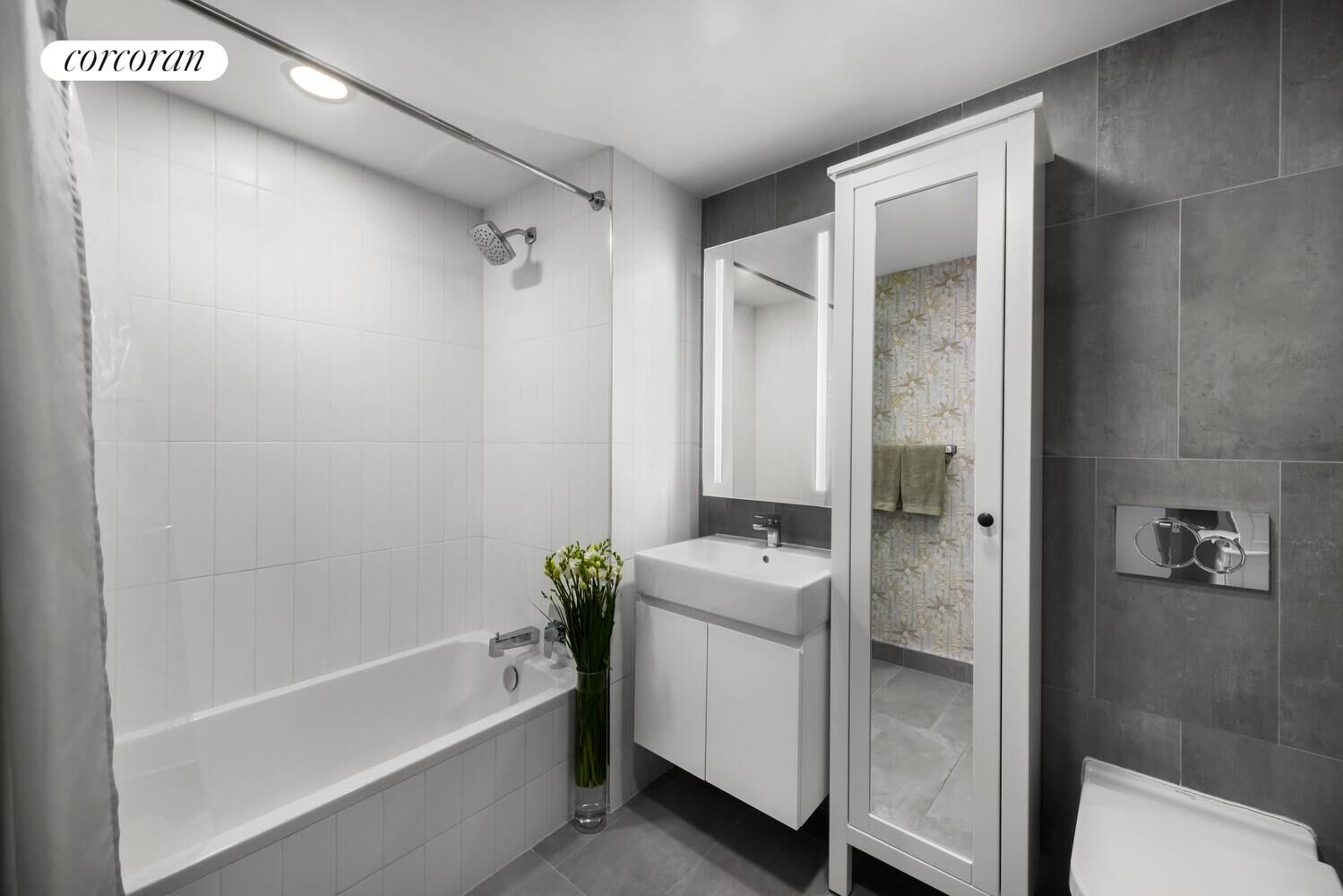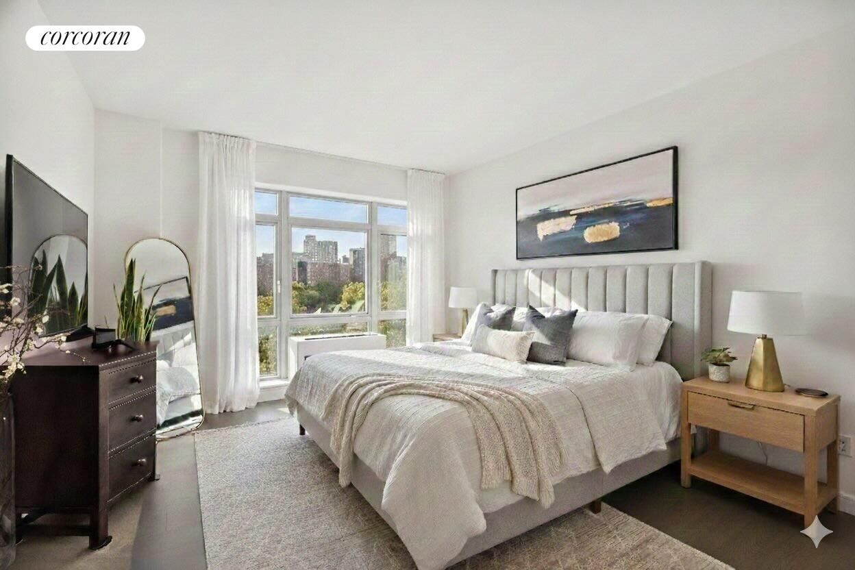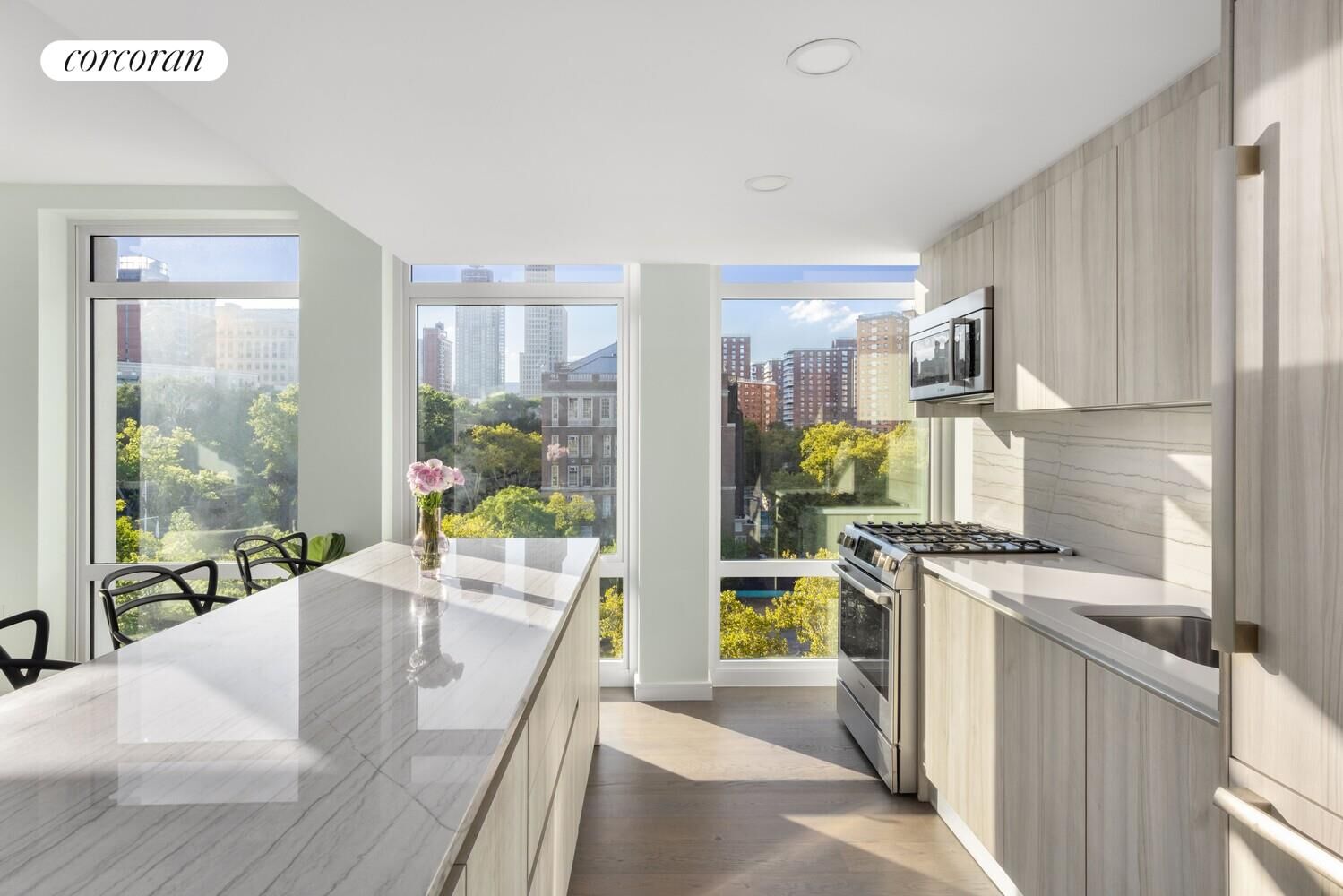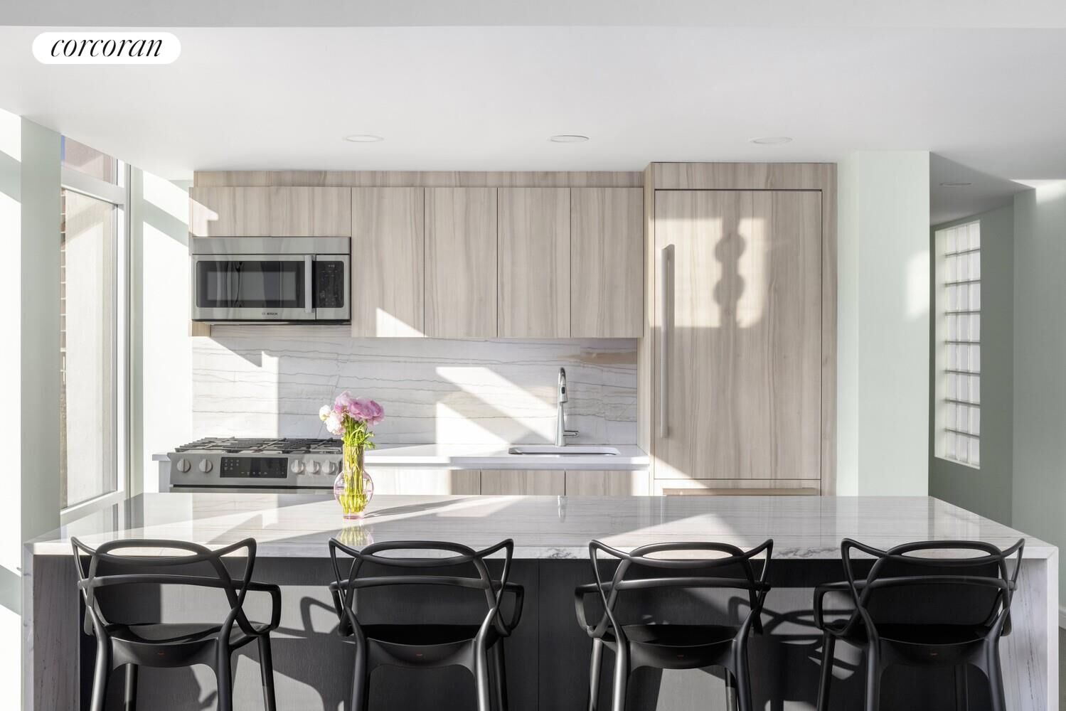 Spanning 1,660 square feet, this corner home is flooded with natural light through two full walls of oversized floor-to-ceiling windows. The open Chef's Kitchen is a masterclass in design-featuring custom Italian oak cabinetry, White Macaubas quartzite countertops, and a dramatic waterfall-edge island. Equipped with a premium integrated Bosch appliance suite.