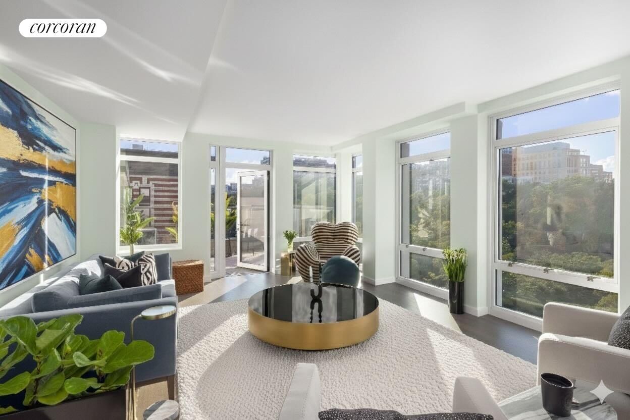 Located at 99 Morningside Avenue (371 West 123rd Street) Apt 8B is a sun-drenched sanctuary offering a seamless connection to the outdoors. The heart of this residence is a massive, south and west-facing Great Room that opens directly onto a 183-square-foot private terrace. Perched over the park canopy, this expansive outdoor retreat offers sweeping views-the ultimate setting for al fresco dining or peaceful relaxation.