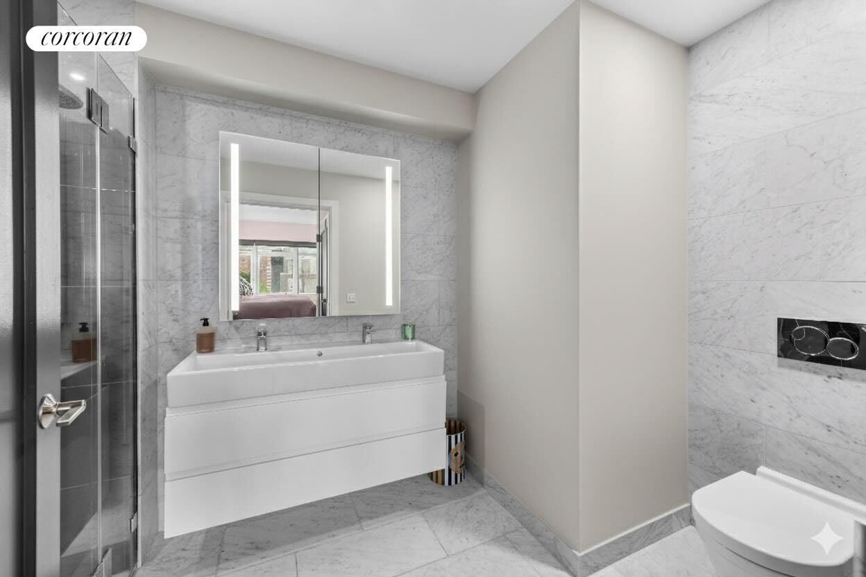 The primary suite is a secluded king-sized retreat with a windowed en-suite bath clad in White Carrara marble, a walk-in closet, and spa-like finishes. Two additional generous bedrooms (one is currently configured as a home office) feature western park views and ample closet space, supported by a refined second bath with ash-gray porcelain and classic subway tile.