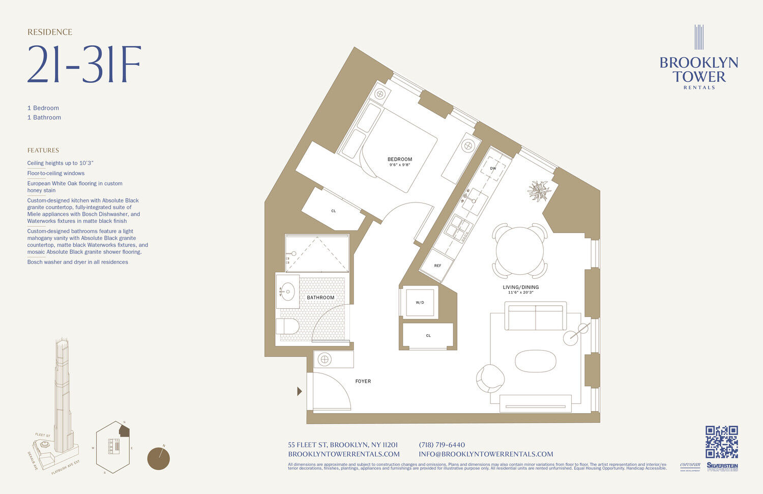 Rental residence 21Fis an extraordinary one-bedroom layout featuring 10' lofty ceilings and full height windows which flank the open space offering unparalleled Eastern exposures of the Brooklyn landscape and Fort Greene Park. European white oak flooring in custom honey stain aline the residence creating and indulgent warmth.