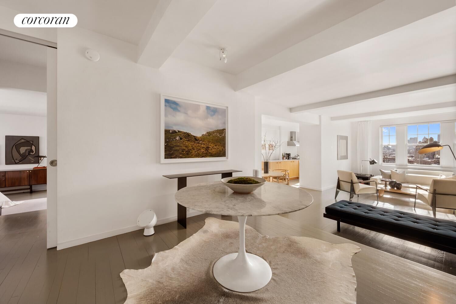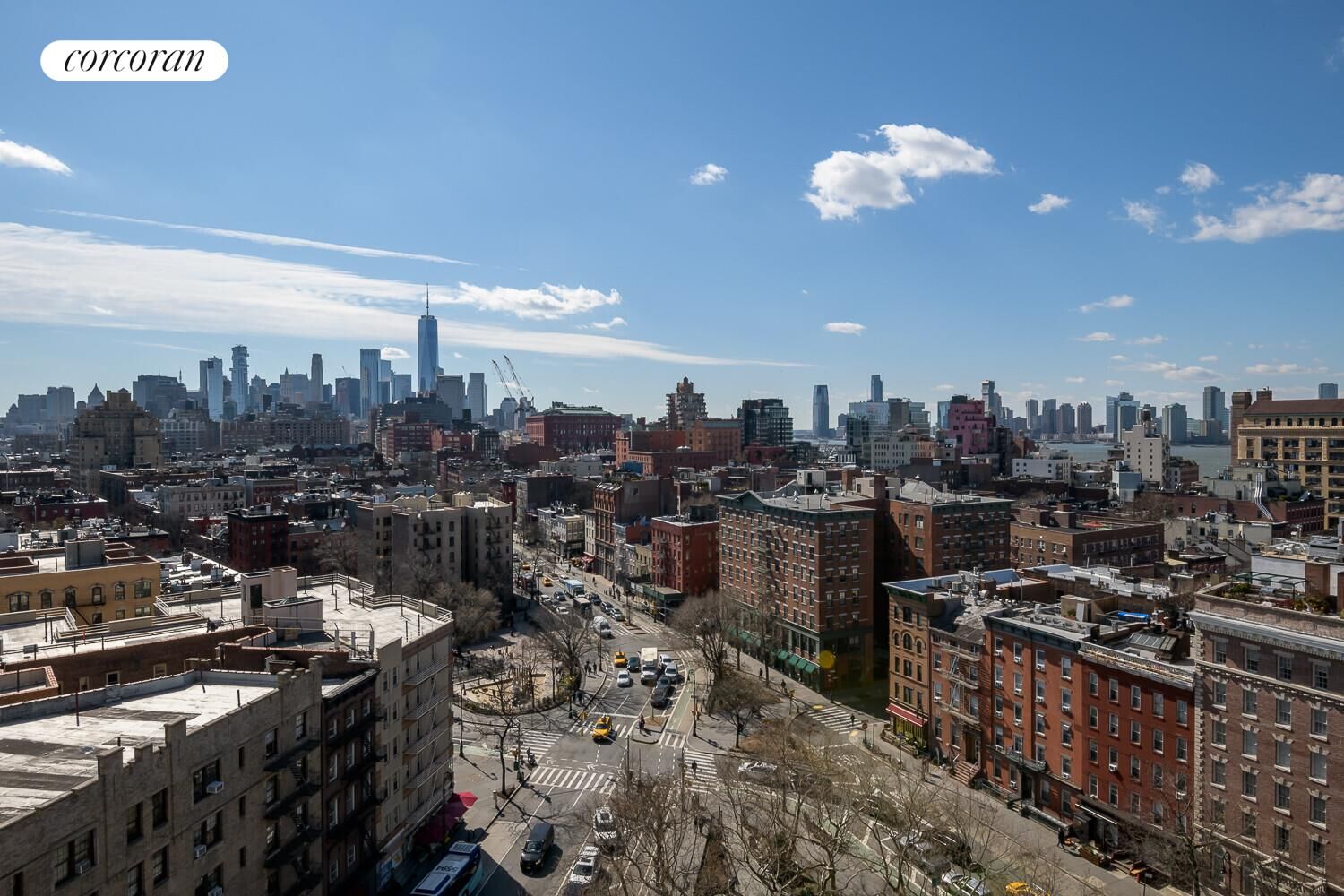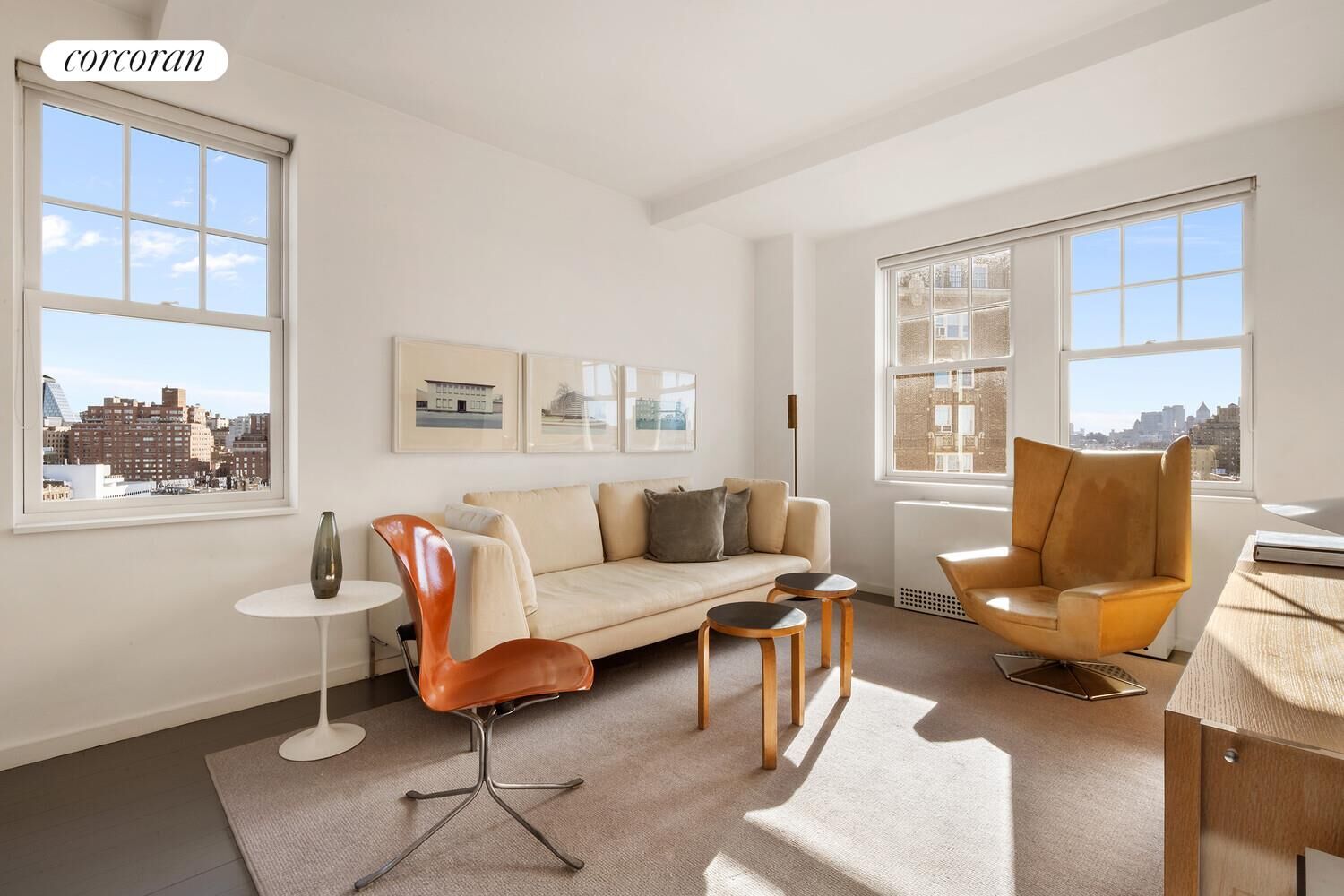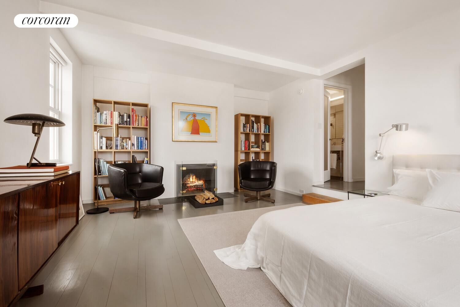 Immediately upon entering the apartment, you are wowed by marvelously expansive views south across all of downtown New York City through a wall of windows. The sunrise and sunsets throughout the apartment are mesmerizing. A very spacious entry foyer has been cleverly expanded and opens to the living room with a wood-burning fireplace. An adjacent space off the living room has been carved out to create a comfortable dining area with easy access to the handsomely outfitted windowed kitchen tucked neatly beyond. The second bedroom has been stylishly opened with a sliding door to create an inviting corner den with a full windowed bath and a sizable storage closet. At the opposite end of the apartment, the impressive corner primary bedroom suite offers an eye-catching sweep of views to the north and east including the Empire State Building. This delightfully vast bedroom suite is punctuated by a wood-burning fireplace with separate sitting area, a generously proportioned tiled bathroom with stall shower and newly outfitted custom windowed closet and dressing area. The apartment includes a separate storage space within the building.