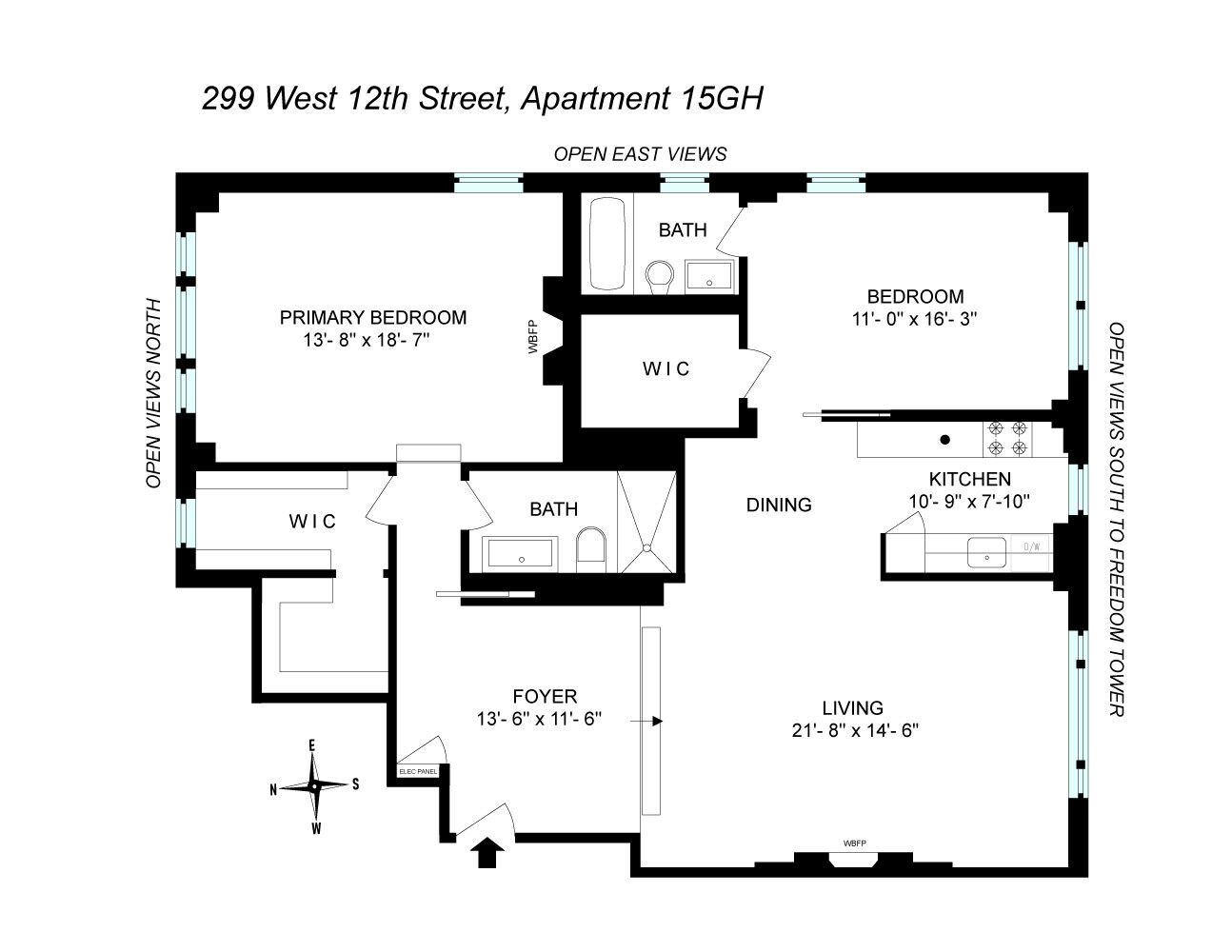 Floating high above the West Village and wrapping two corners, this mint condition 2 bedroom and 2 bathroom Prewar Bing & Bing Condominium apartment offers extraordinary open views south, east and north including the Freedom Tower and Empire State Building. As part of a complete renovation, this split 2 bedroom condo includes a new windowed kitchen, new bathrooms, all new Marvin windows, new air-conditioning and two wood-burning fireplaces - one in the living room and one in the primary bedroom. Rarely does the opportunity to acquire such an attractive and well-designed high floor apartment in one of the coveted Bing & Bing's come to market.