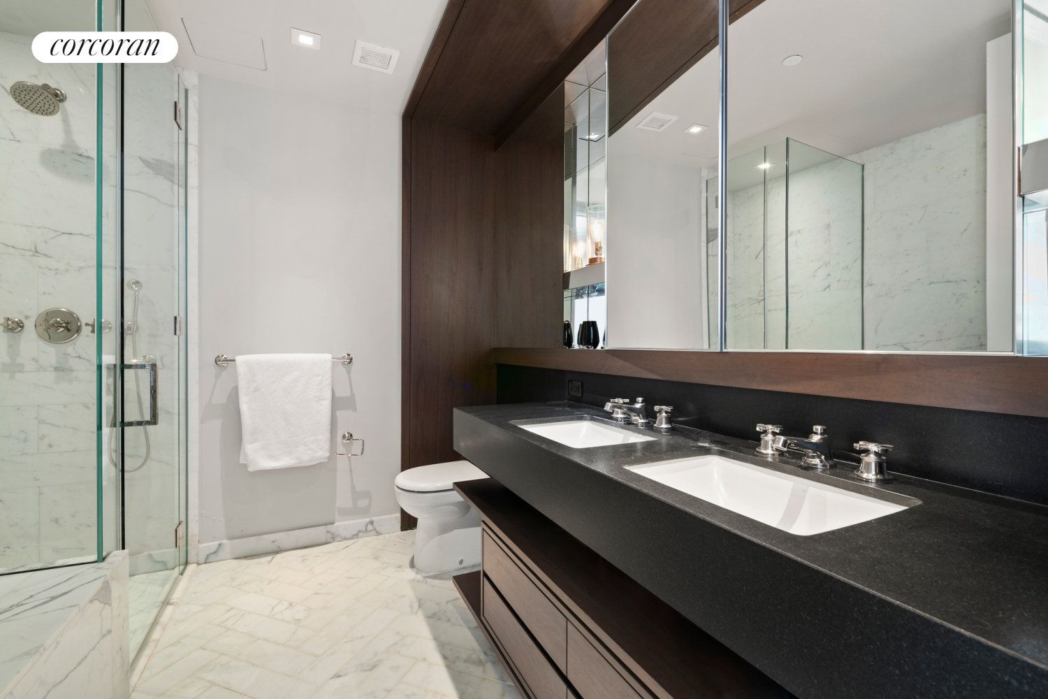 The primary suite is a serene retreat with ample closet space and a spa-like bathroom designed by Transit, featuring a deep soaking tub and herringbone statuary marble. The second bedroom is equally well-appointed, offering its own en-suite bath with Waterworks fixtures, a soaking tub, and herringbone marble flooring.