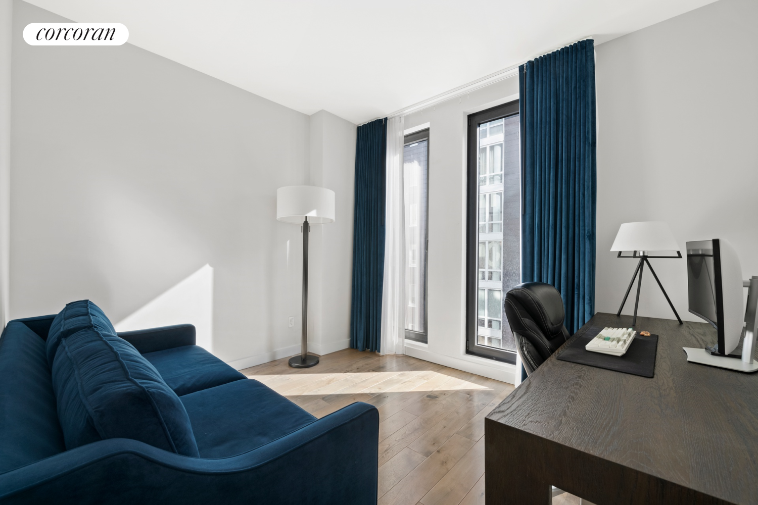 This beautifully designed two-bedroom, two-and-a-half-bath residence offers 1,073 square feet of pristine, move-in-ready living space. An entire wall of oversized eight-foot windows fills the home with exceptional natural light, highlighting the wide-plank walnut floors throughout.