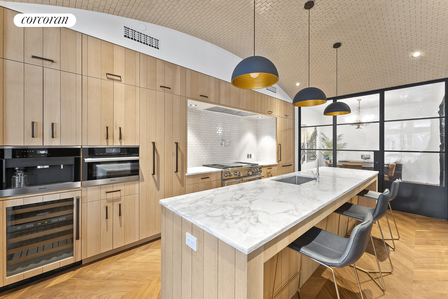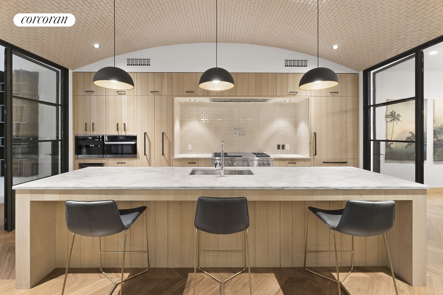 The voluminous living space extends into an exquisite kitchen, bounded by hand-blown glass doors and adorned with a honed marble island in its center, perfect for socializing. Arched ceilings with Spanish crackle-glazed subway tile accentuate a gorgeous room, functionally uncompromising with its full suite of the finest quality appliances; including double Miele dishwashers, speed oven and coffee station, industrial sized Wolf stove and a Sub-Zero refrigerator. The sophisticated adjacent dining area elevating this thoughtful layout.