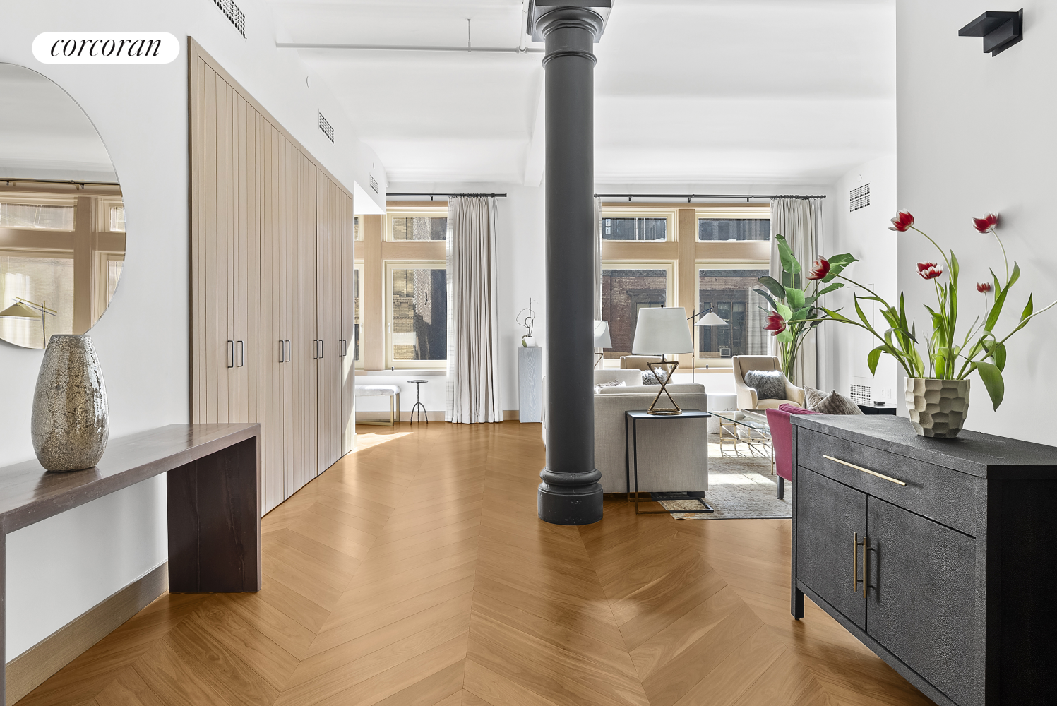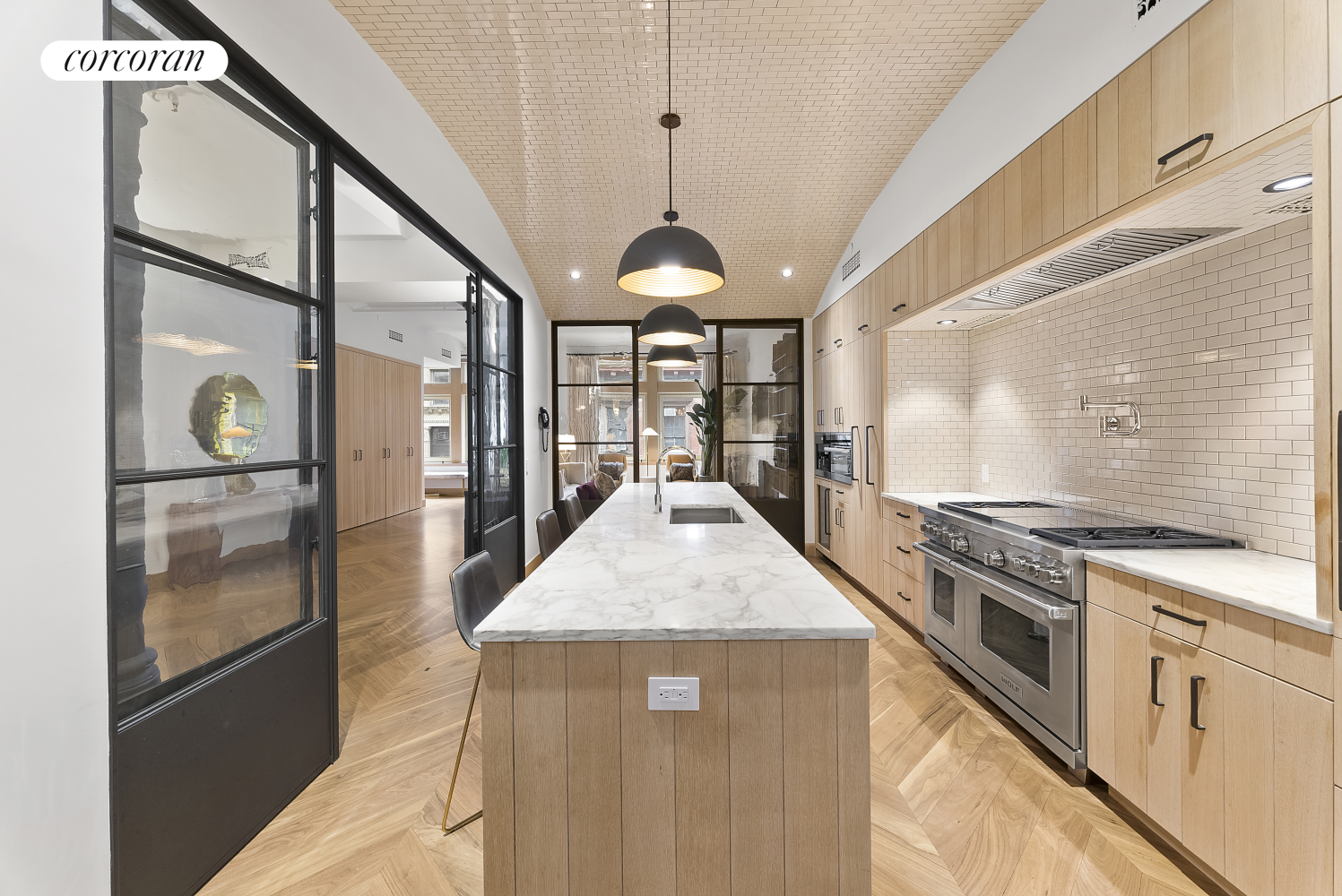 Maximizing every inch of its 3,028 square feet, and entered through a private key locked elevator, this home is an immediate showstopper; its great room replete with soaring barrel-vaulted ceilings, a wood-burning fireplace, original cast iron columns, oversized oak-framed windows to maximize the southern light over charming East 12th Street, and chevron walnut floors.