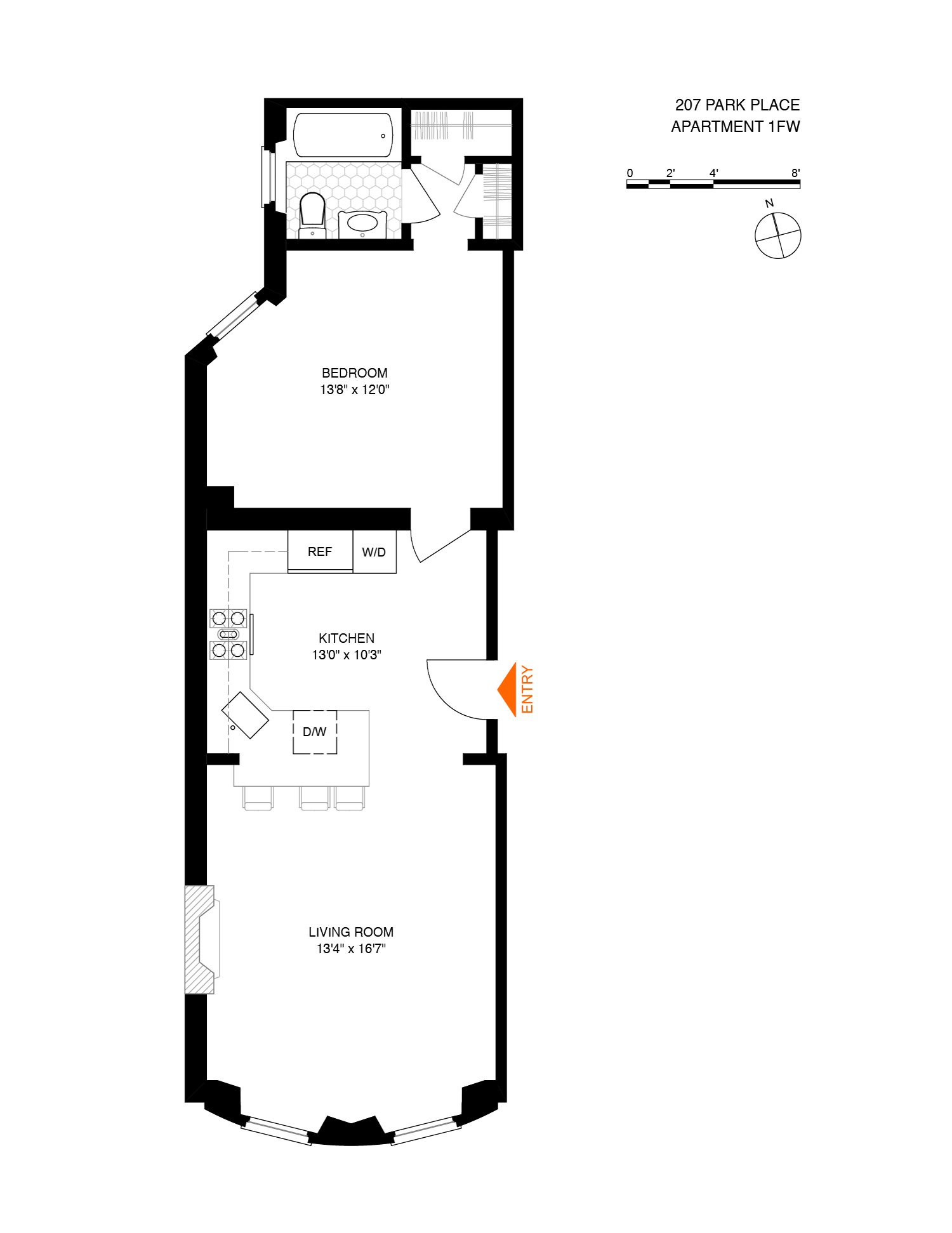 This Prospect Heights one-bedroom delivers plenty of early 20th century charm, with its fetching original wooden door and window frames, its gorgeous mirrored mantel and its classic black-and-white tiled bathroom, with Art Deco-era tub.