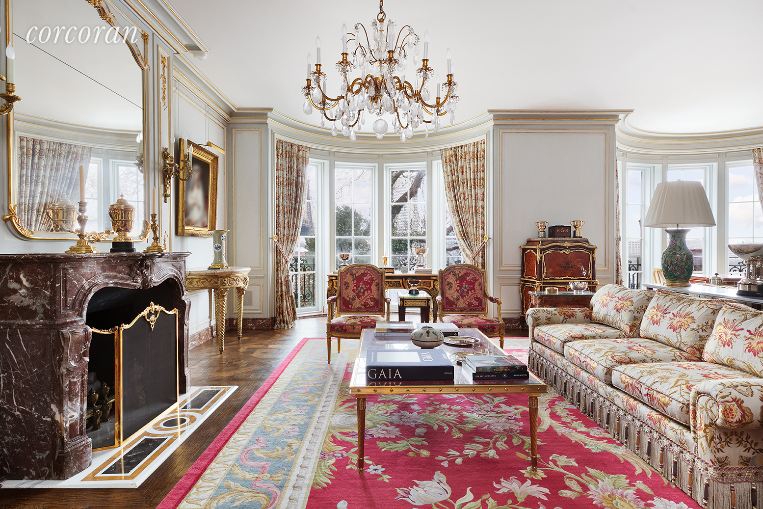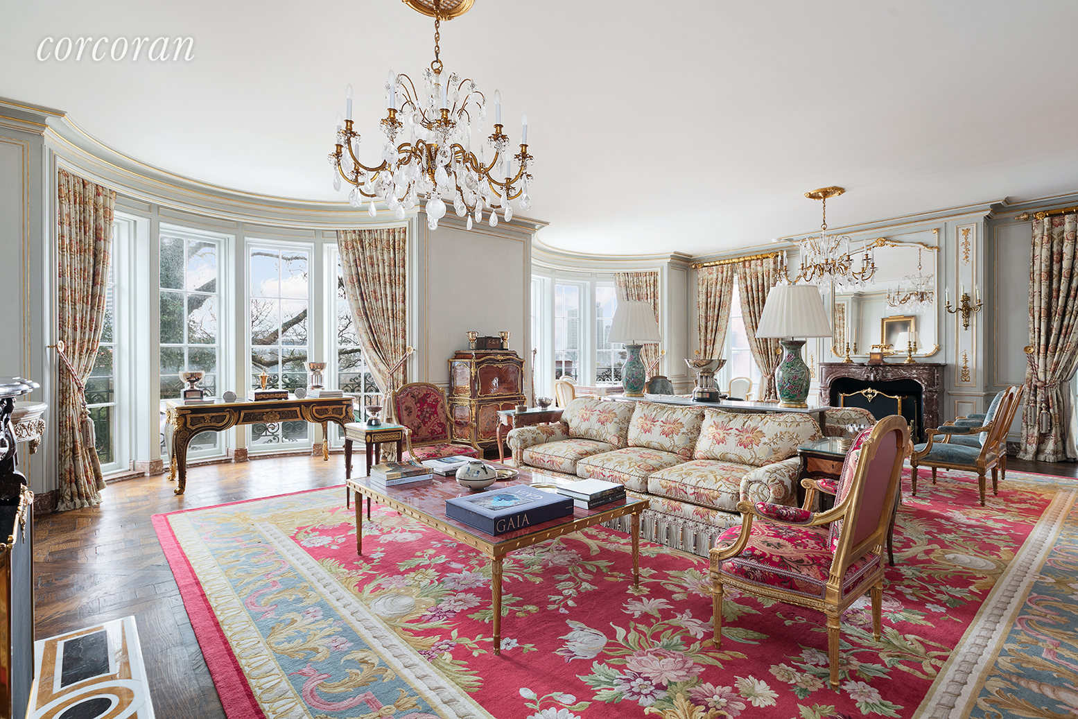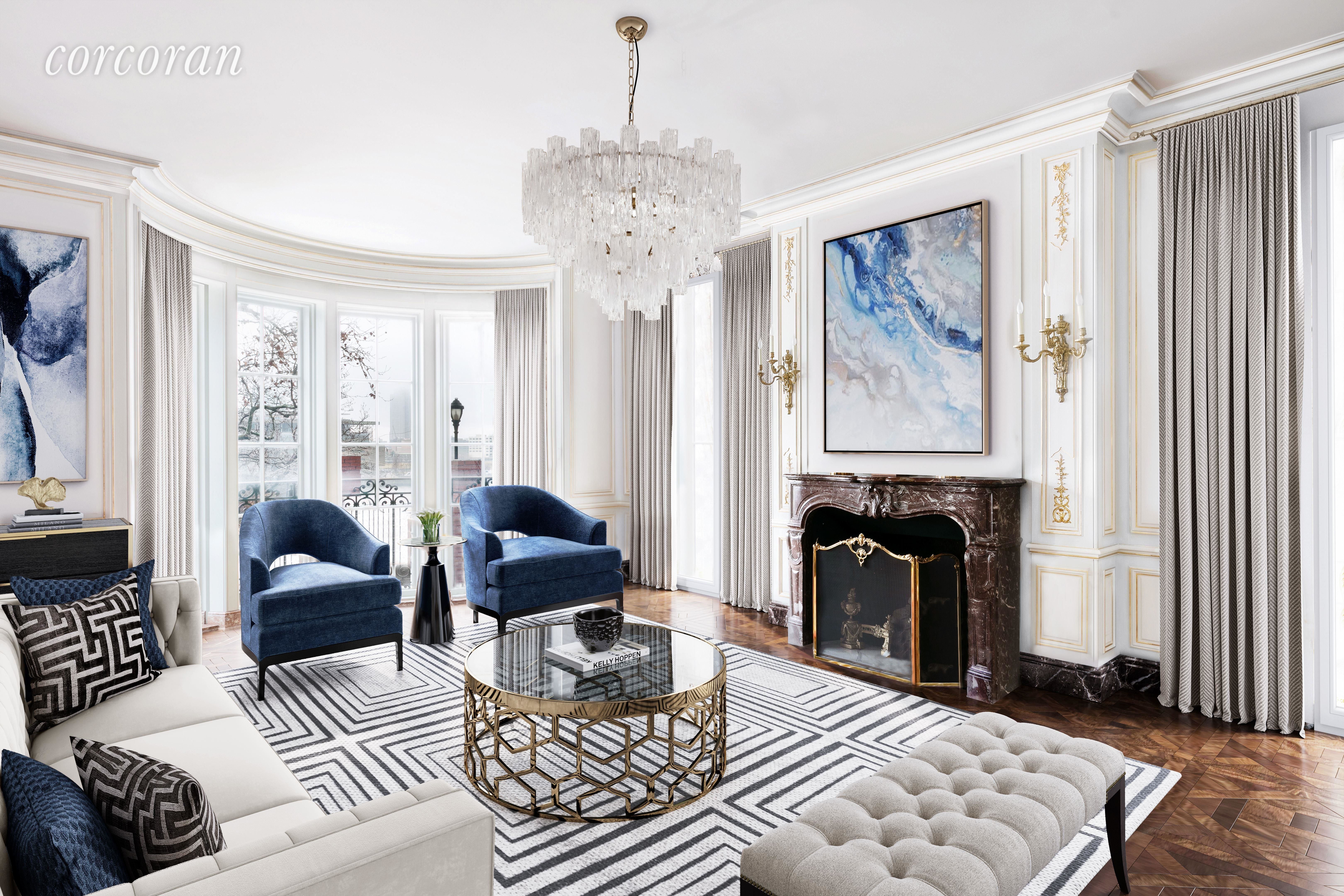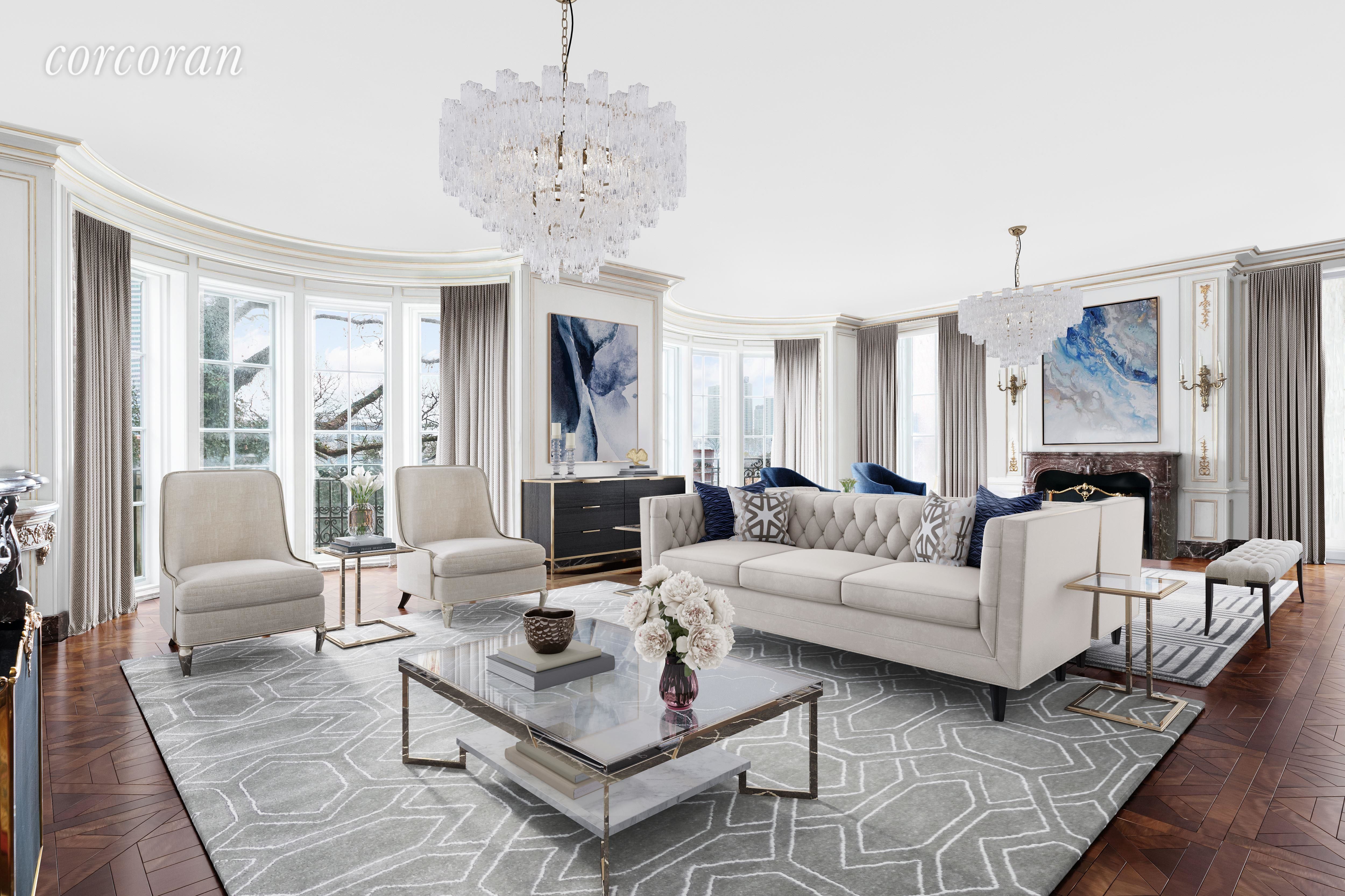 London in New York! Pass through the stately front doors and into the unparalleled grandeur that is 7 Sutton Square. This extraordinary residence stands in singular magnificence and represents a rare treasure in Manhattan - a 33 foot wide home that enjoys spectacular river views, a gated driveway, and a lush private garden.In mint condition, the mansion offers the ultimate in discretion and luxurious living. Designed by renowned interior designer Juan Pablo Molyneaux, only the highest quality of finishes and appointments were handpicked for the glorious interior that dwell beyond the refined, Georgian-style facade. The classic residential design features double-height entry foyer, filigreed spiraling staircase culminating in an exquisite glass rotunda, an elevator, a great room with parquet de Versailles wood floors, a formal dining room with terrace, a china room, and breakfast kitchen that connects to the commercial grade kitchen and staff facilities below. On the second floor is distinguished oak paneled double library with river views and wood burning fireplace, and two bedrooms both with baths en-suite. The master suite occupies the full third floor consisting of a double-width sleeping chamber with river and garden views plus a wood burning fireplace. En-suite, the elegant onyx master bathroom has a shower stall, tub, enclosed water closet and double sink. A study with terrace and an enormous dressing room follow.On the top floor is a bar with sink, powder room, and a roof terrace with breathtaking views. Below the main floor is a sauna, a gymnasium, and staff room with bath, The kitchen is a true chef's kitchen with salamander broiler, rotisserie, and a double commercial oven and stove. There are two walk-in refrigerator/freezers, a staff lounge, two powder rooms and laundry room.*Bottom left photo: current living room. Bottom right: virtual rendering of an alternate style living room.