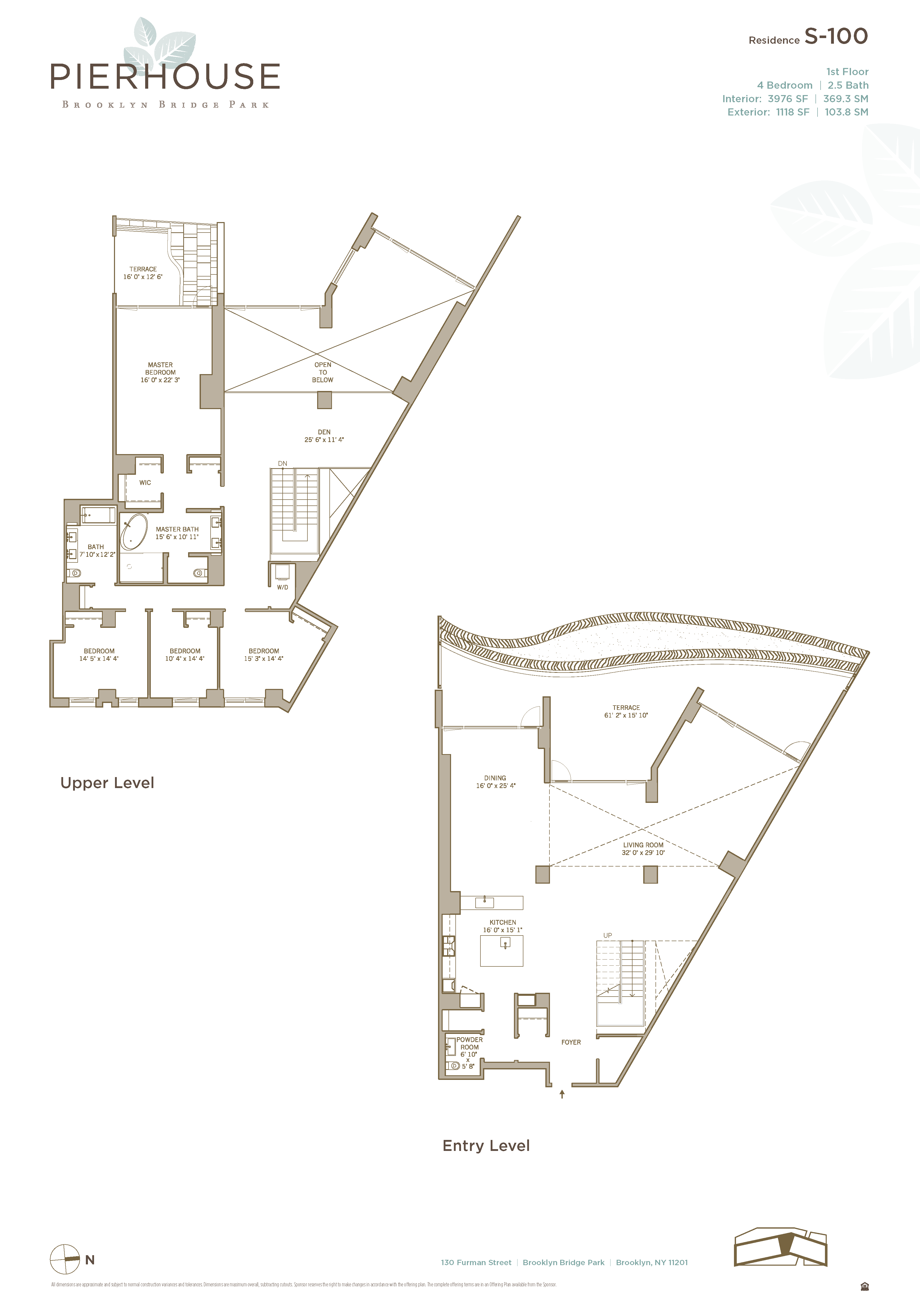 IMMEDIATE OCCUPANCY. Unit S100 is a huge and super wide loft-like space with one of the largest outdoor spaces in the building, 4 bedrooms, and views from both floors. This is a space that needs to be seen to be believed! Closings have begun in both buildings. Live in the center of Brooklyns world-class waterfront park with unrivaled views and the finest luxury living and recreational amenities right outside your doorstep. Corcoran has now partnered with Toll Brothers City Living to sell the remaining units at Pierhouse, a mix of 1 to 5 bedroom duplex homes, all with private outdoor spaces, iconic and protected views, expansive living spaces, and luxurious finishes sustainably designed by Marvel Architects. Comprised of two buildings and a total of 106 units, the project is now 80% sold out. Only the finest materials have been used throughout and feature solid custom walnut cabinetry, Gaggenau appliances, thick Calacatta Tucci marble slab counters and islands, reclaimed heartwood pine floors, and energy-efficient solar shades in every room. Spa bathrooms feature Waterworks fixtures, Ruscello Fosso Picollo marble floors, and walnut and brushed nickel vanities. These homes are ready to be moved into, and ready to amaze you and your guests alike. You will have a front row seat to the sunsets every evening, and 24-hour access to running and bike paths, dog parks, cultural events, a marina, a farmers market, and world-renowned restaurants, shopping and art galleries right outside your door. Residents will have access to countless amenities, including two 24-hour attended lobbies, valet parking, two fitness centers, a meditation studio, a resident event space, pet-wash, refrigerated storage, play room, and bike storage. Electric car charging station will be available in the Pierhouse garage for residents use. In addition, residents can also utilize the amenities of the adjoining 1 Hotel Brooklyn Bridge, which includes a farm-to-table restaurant, a world class spa, and a rooftop pool and bar. Private rooftops and terraces will all be designed and maintained by Michael Van Valkenburgh Associates, freeing up residents to just relax and enjoy the views and amenities of Brooklyns most exciting waterfront location. Commuting to Wall Street and Midtown is easy via multiple subway lines, or the East River Ferry. Email us at Pierhouse@corcoran.com or call 718-765-3805 to schedule a viewing.