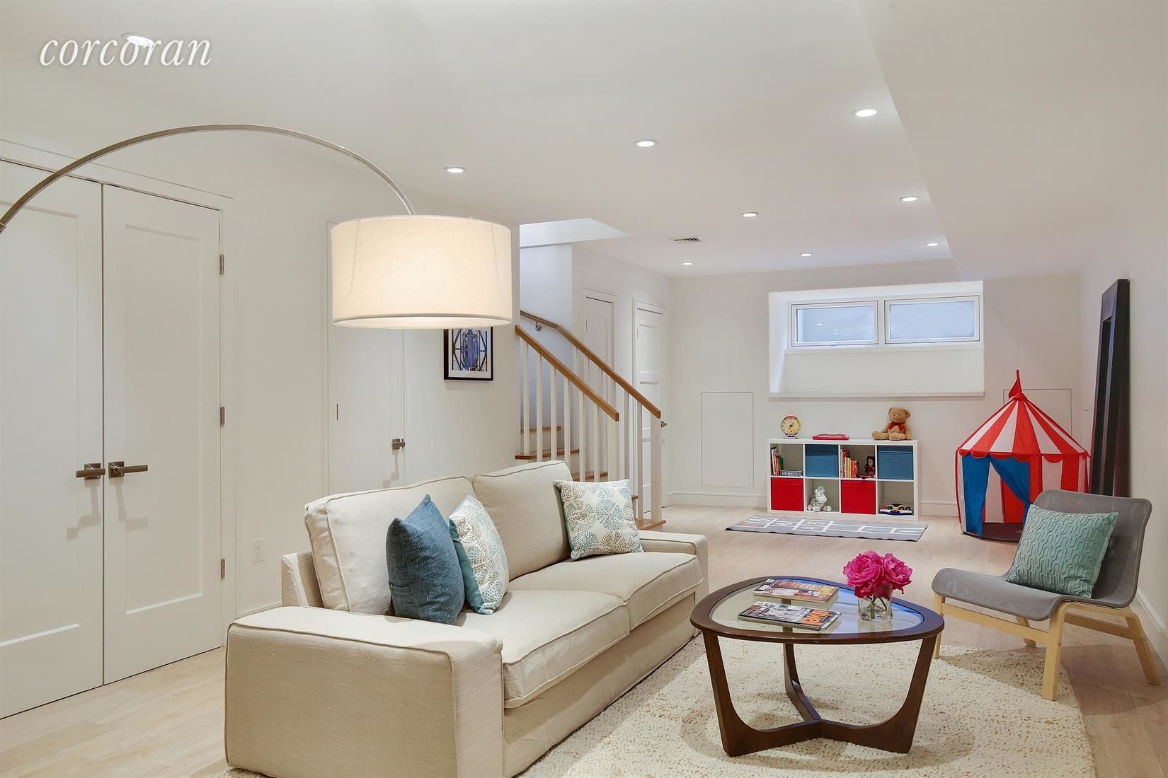 Down the open stairway is the spacious finished recreation/family room, complete with wood laminate floors, a lovely half bath, and closets and storage galore. A large light well illuminates the space.