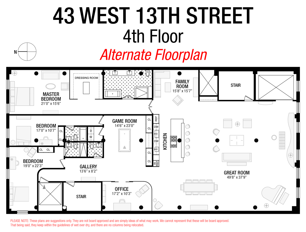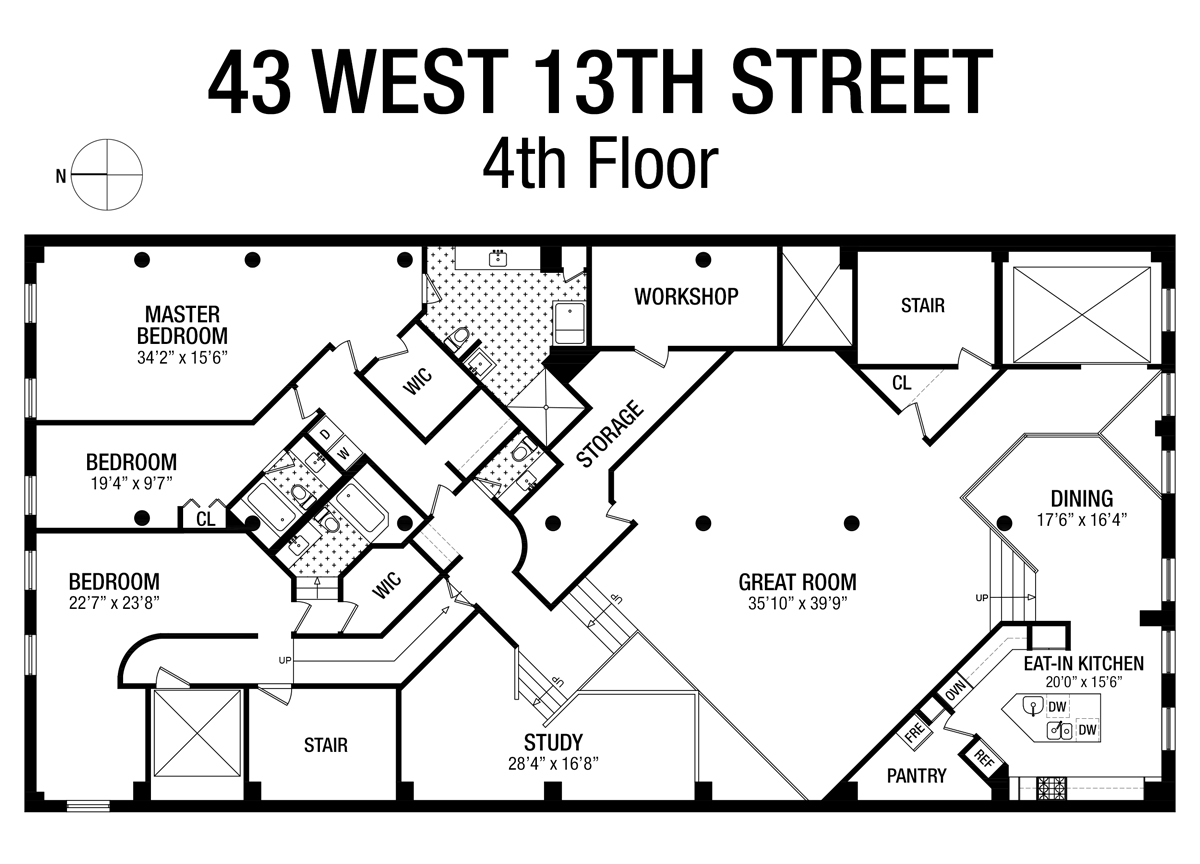 Extraordinary Value at Approximately $1,000 Per Square Foot! Unique and expansive floor-through loft home in a coveted Greenwich Village location only two blocks from Union Square. Comprising an entire floor with nearly 5,000 square feet and 14 ceilings, this rarely available apartment offers extraordinary scale with endless layout possibilities (up to 5 bedrooms) to suit the new owner. Although the apartment is move-in ready, the space is an extremely flexible canvas and presents an extraordinary opportunity to create your dream home according to personal needs with many configuration and design options. The current configuration of the loft was reimagined and designed to maximize the utility of this massive space, as well as the light and storage. The apartment currently features three, bedroom suites including an incredibly spacious master suite, 3.5 bathrooms and a dramatic great room with multiple entertaining and living spaces including a library, den/media area, formal dining space and huge eat-in kitchen. Special features include new central air conditioning, two key elevator entrances, exposed beam ceilings, exposed brick, hardwood floors, artfully conceived and constructed mezzanine levels, laundry, stainless appliances and an extraordinary amount of storage space throughout. The over-sized master bathroom was recently renovated with beautiful finishes including herringbone marble floors, a double spa-walk in shower and towel warmer. Enormous windows line both the southern and northern exposures drawing in beautiful natural light. Five windows expose the great room and formal areas to a wonderful and vibrant tree-lined block and the north facing bedroom windows overlook brownstone gardens with a corner third bedroom providing an additional west-facing view. Artwork on walls by Paddy Cohn