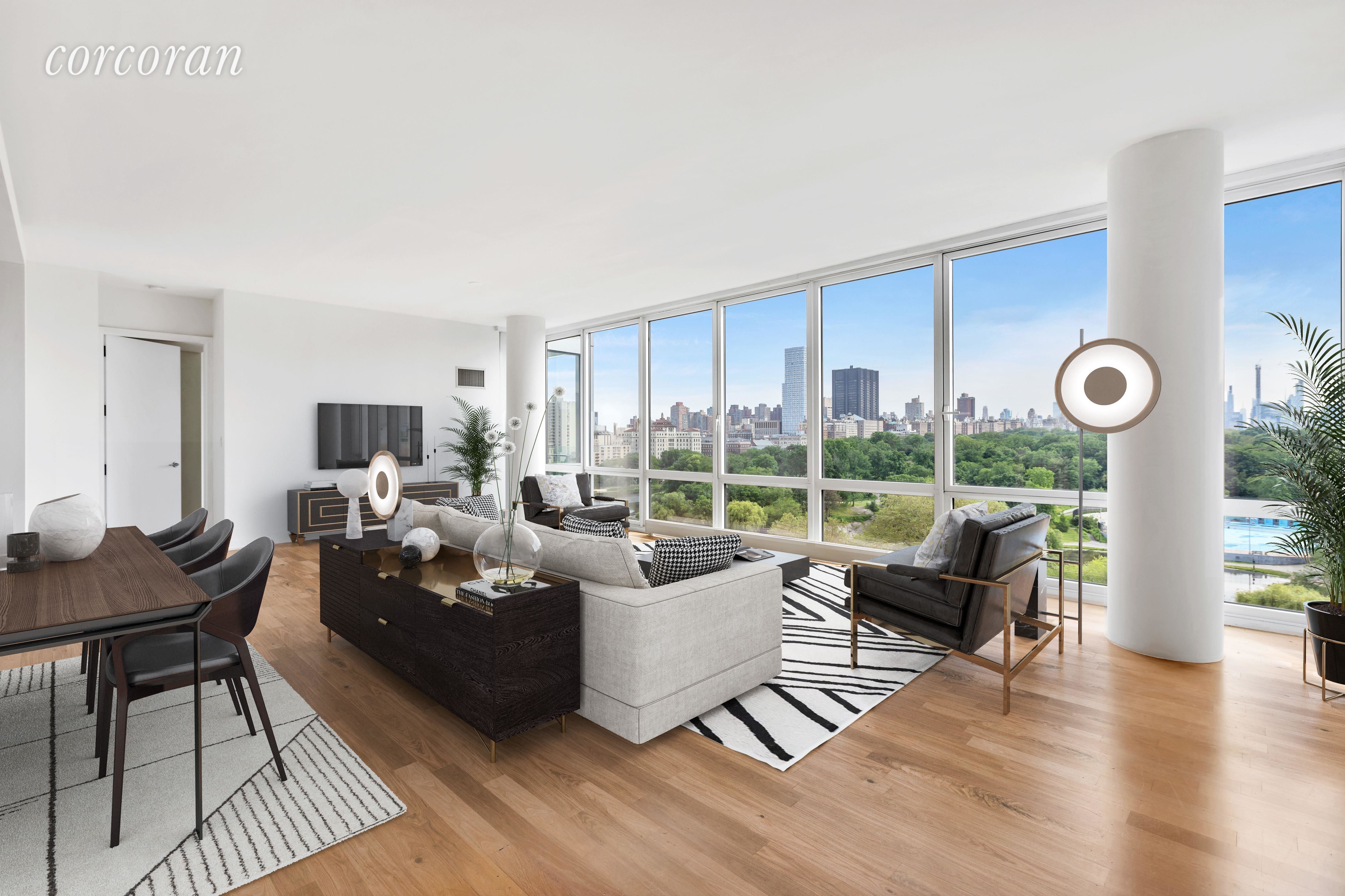 Entering this bright split two bedroom and two and a half bathroom residence, Central Park views through the floor-to-ceiing windows become the immediate focal point. All rooms (except the bathrooms) face South over Central Park with the Central Park South and Billionaire Rows skyline at the horizon. The apartment has Oak hardwood floors throughout. A unique 48 SF balcony can be entered through the master bathroom. Off the sun-flooded living room is the kitchen with a Statuary Marble countertop, Wenge cabinets, and all Viking appliances, such as dishwasher, oven range, fridge and microwave.The bright master bedroom has a walk-in closet and the ensuite master bathroom features a Calcutta marble vanity top, double sink, shower and full soaking bathtub. The washer/dryer is off the powder room. 111 Central Park North Condominium features 24/7 doorman, concierge, live-in super, second floor common roof deck, gym, party/play room and cold storage. With only 43 units, the building has a boutique feel to it. It is ideally located. Central Park is just across the street. The 2/3 train entrance is right there at the corner of Central Park North and Lenox. The 5th Avenue and Madison Avenue bus stops are in front of the building. The location is 15/20 minutes to Times Square and Lincoln Center. Lasker Rink (and Pool), the Dana Discovery Center, St John the Divine, Museum Mile, and the Conservatory Garden are in close proximity as are George Washington Bridge, Triborough Bridge, and all roads to New Jersey, Connecticut, and Upstate New York which allows for a quick escape out of Manhattan. Parking Spot included. Pets are allowed.