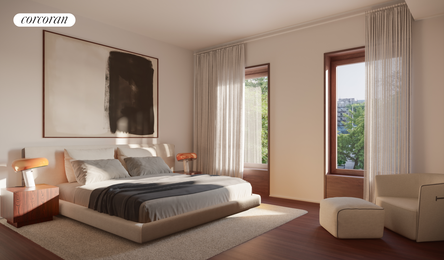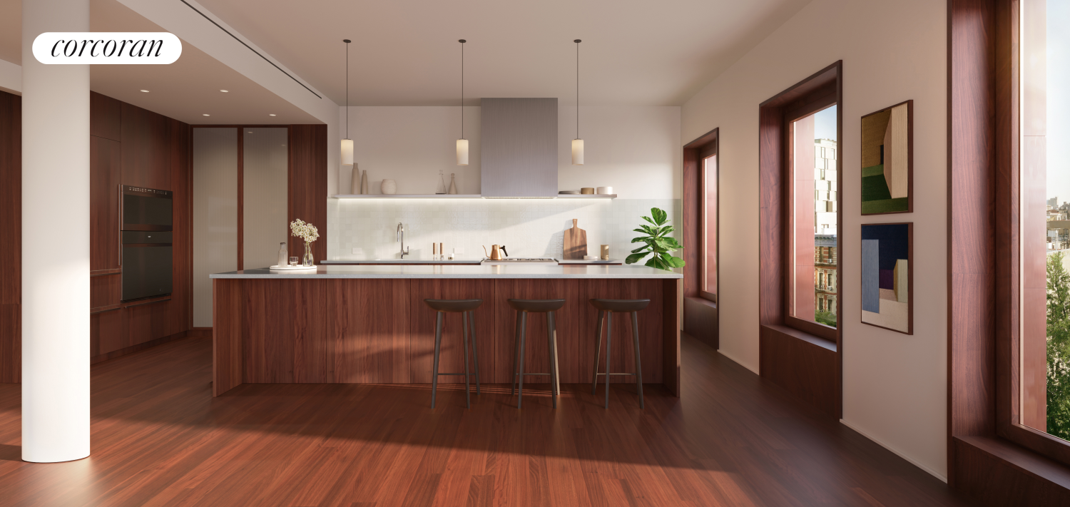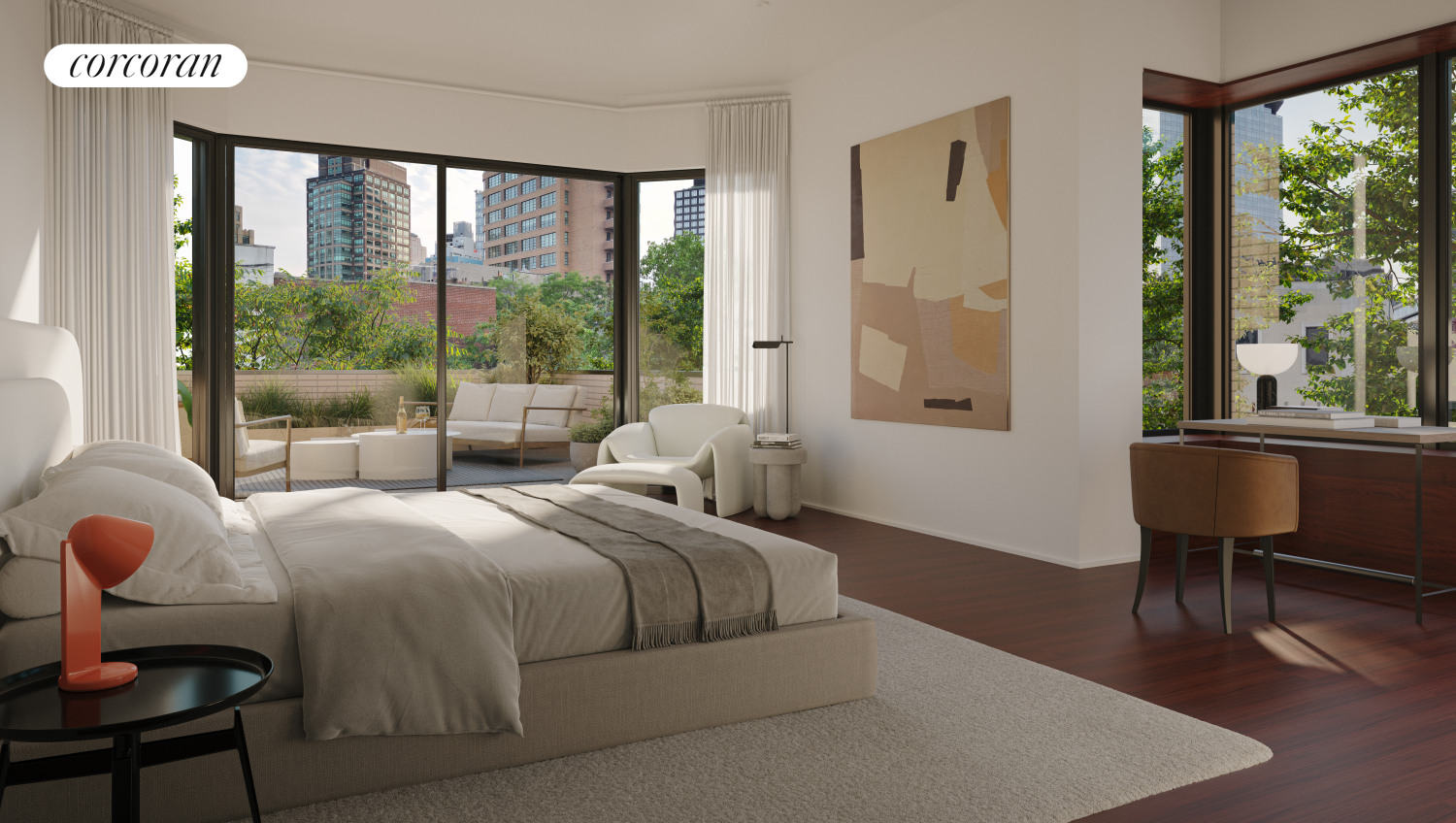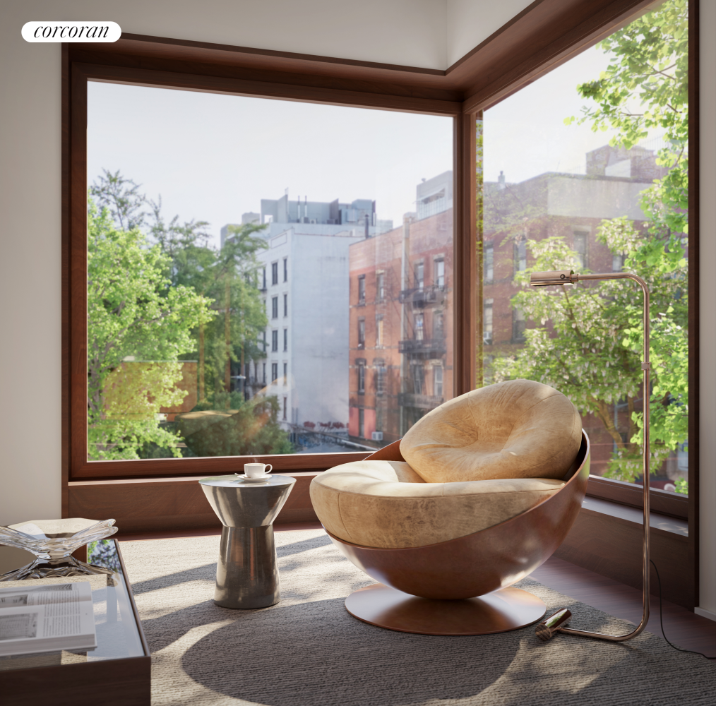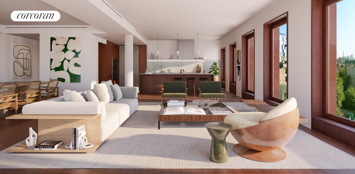 Residence 5 is a one-of-a-kind full-floor 4 Bedroom home with incredible light and panoramic city views. The spacious 3,323 Sq. Ft. layout features an enormous corner great room with large eat-in kitchen and center island, including mahogany cabinetry, luxury appliances, and unique lavastone countertops. The home is lined with oversized wood-framed windows that look out across a tree-filled pocket park with open skies above and the midtown skyline beyond.