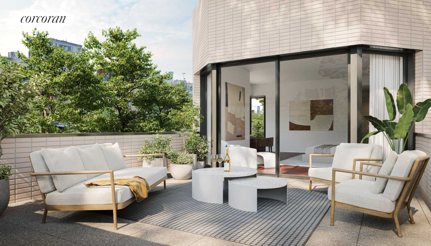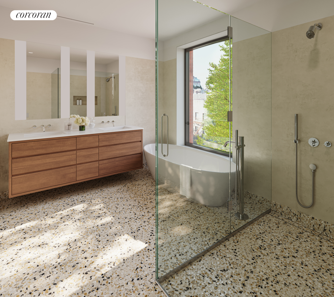 The primary bedroom suite includes a millwork-lined dressing room offering a world of closet space, and creating supreme privacy. Soaked in natural light, the 5-fixture primary bath features a freestanding tub, while the walls and floors of the bath are clad in limestone and terrazzo with natural airy tones. The south-facing primary bedroom enjoys a beautiful bay window and steps out directly onto a 157 Sq. Ft. private terrace, giving this home the ultimate private retreat.